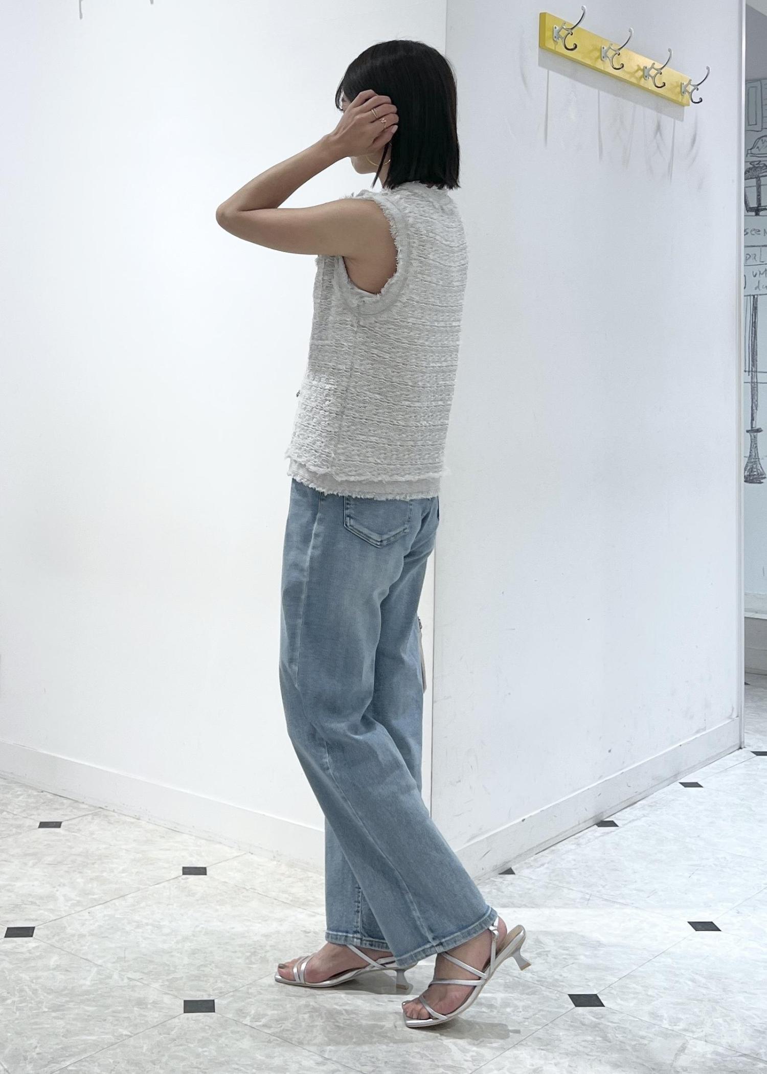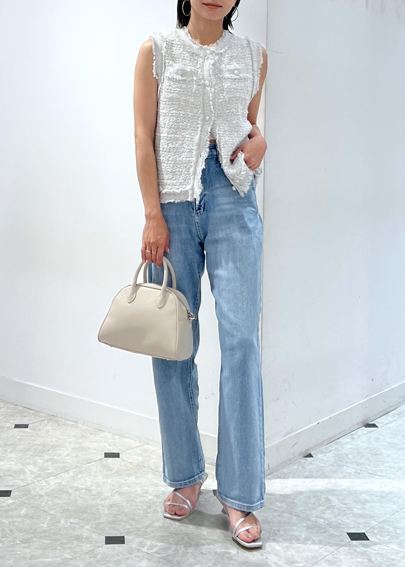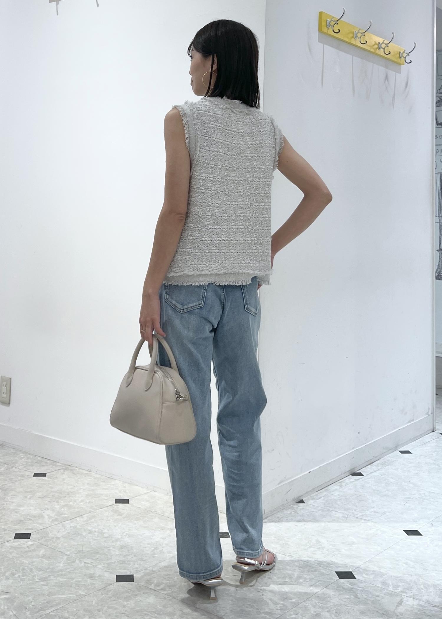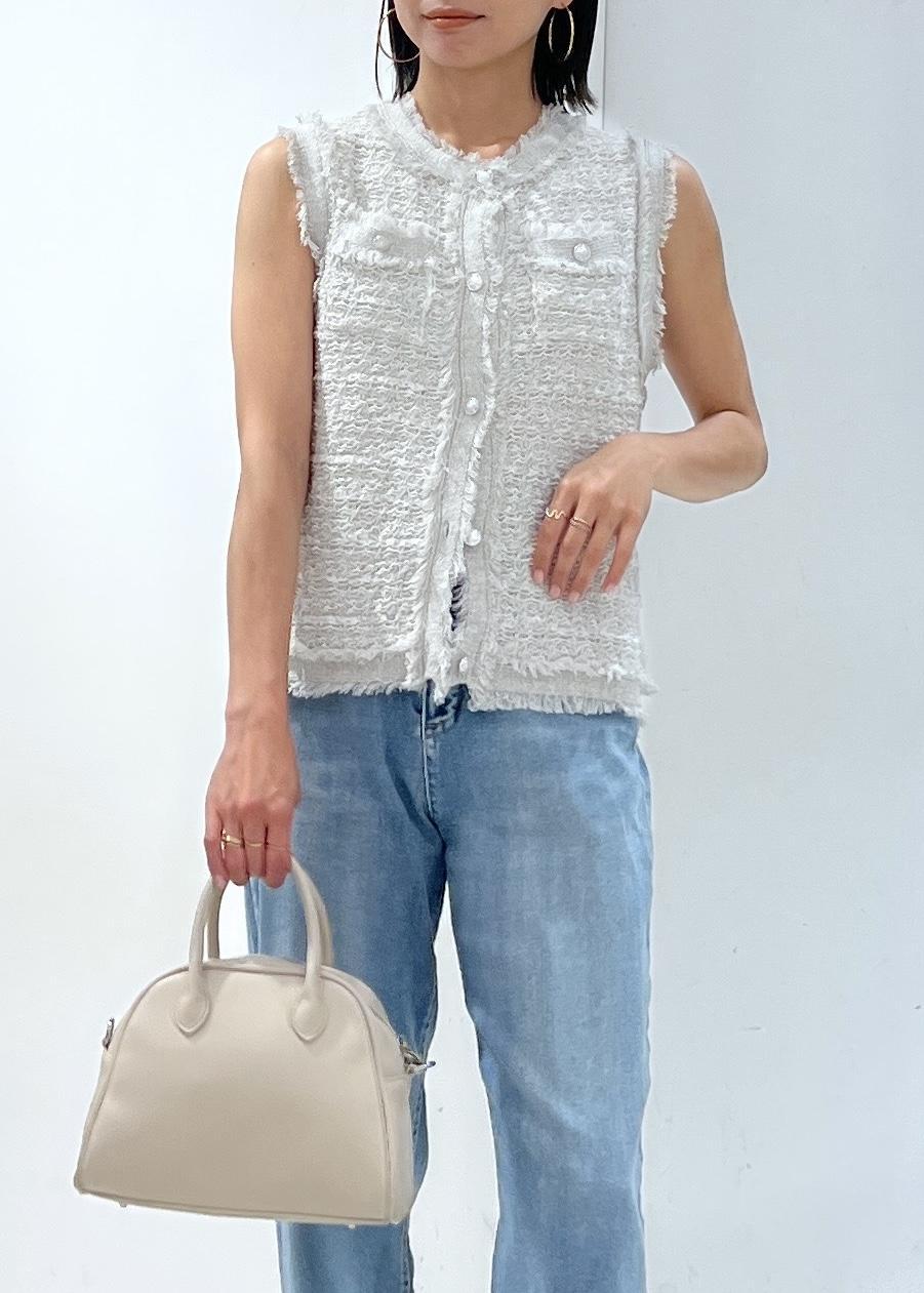 着丈の選べるツイードニットのジレは、デニムで合わせて大人カジュアルなスタイリングに。