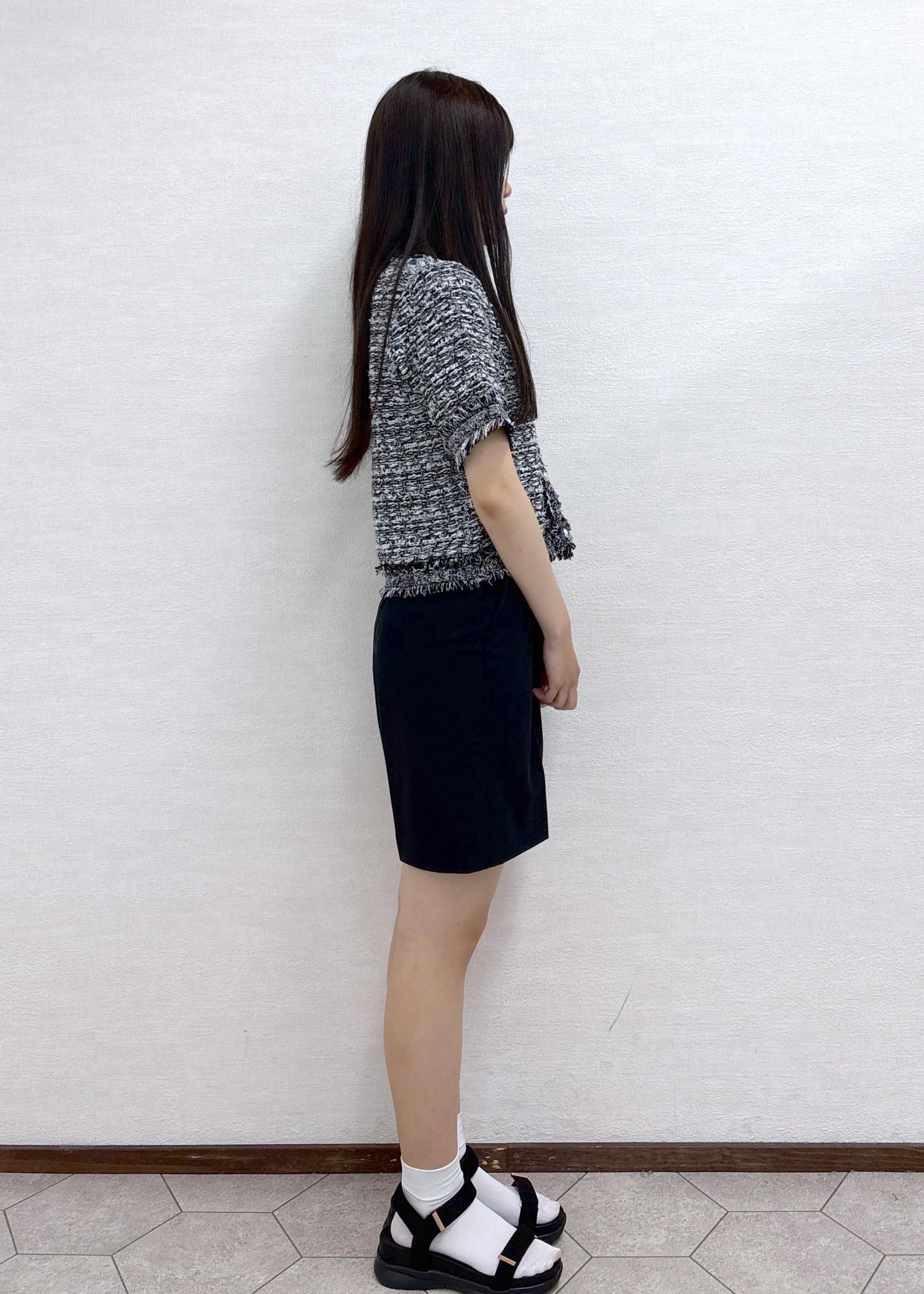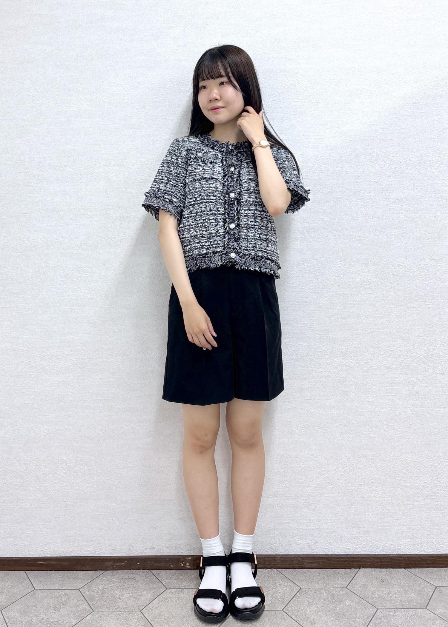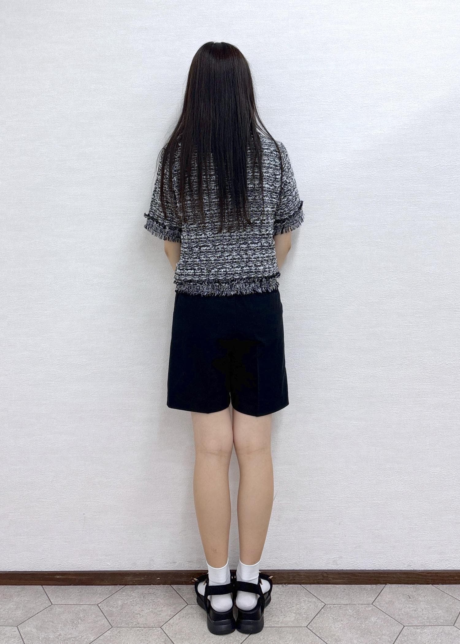 ブラックを基調としたトップスにブラックのショートパンツを合わせました。大人っぽく、上品なコーデです。