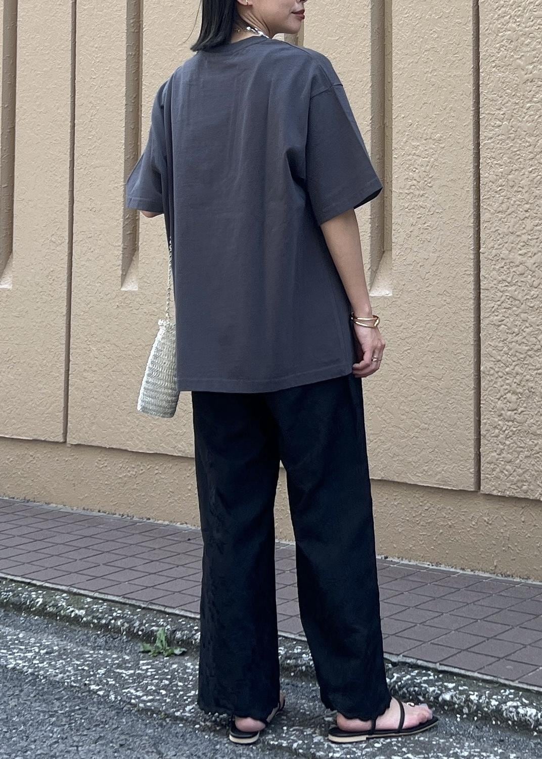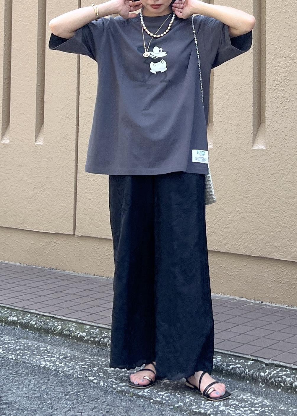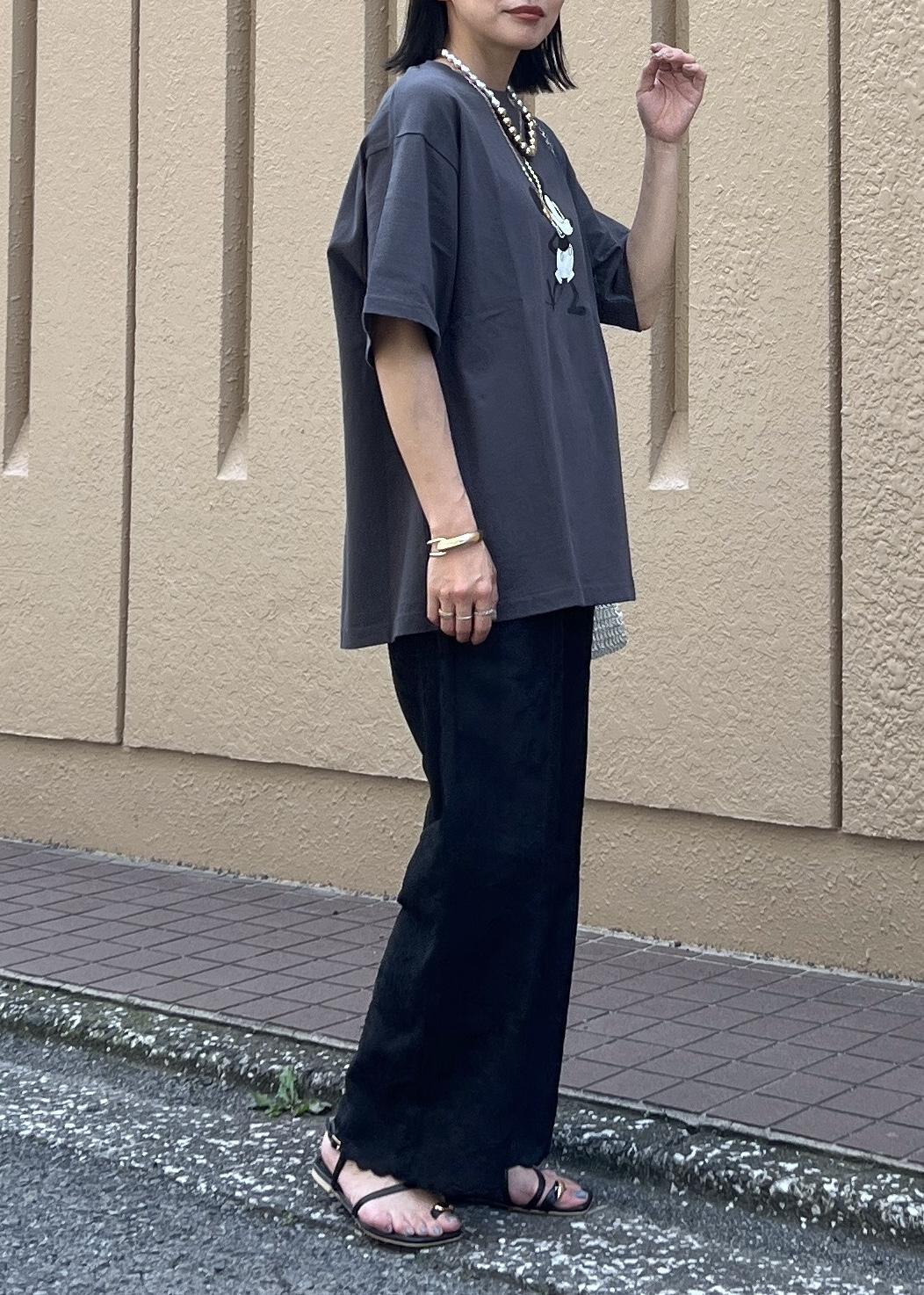 ゆったりサイズのプリントTシャツは、モノトーンでまとめてシックな着こなしに。