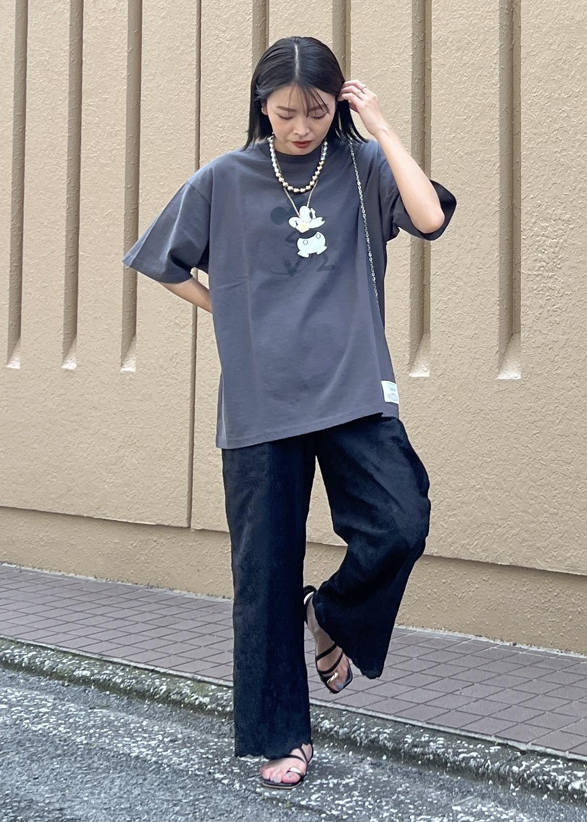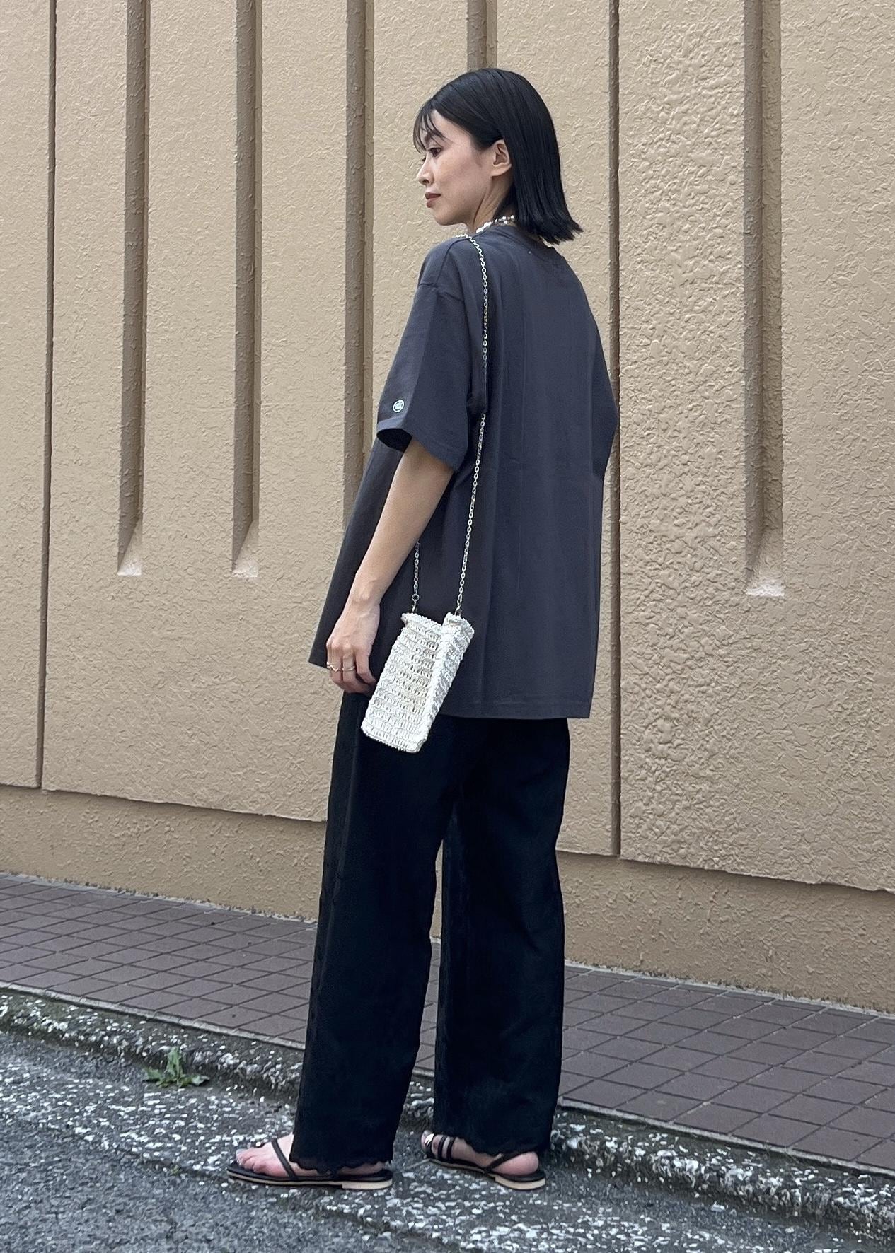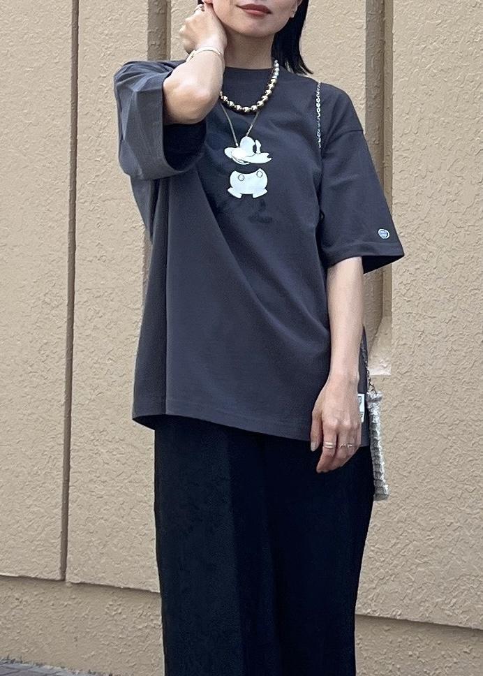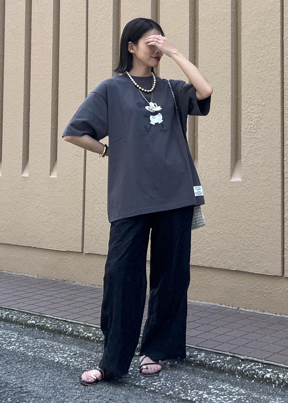 ゆったりサイズのプリントTシャツは、モノトーンでまとめてシックな着こなしに。
