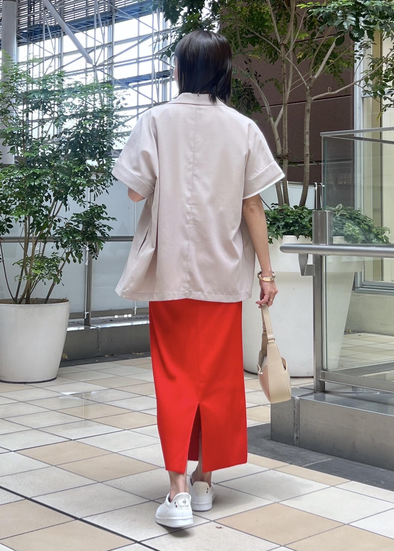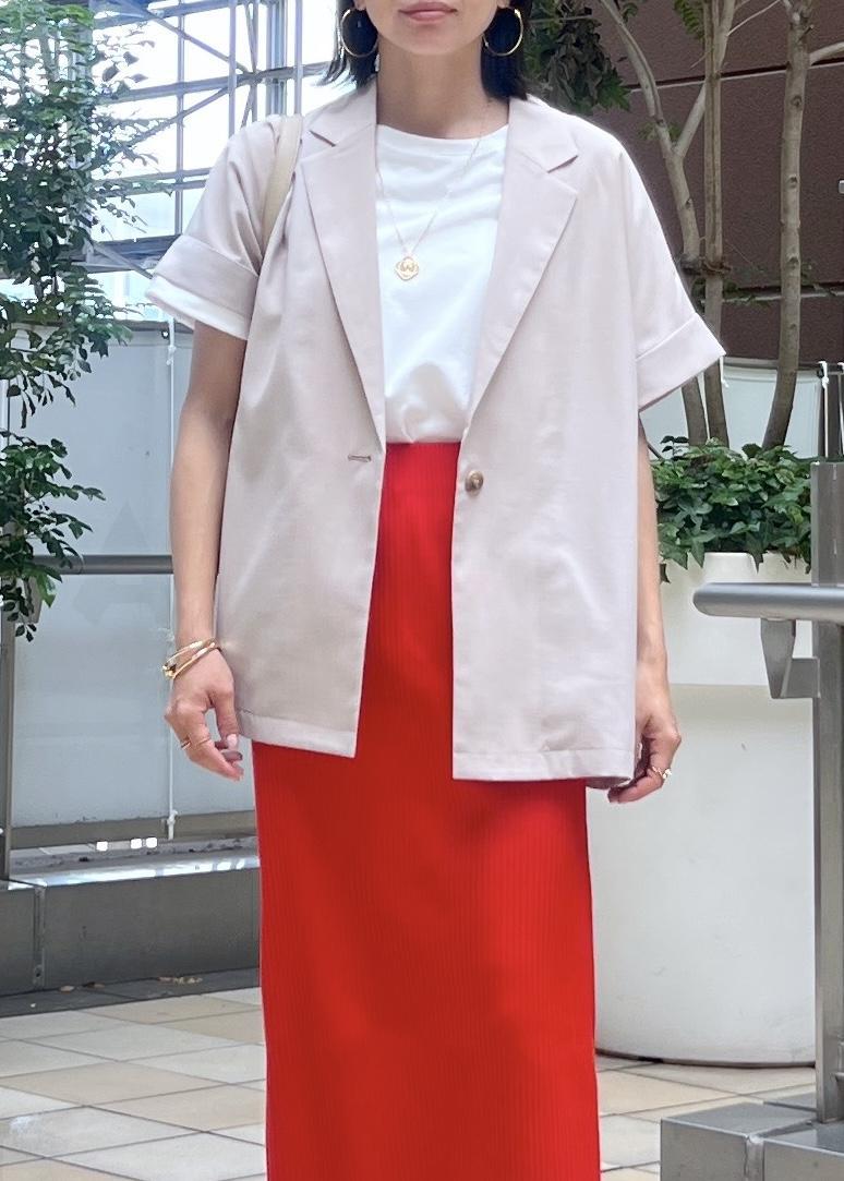 赤に相性の良いベージュのジャケットとハンドバッグを合わせて、大人カジュアルな着こなしにしました。