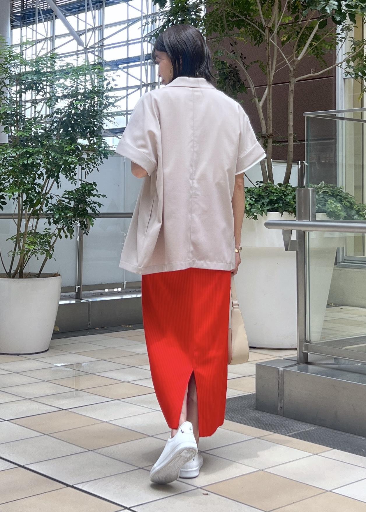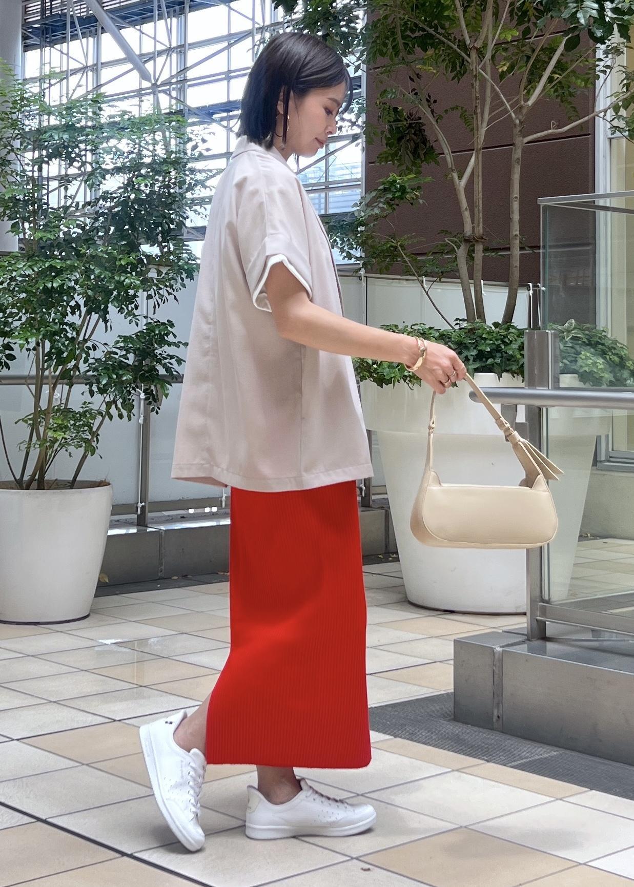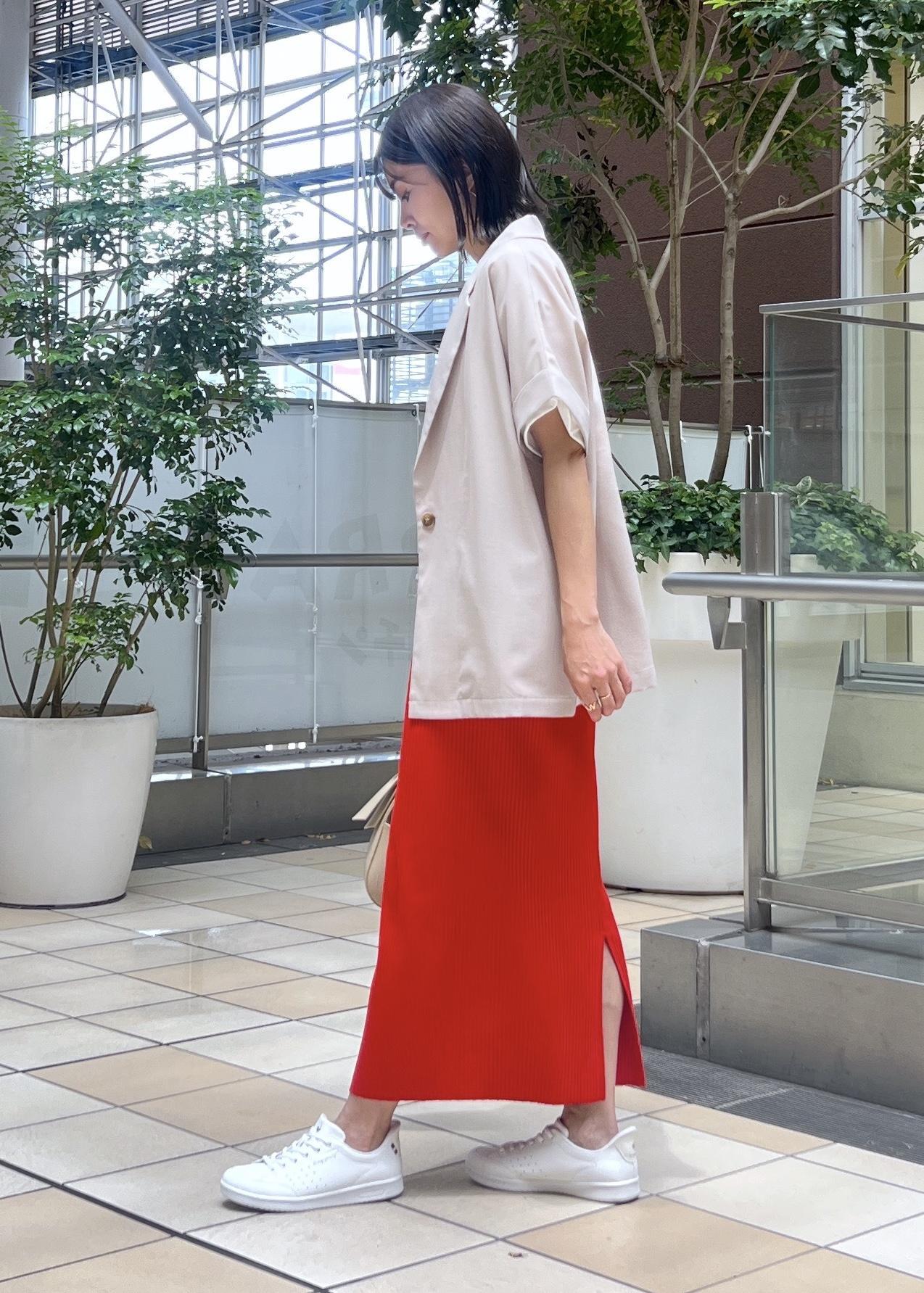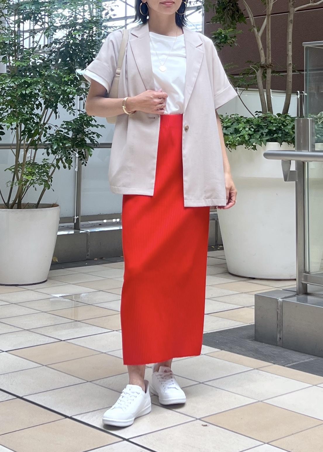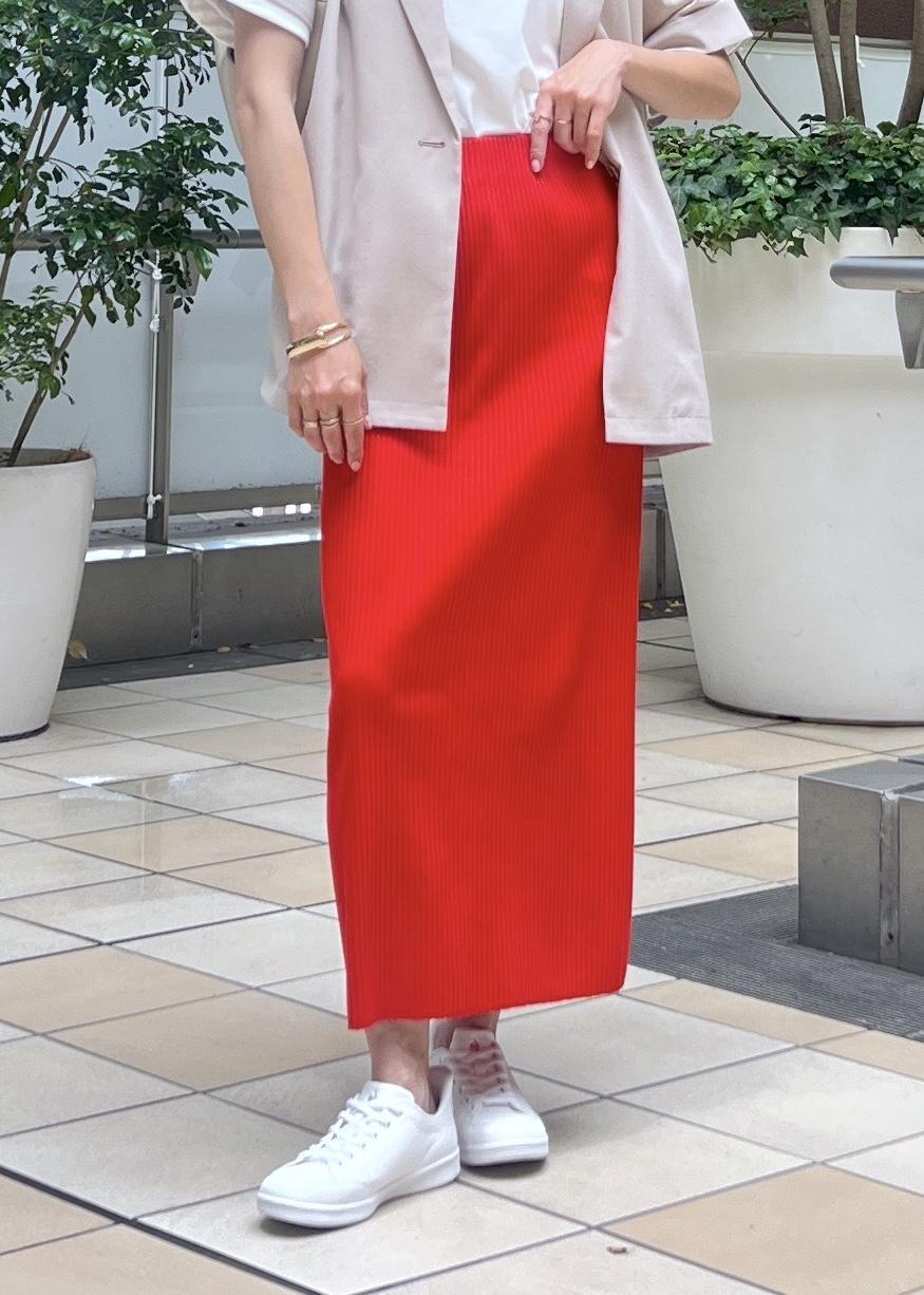 目を引くレッド系のアイラインスカートは、伸縮性があり柔らかく動きやすいので休日コーデにもおすすめ。