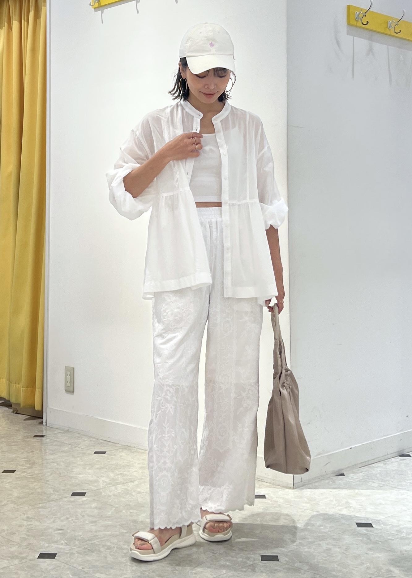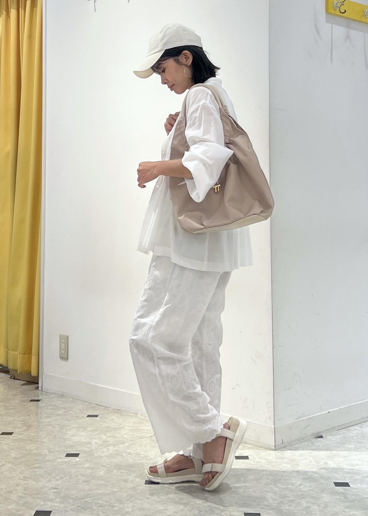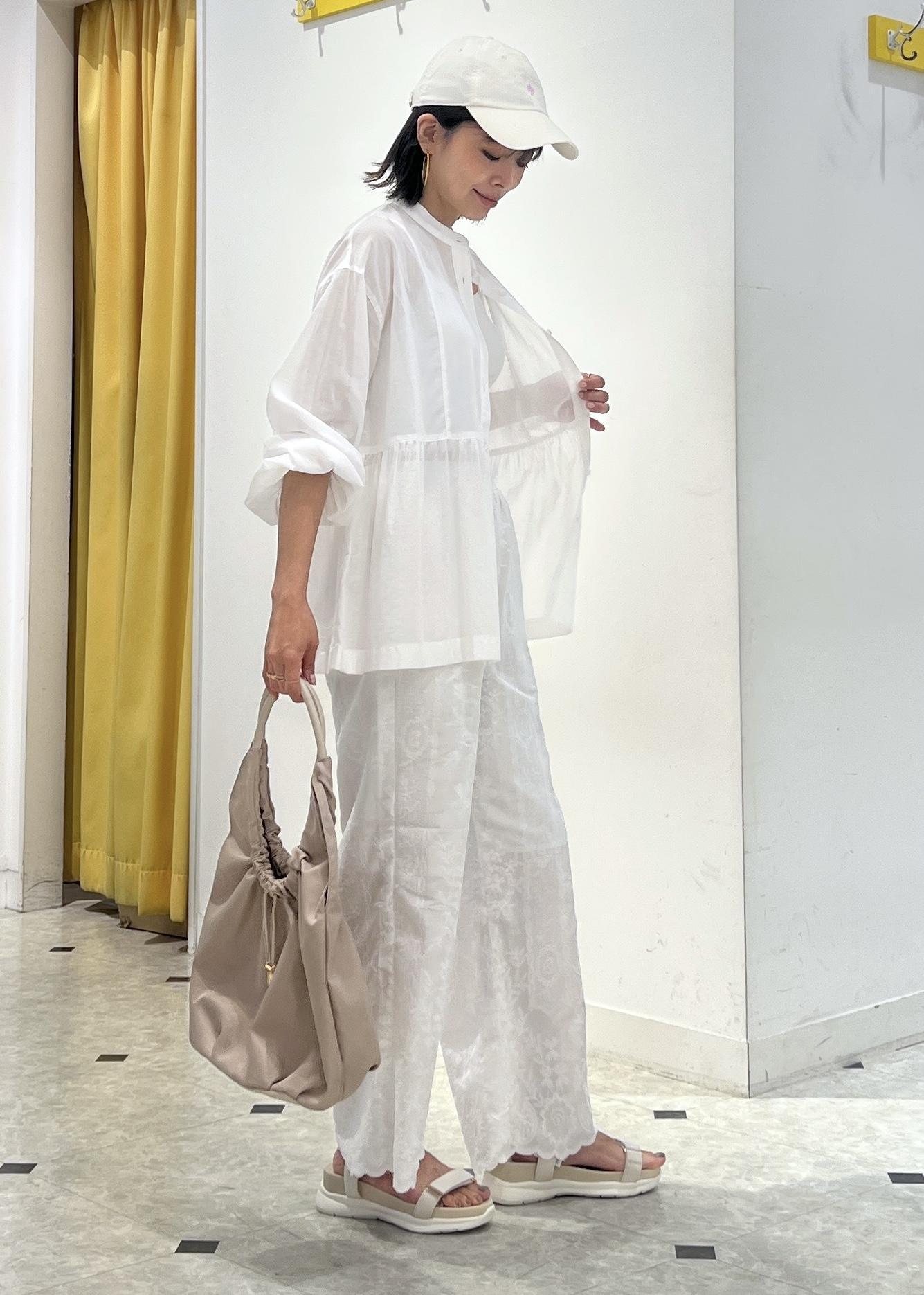 潔く上下をホワイトでまとめて、夏らしい爽やかさのあるホワイトコーデにしました。