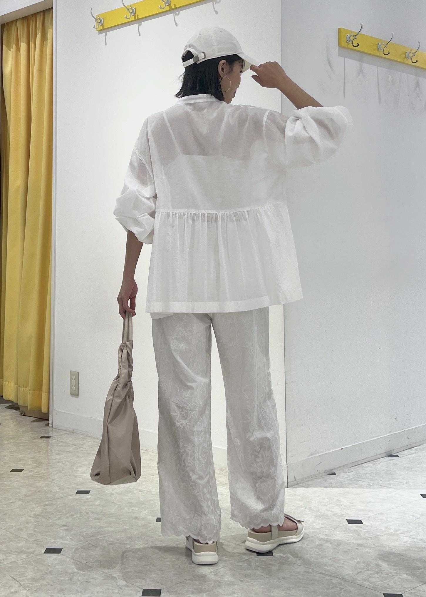 ふんわり柔らかい綿素材のシャツはぺプラムシルエットで、体型カバーも叶えてくれます。