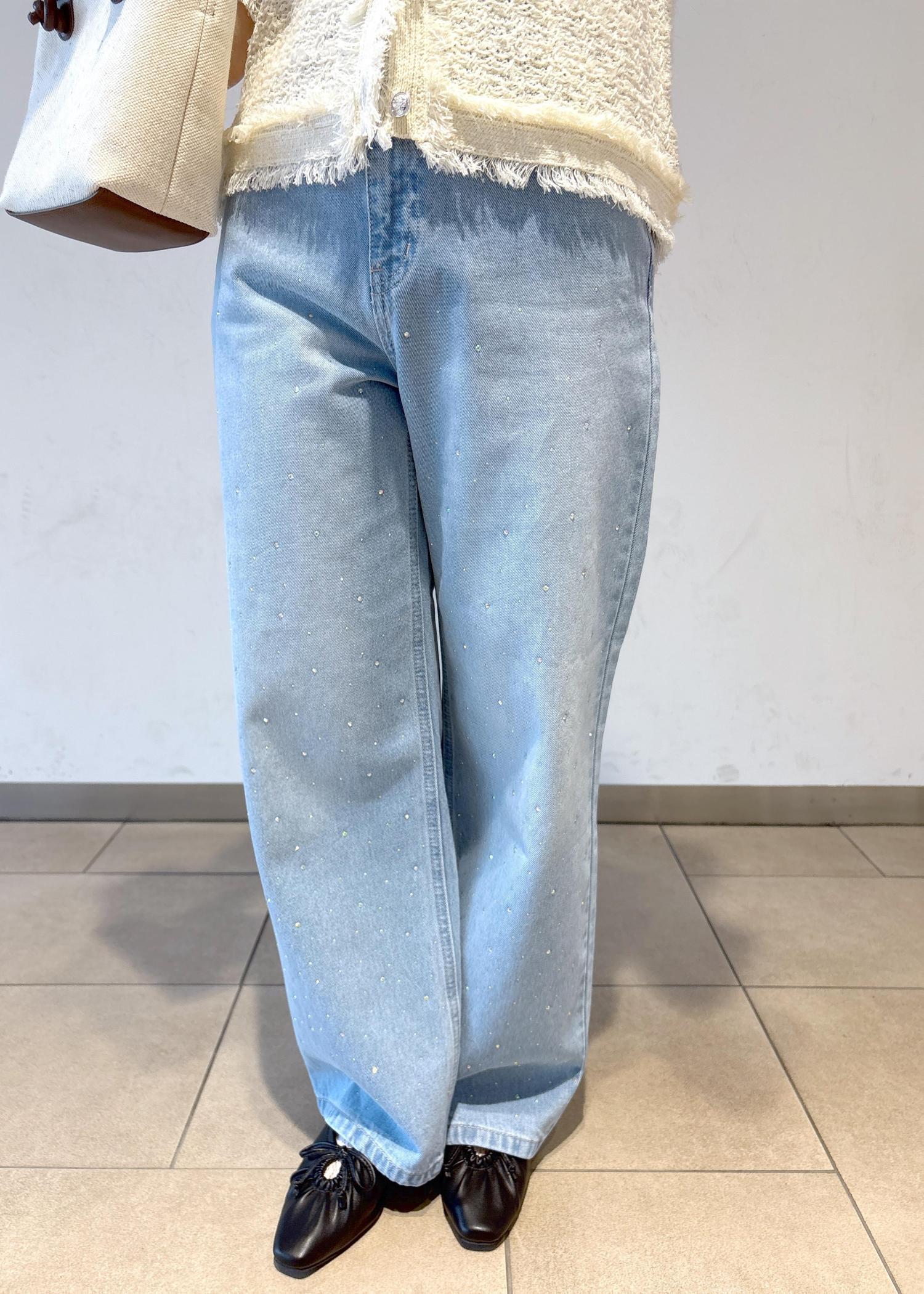 ビジューが付いているアイテムで、少し高みえするようなアイテムです。ワイドのシルエットになっているので足のラインを拾いにくいのが特徴です。身長150cmの私は少しヒールのある靴と合わせるとギリギリ下にはつかない長さです。
