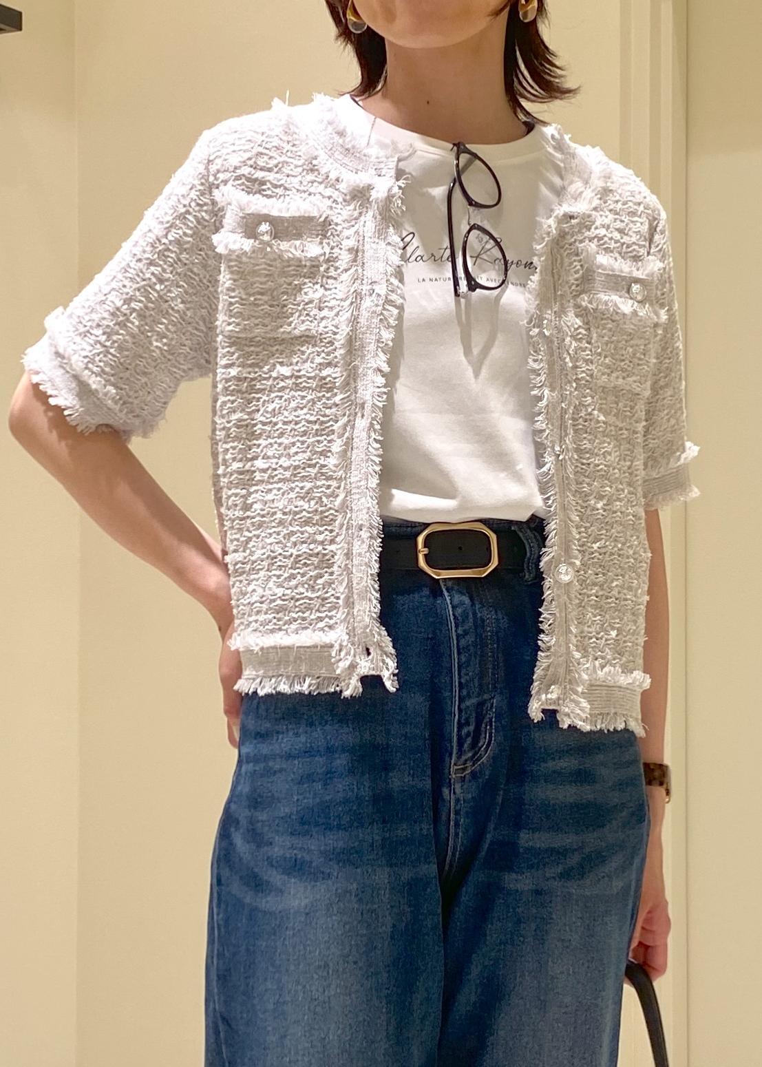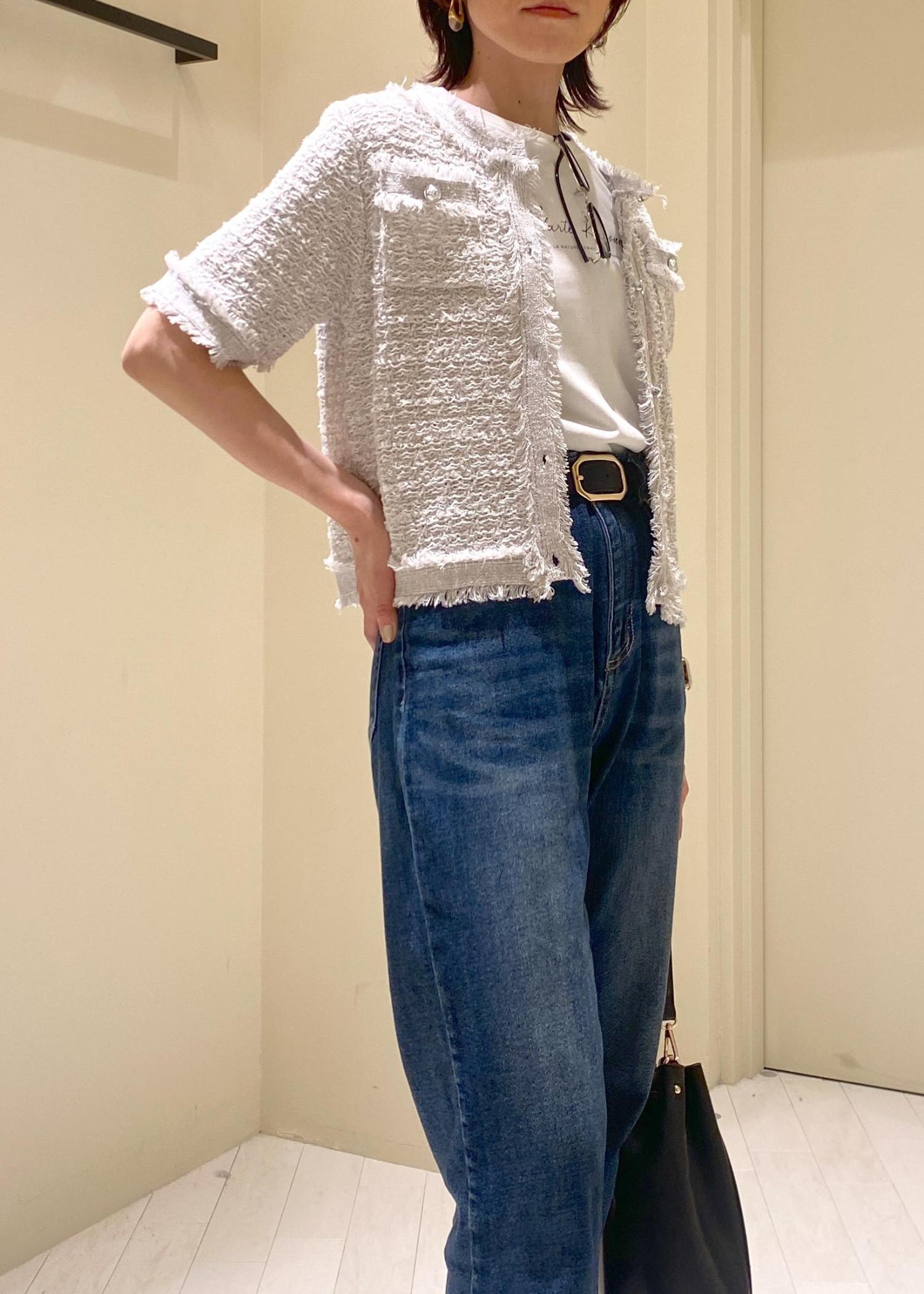 ロゴT×デニムのシンプルカジュアルスタイルに、サマーツィードカーディガンをプラス。