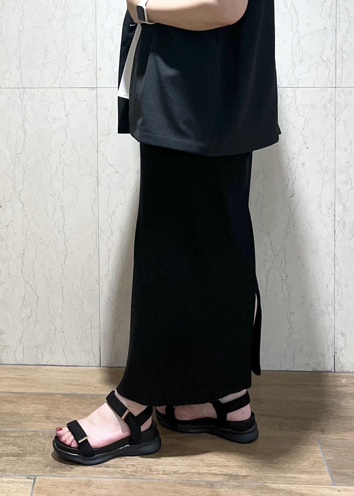 ブラックのアイラインスカートを合わせて大人っぽいスタイリングです!