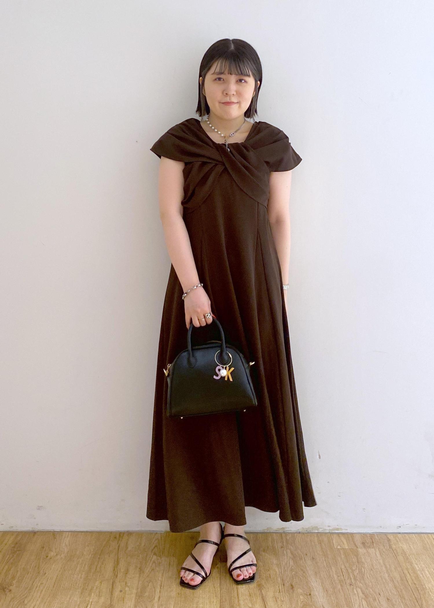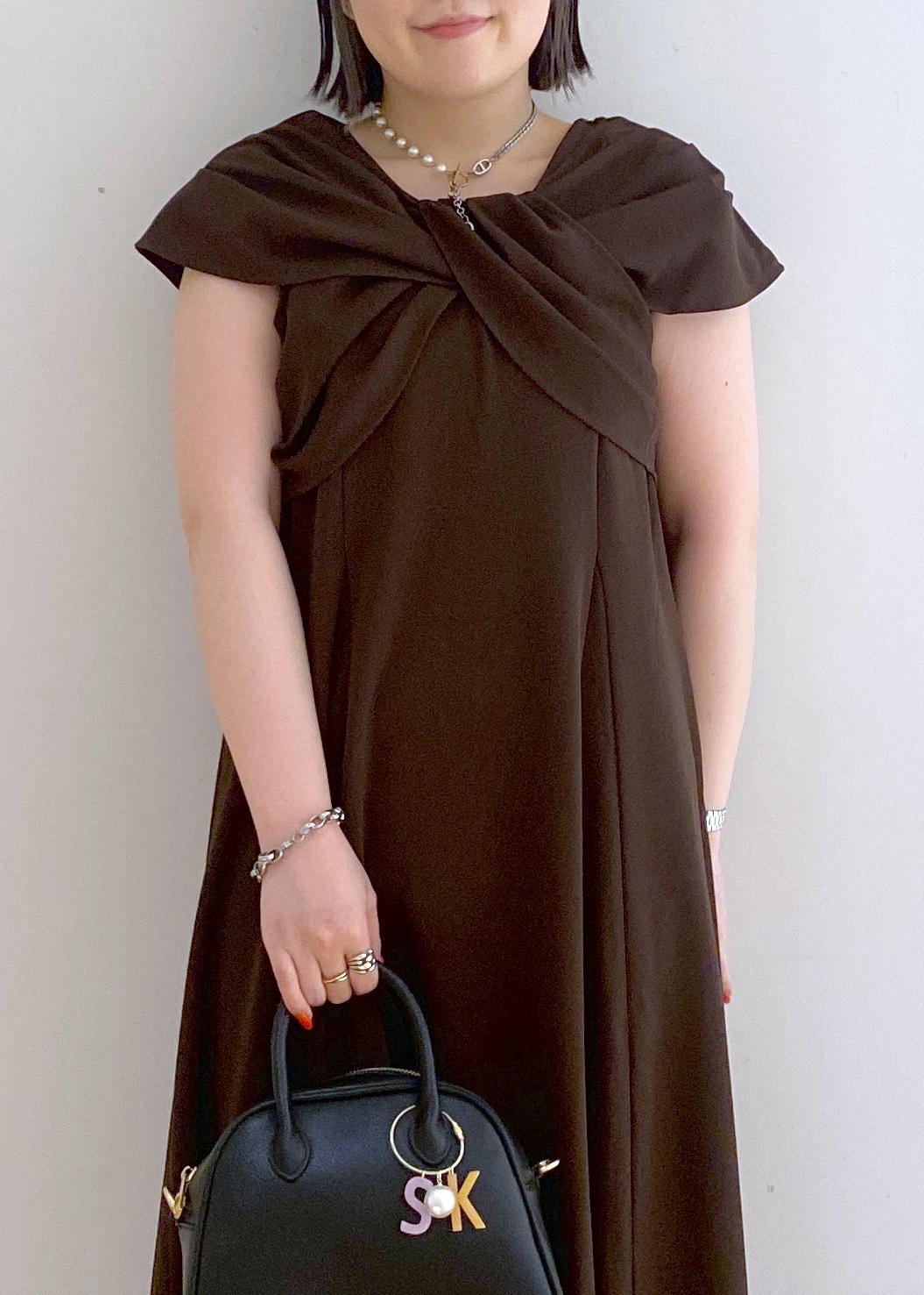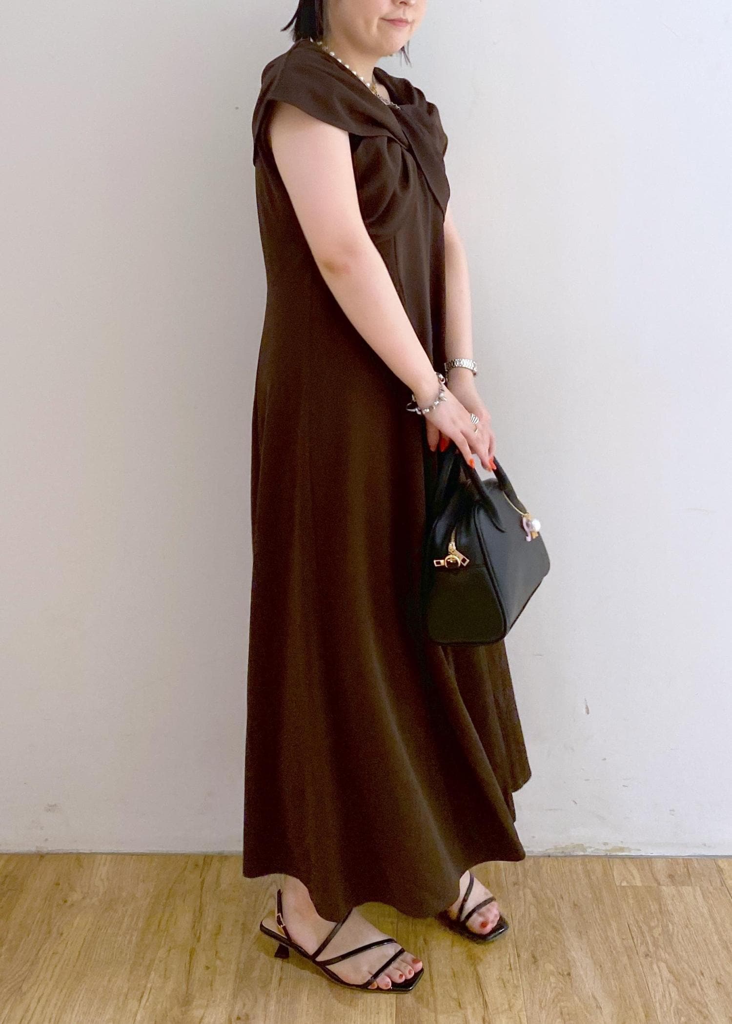 ROPÉ PICNIC【emur/エミュール】ドレープデザインワンピースダークブラウン / 38¥9,900レビュー156cmで足首にかかるややロング丈。素材は伸縮性がありスッキリ見えますが締め付けはない着心地です。二の腕も少し隠れるドレープデザインなので骨ストさんでも気にならず着用できそうです◎