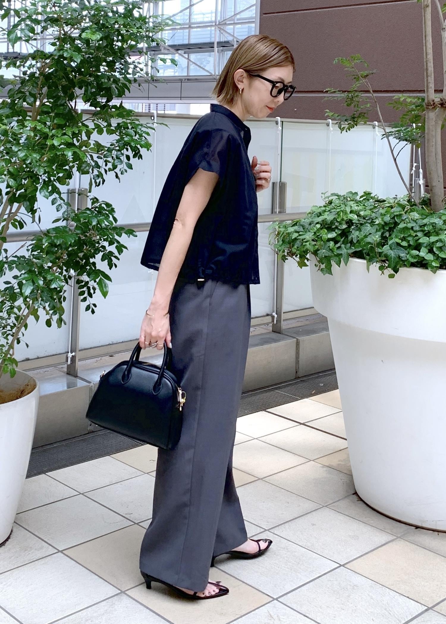 オンオフどちらのスタイリングにも持てるシンプルなバッグ。