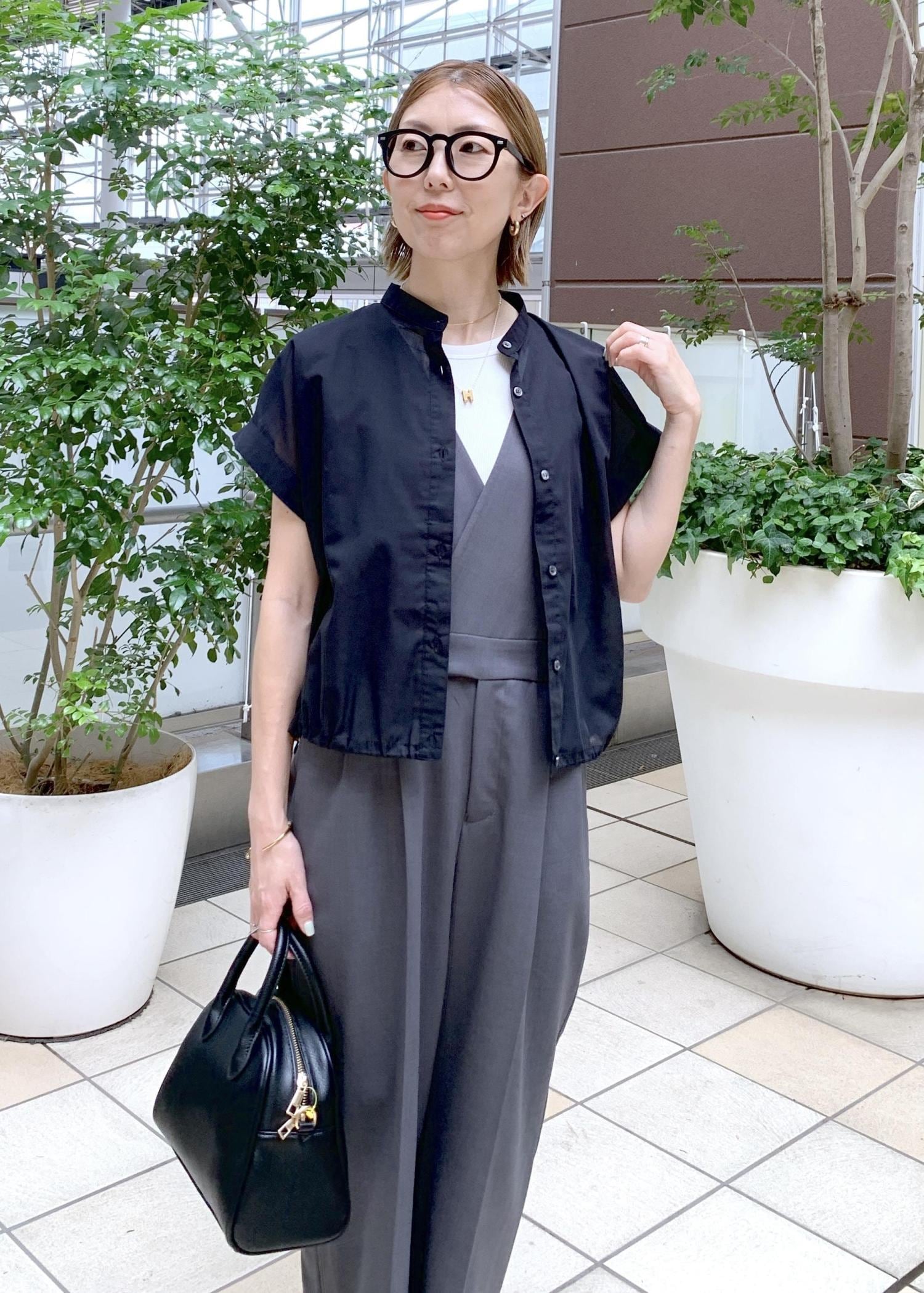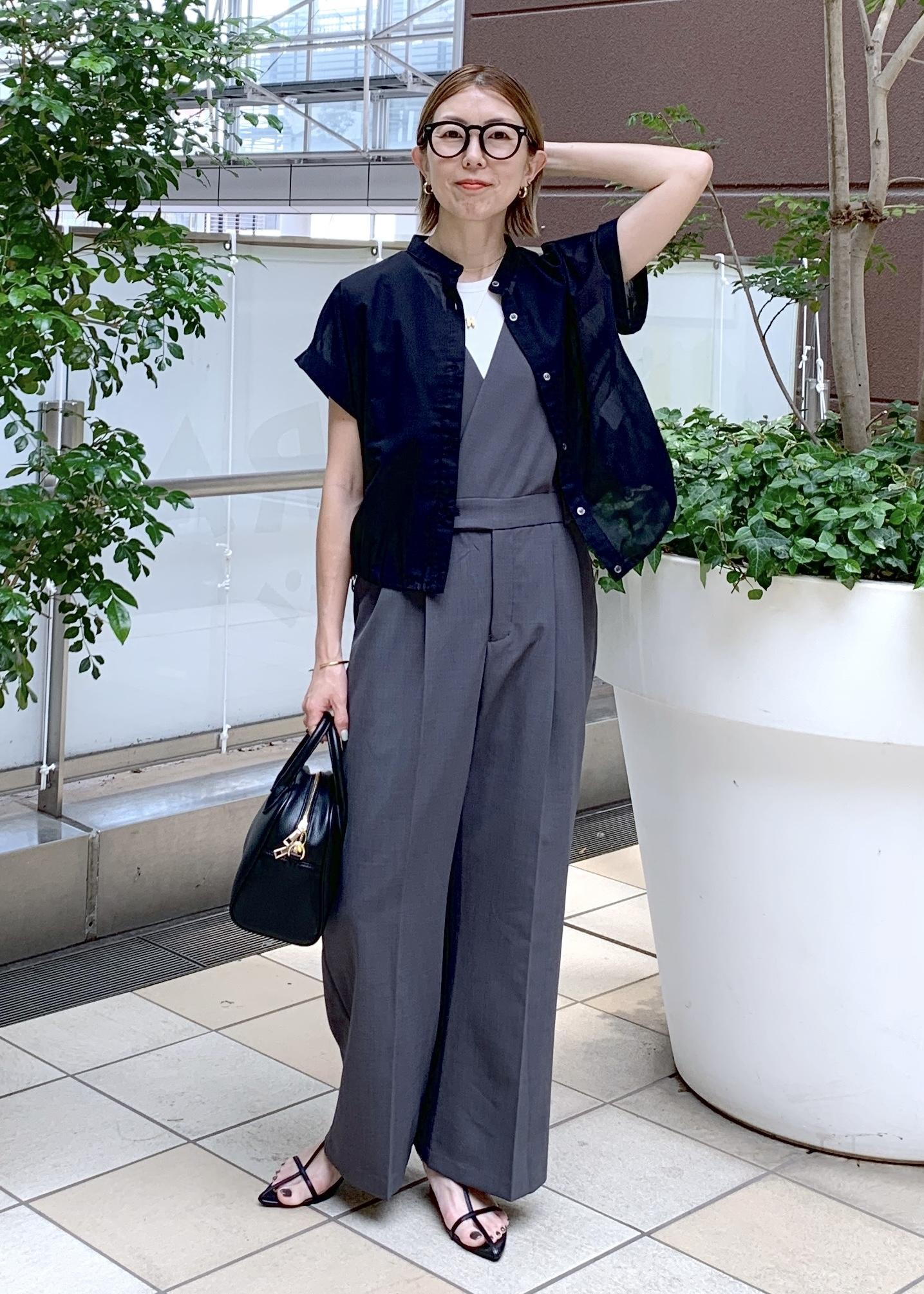 シンプルにワントーンで合わせた大人のオールインワンスタイリング。