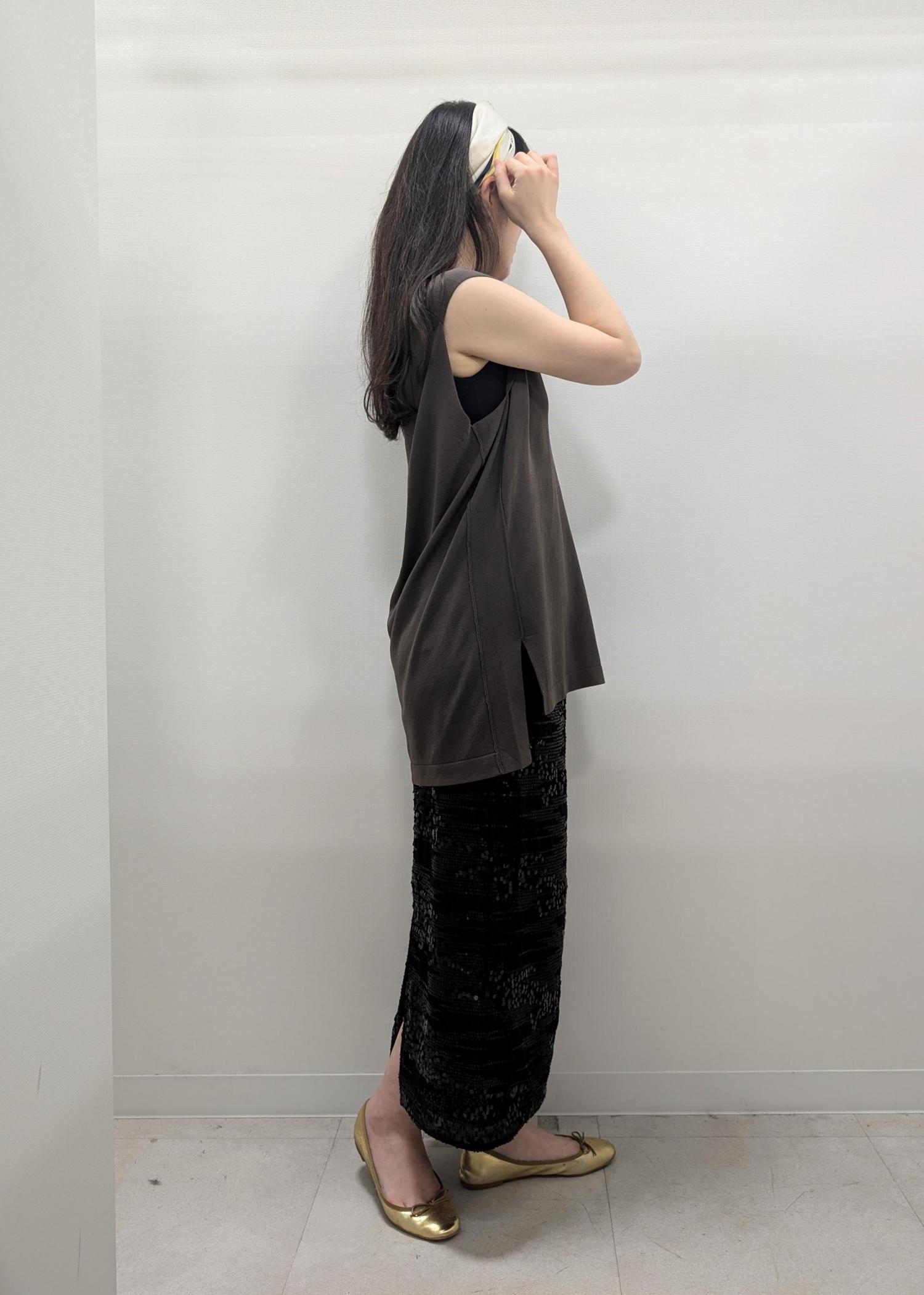 スカートとタンクトップの色を合わせることで縦長シルエットになるようにしてます♫
