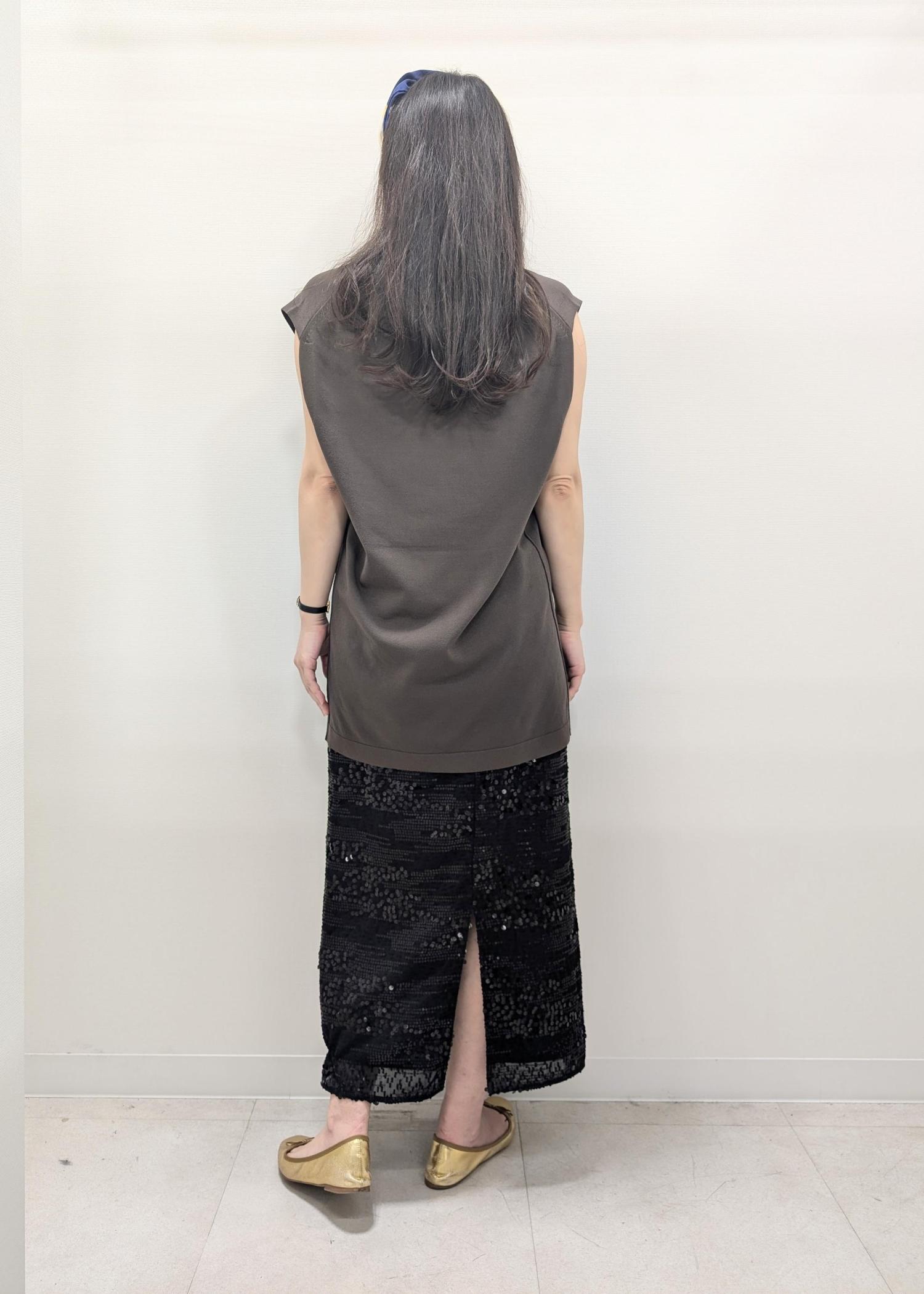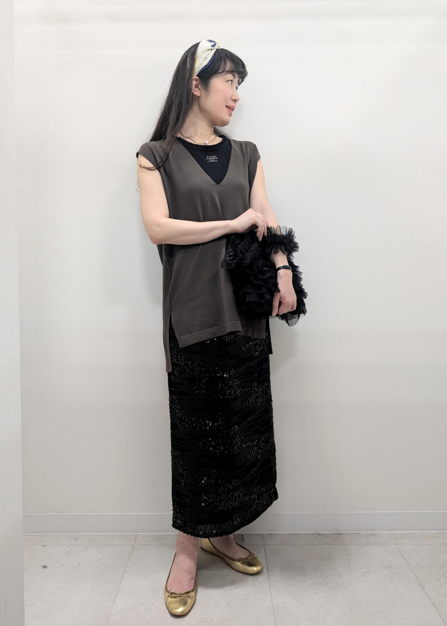スパンコールのスカートが主役なので、トップスはシンプルなニット、色はダークカラーを選びました(^.^)