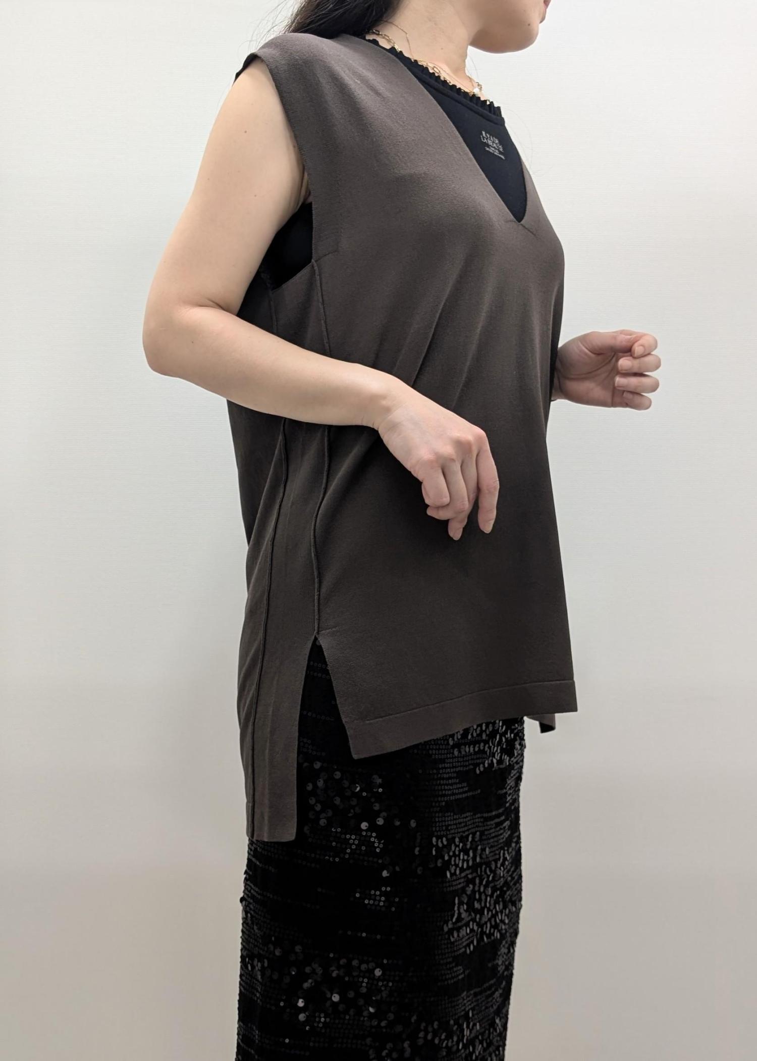 深めのVネックの着痩せ効果もあり、楽ちんですがスッキリ見えが叶うニットだと思います。 -
