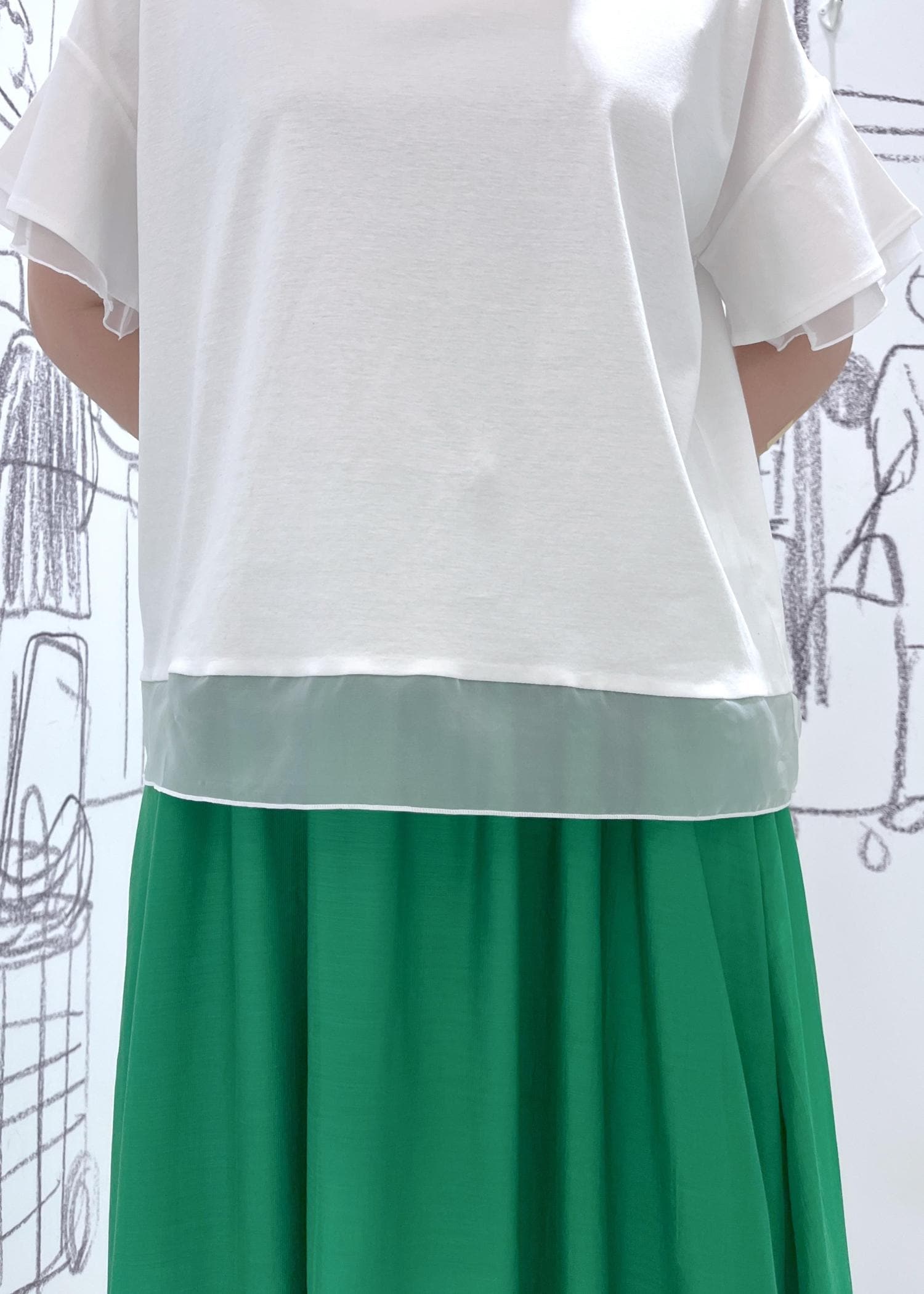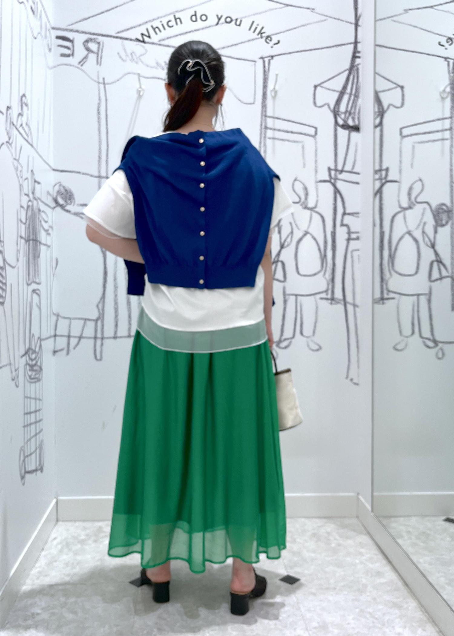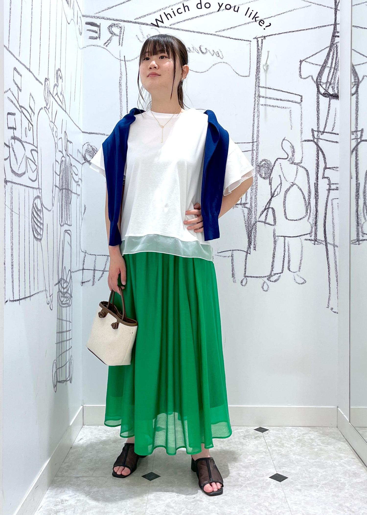 シンプルなトップスに差し色としてグリーンのスカートを合わせました。青いカーディガンを合わせて夏らしくまとめたコーディネートです。