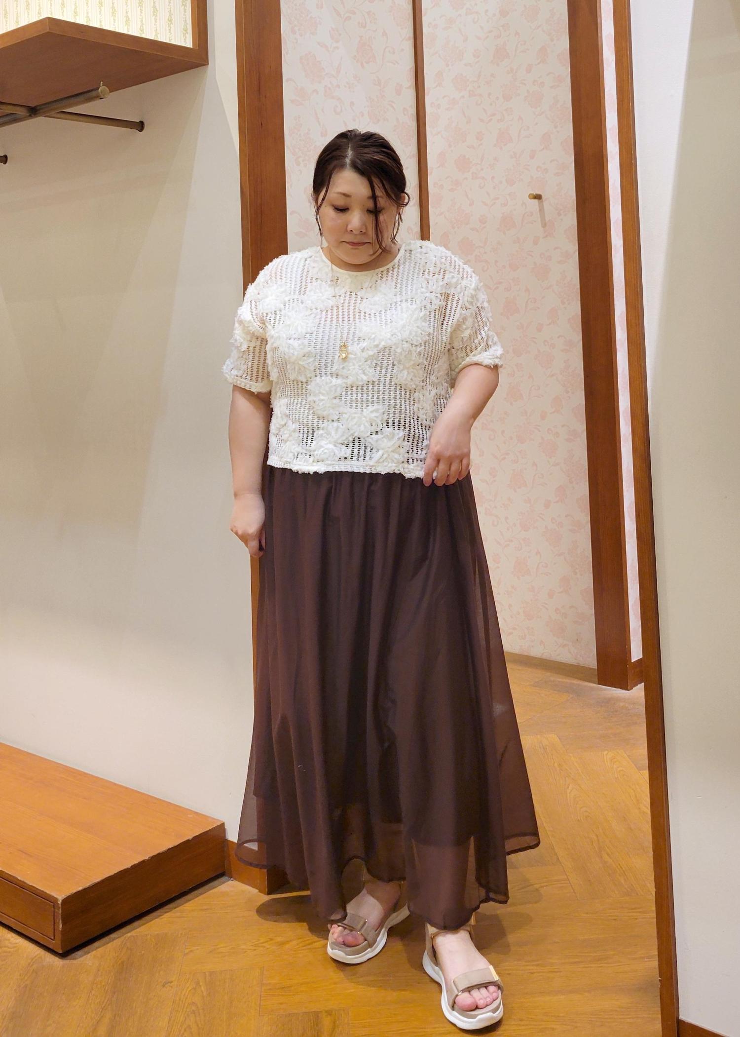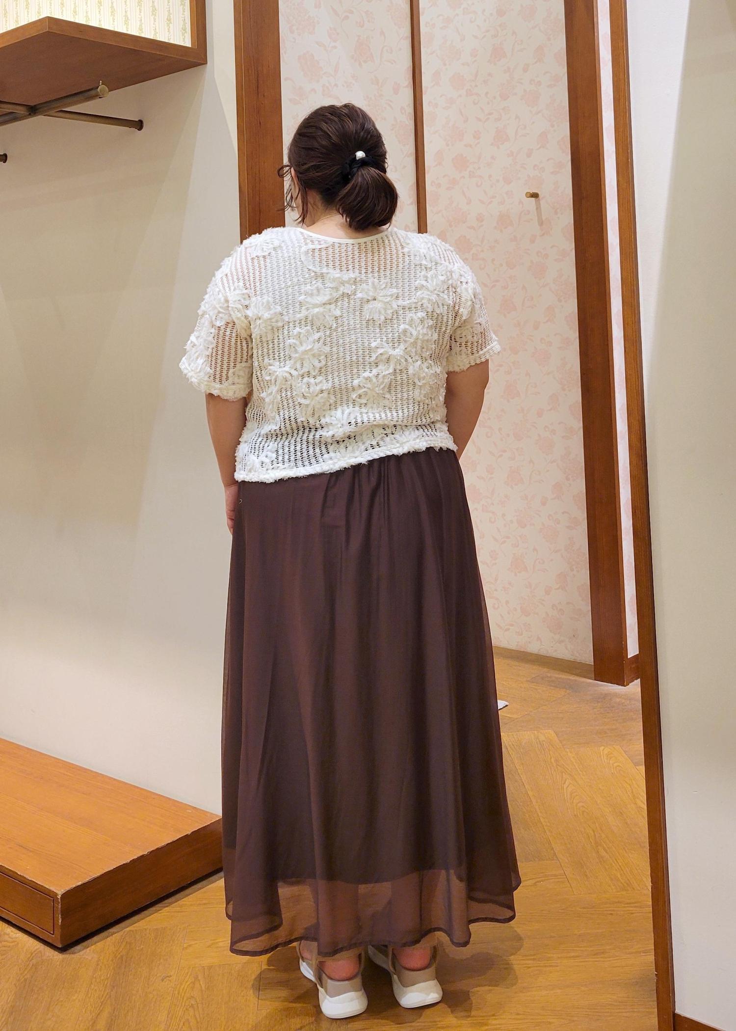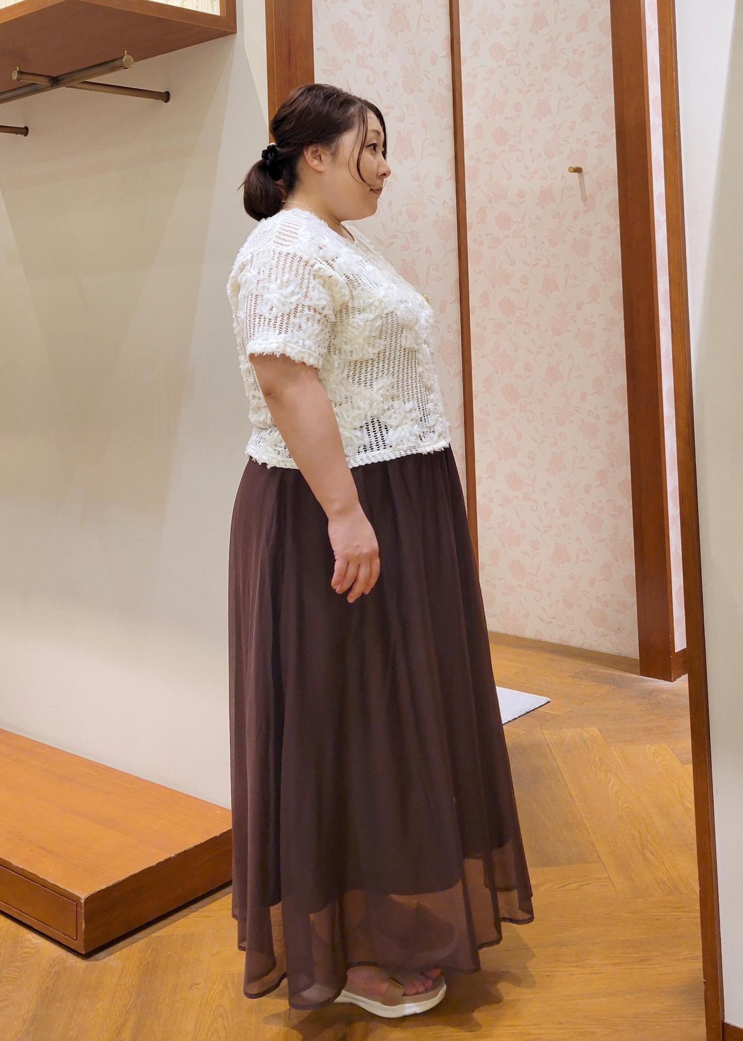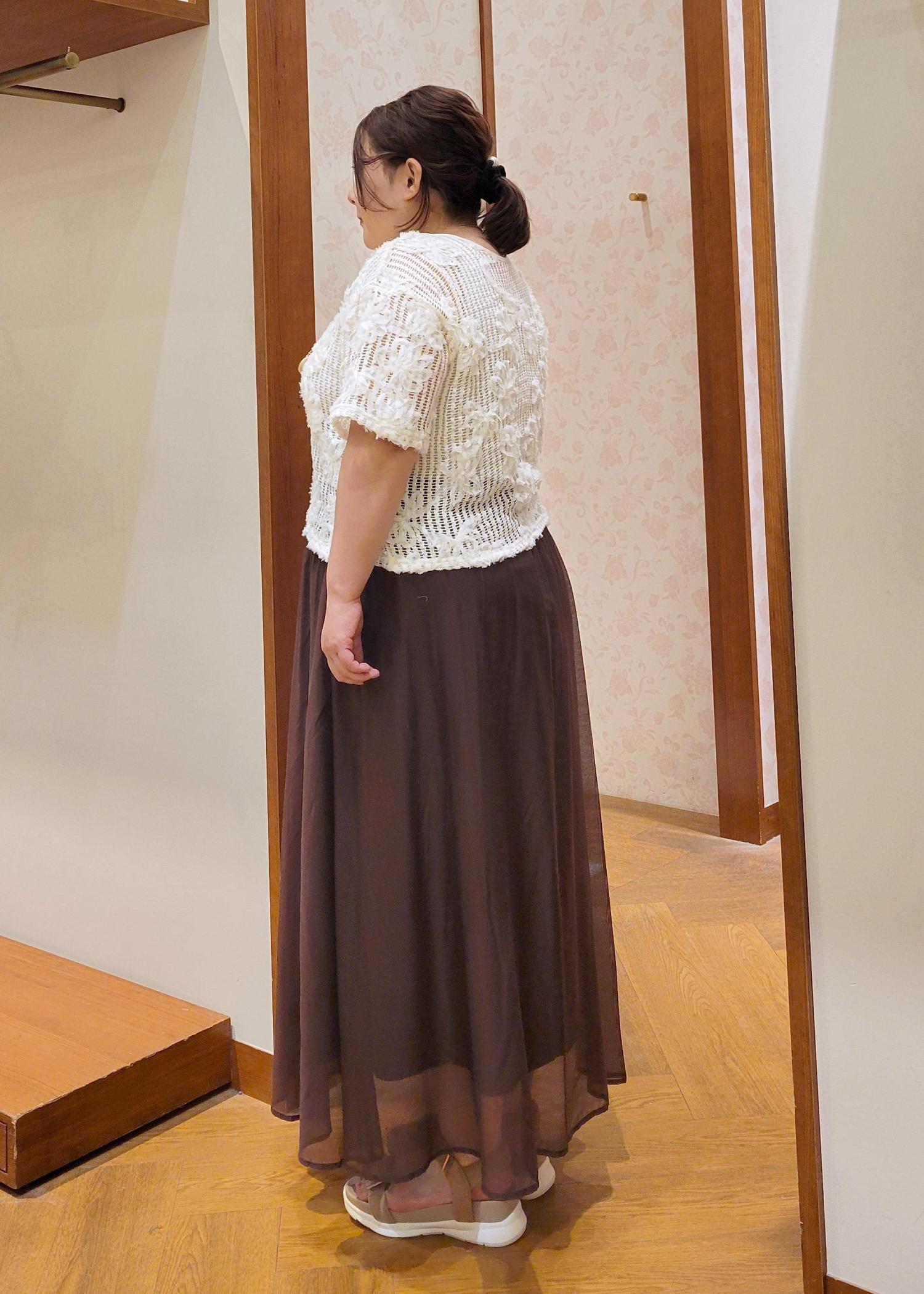 ROPÉ PICNICエアリーシアーギャザーロングスカートダークブラウン / 38¥6,490レビューウエストが総ゴム仕様なので締め付け感もなく楽チンです。着丈も裾がシアーになってるので足首が見えるように透け感があるので軽やかで低身長の方でも安心して履けます。