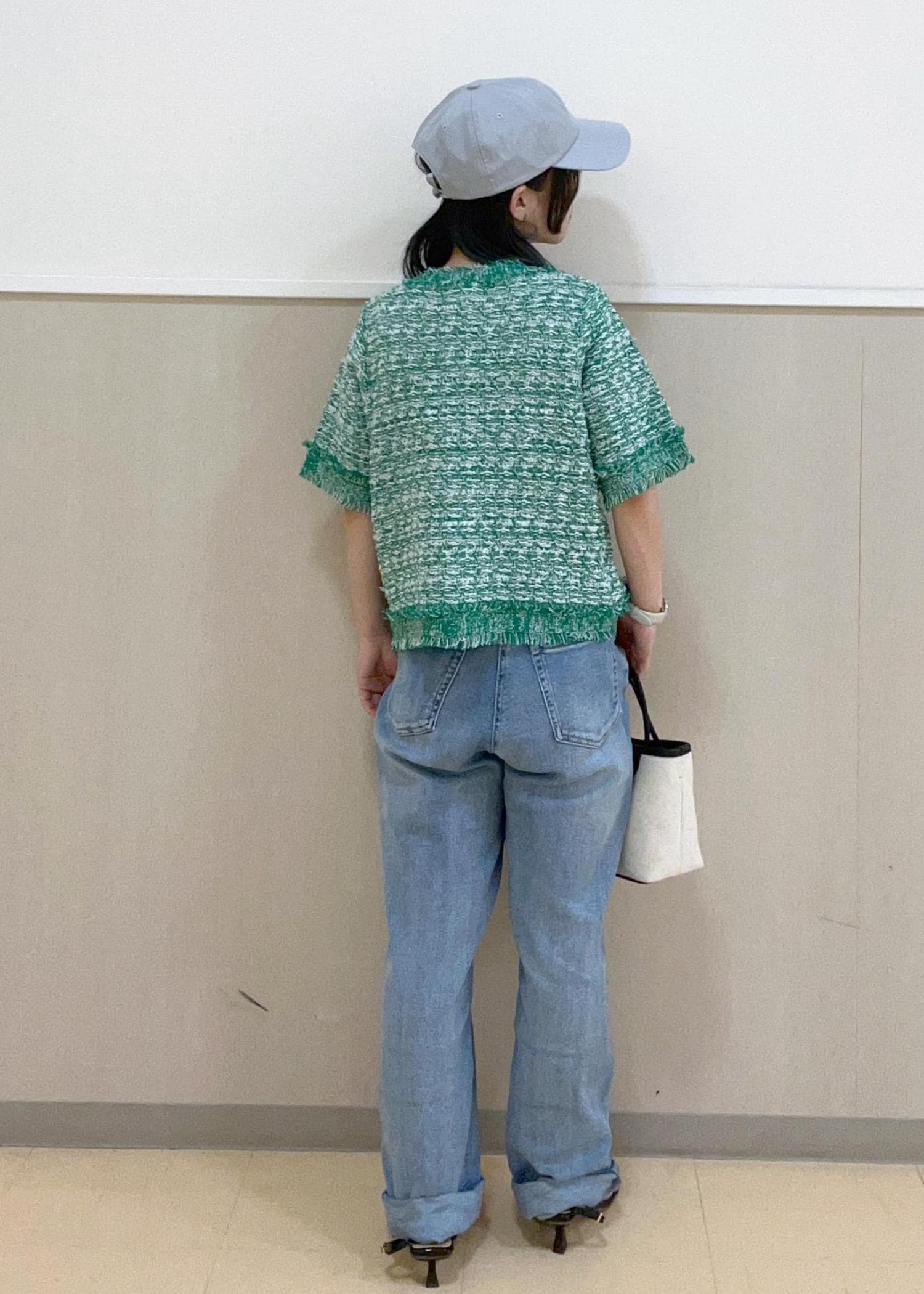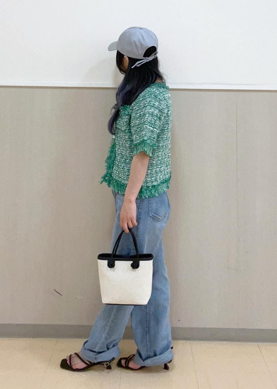 ミックスの色味がかわいいカーディガンとデニムで夏らしい雰囲気のコーデにしました!