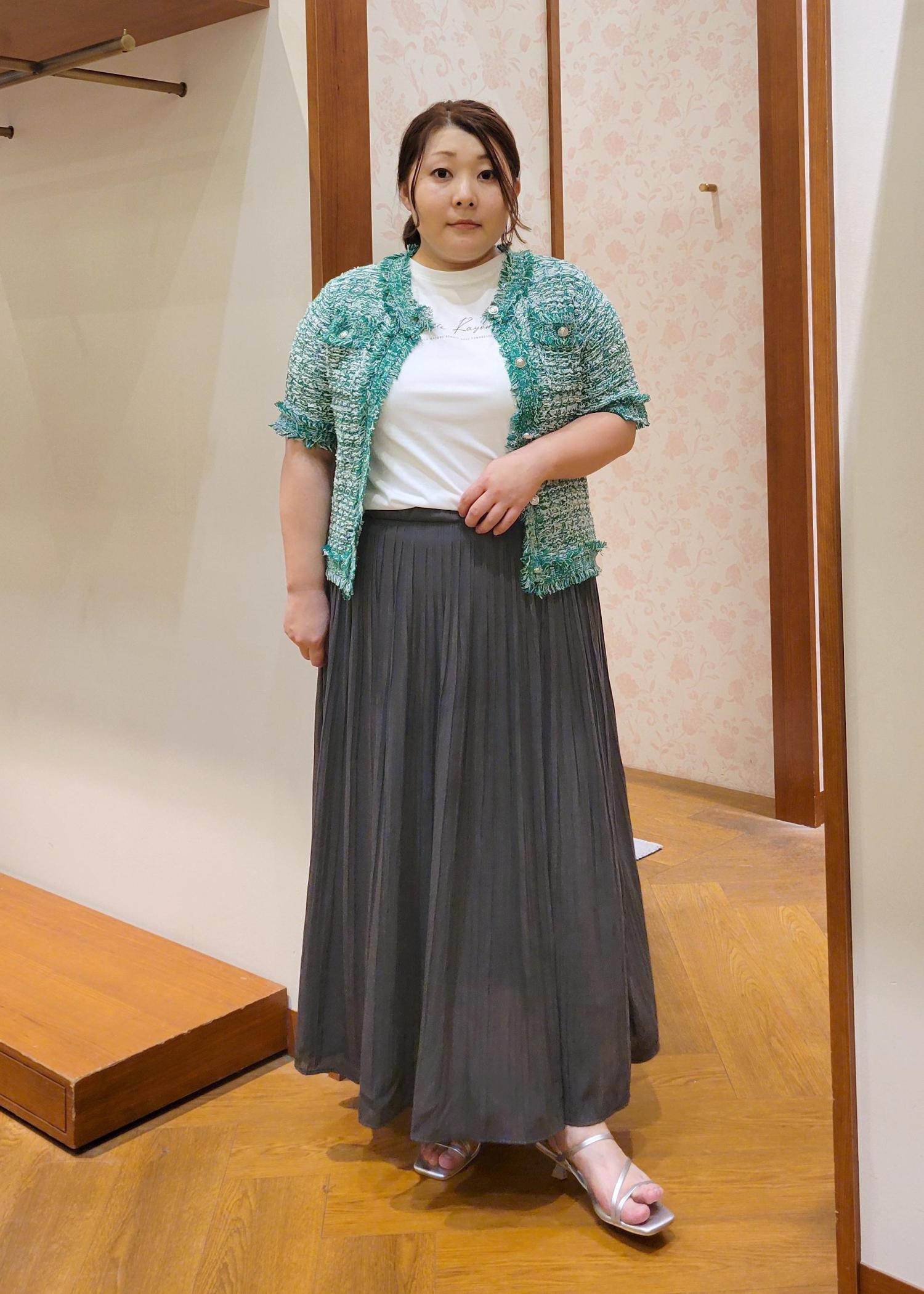 ROPÉ PICNIC着丈が選べるエアリープリーツスカートグレー / 38T¥3,993レビューウエストがゴム仕様になってるので締め付け感がなく着れます。低身長でも38Tサイズでも足首あたりの丈感なので引きずることはありません。裏地も付いてるので安心して着用できますよ。