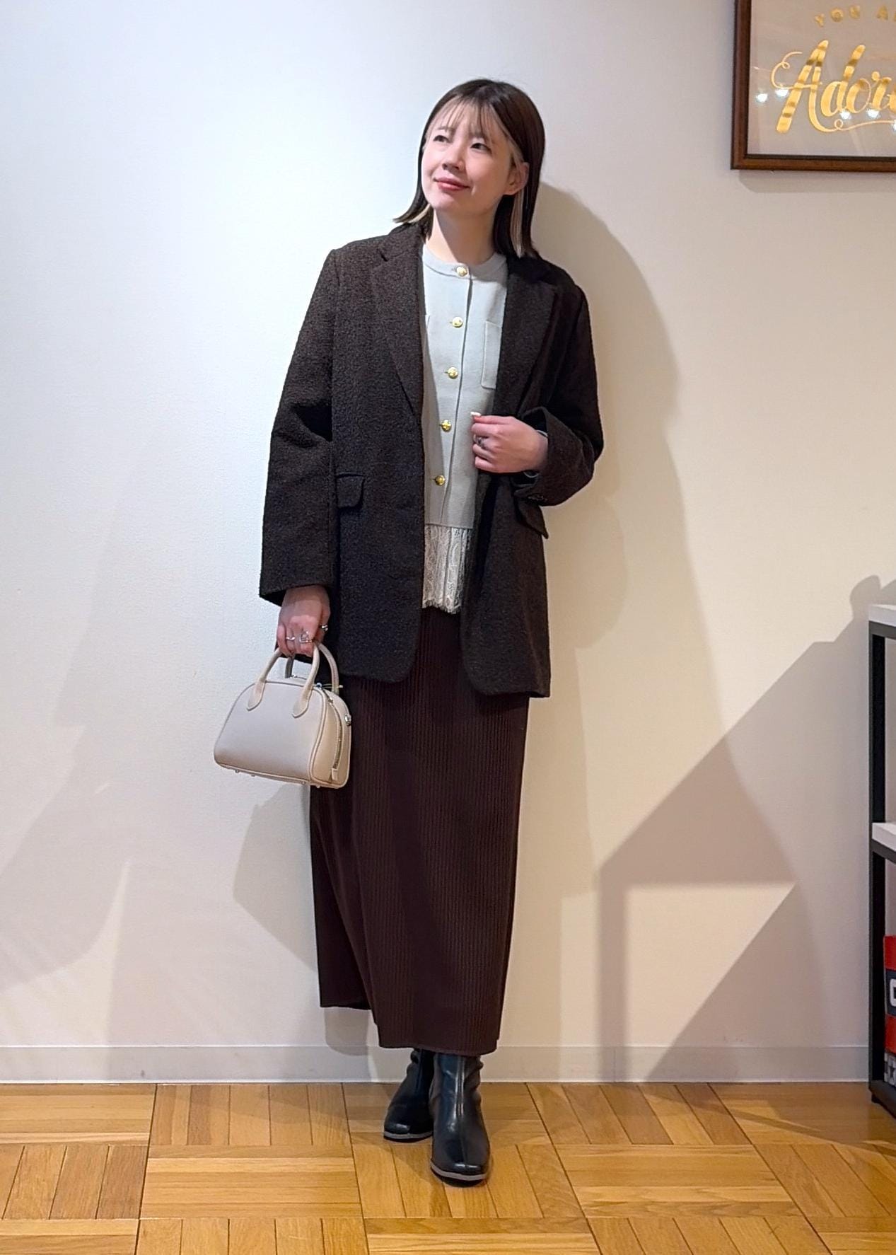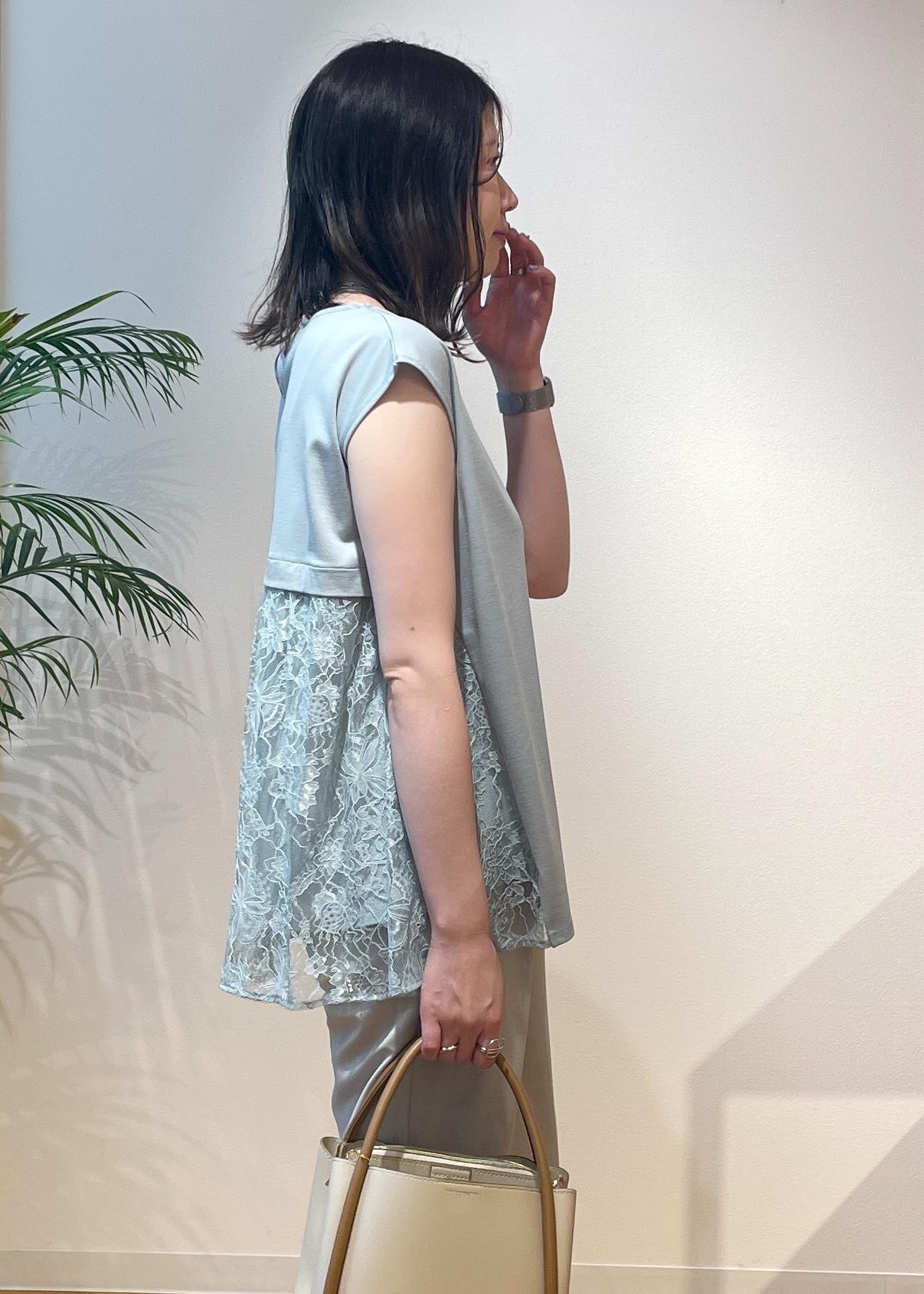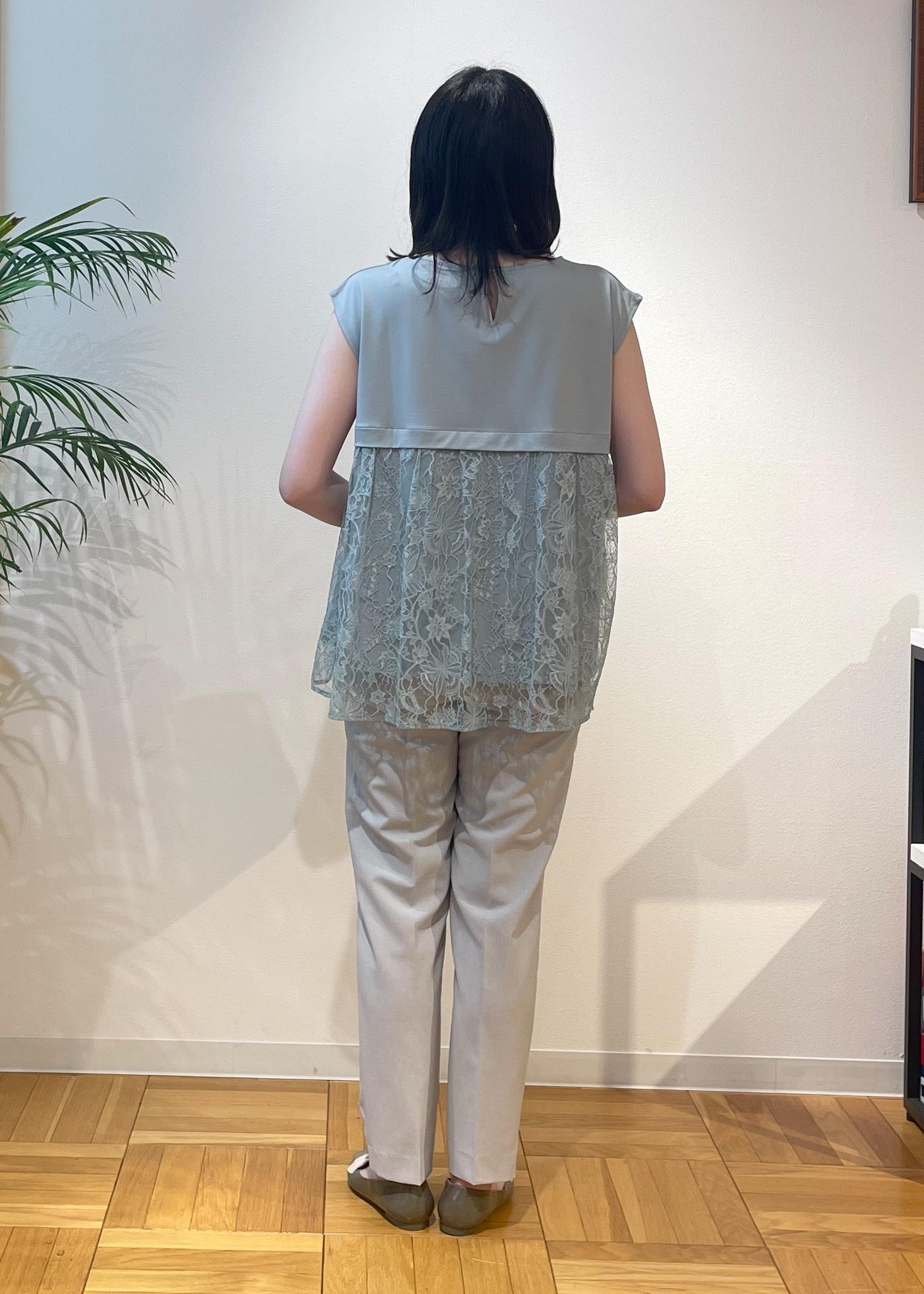 シンプルなキレイめコーディネートです!トップスは光沢感も出て、後ろデザインのレースもふわっと動きがでるのでとてもキレイです◎今回はパンツスタイルでまとめましたが、スカートタイプとも相性良いです!