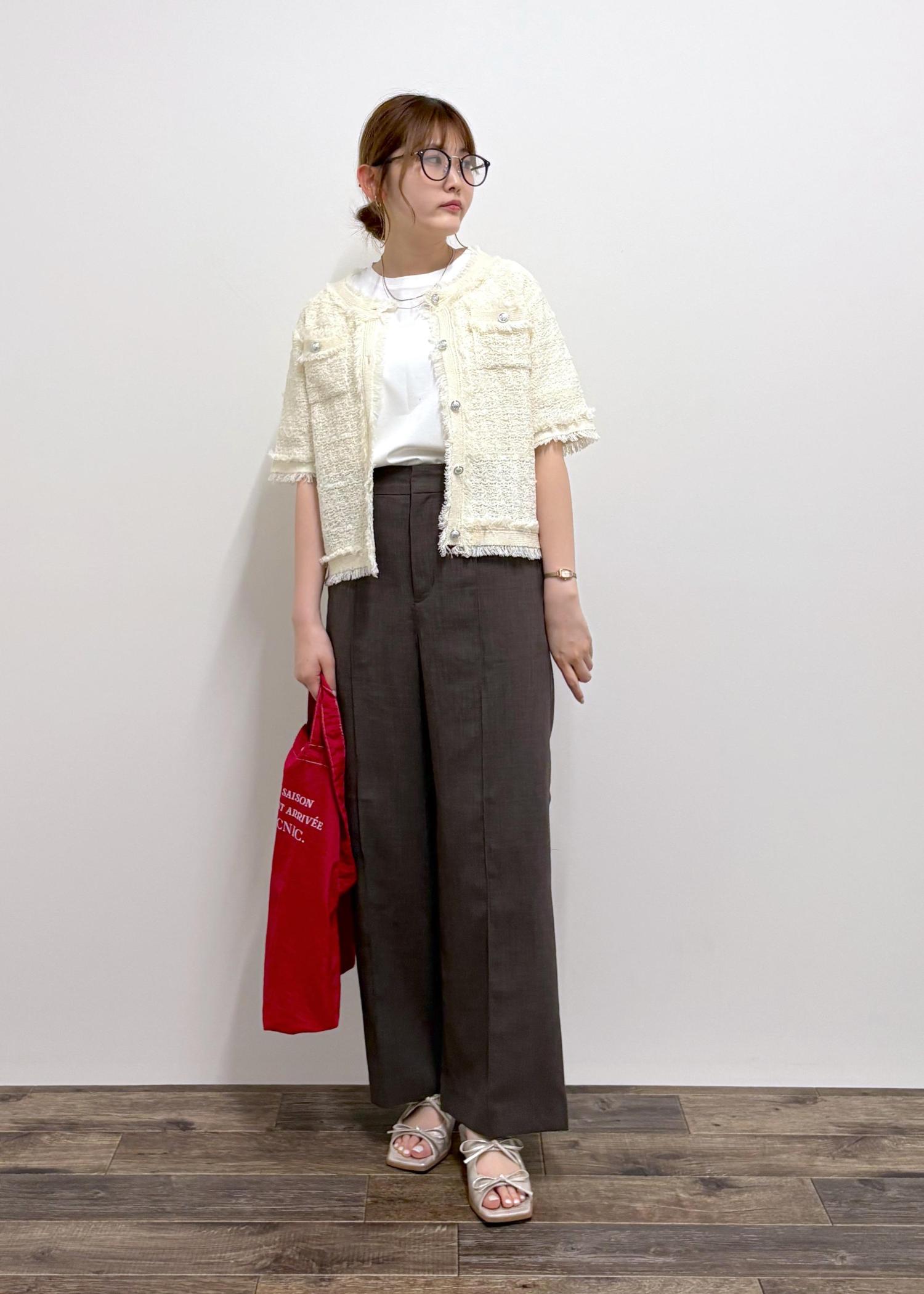 キレイめになりがちなツイードカーディガンをカジュアルに着こなしたスタイル。