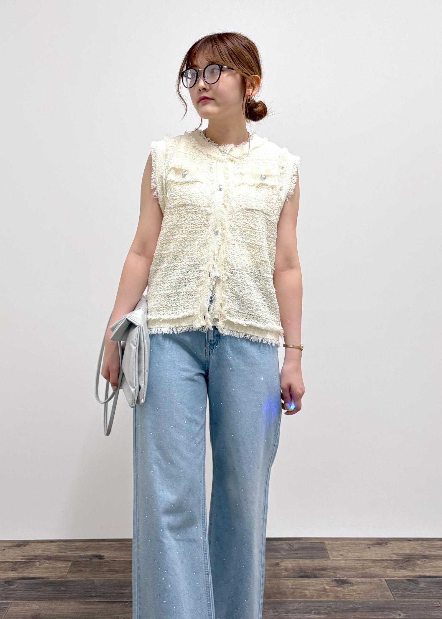 今年オススメのツイードジレをカジュアルに仕上げたスタイル。