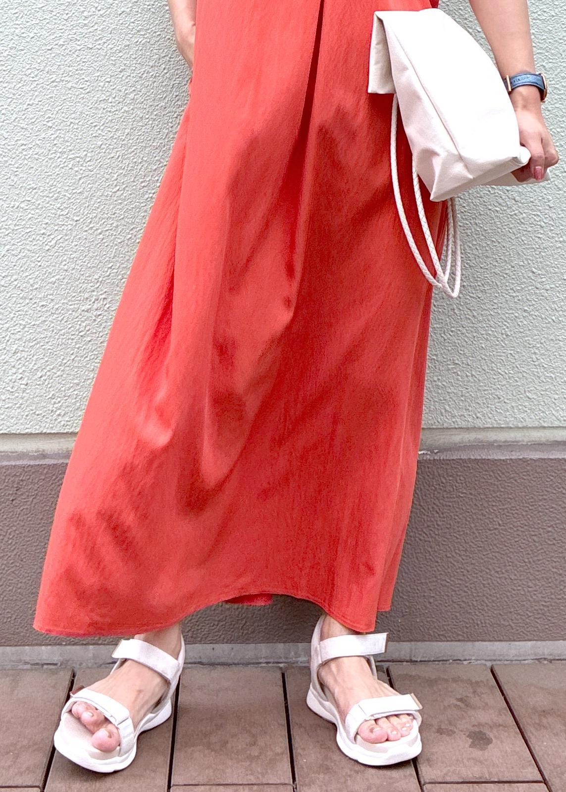 太陽のような絶妙なオレンジがかわいい!色が主役なワンピースは写真映えもばっちり。リラックスして楽しみたい旅行や女子会にもぴったりです。夏にうれしいポケット付き。着丈が不安な方にはスポーツサンダル合わせがおすすめです。