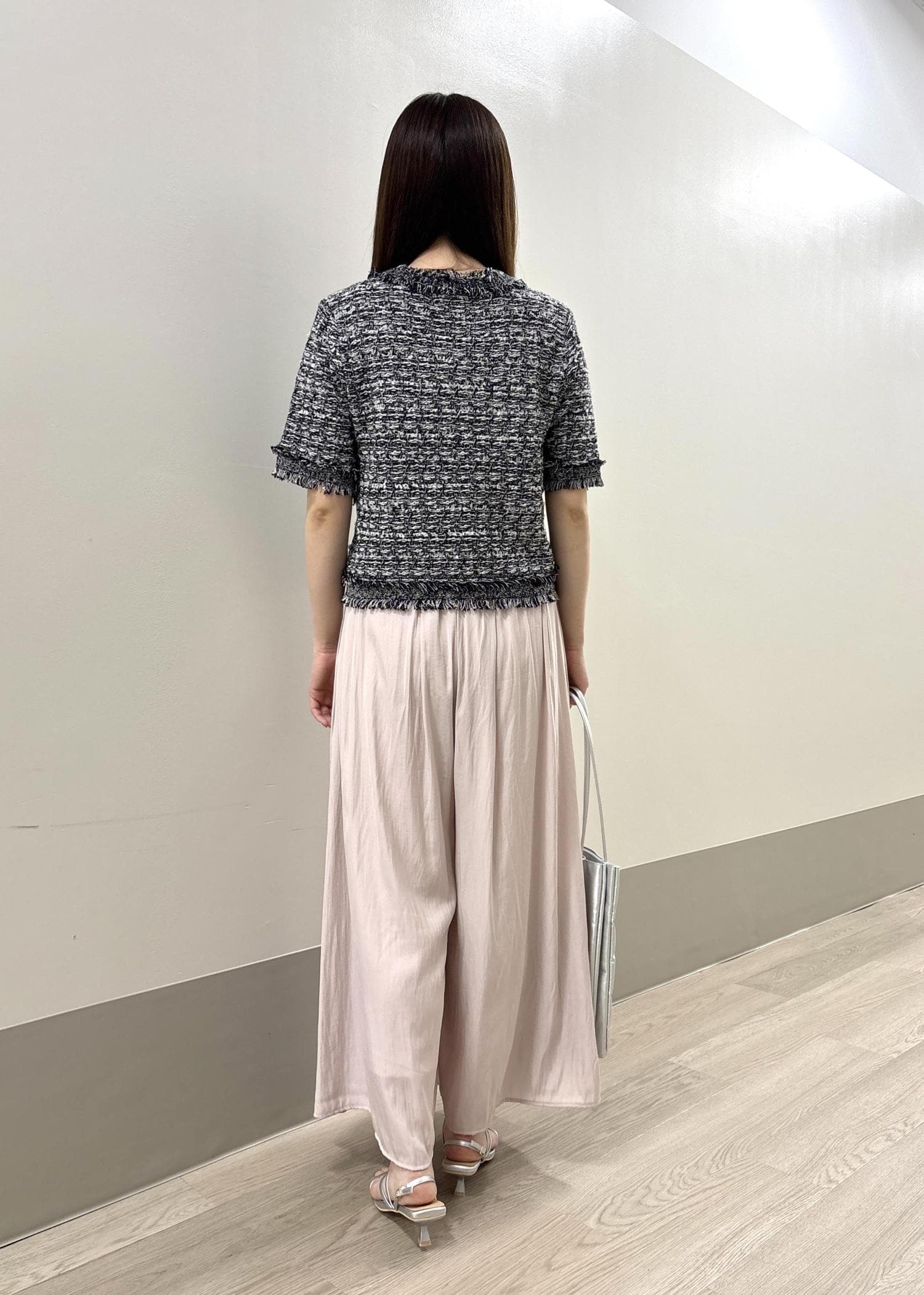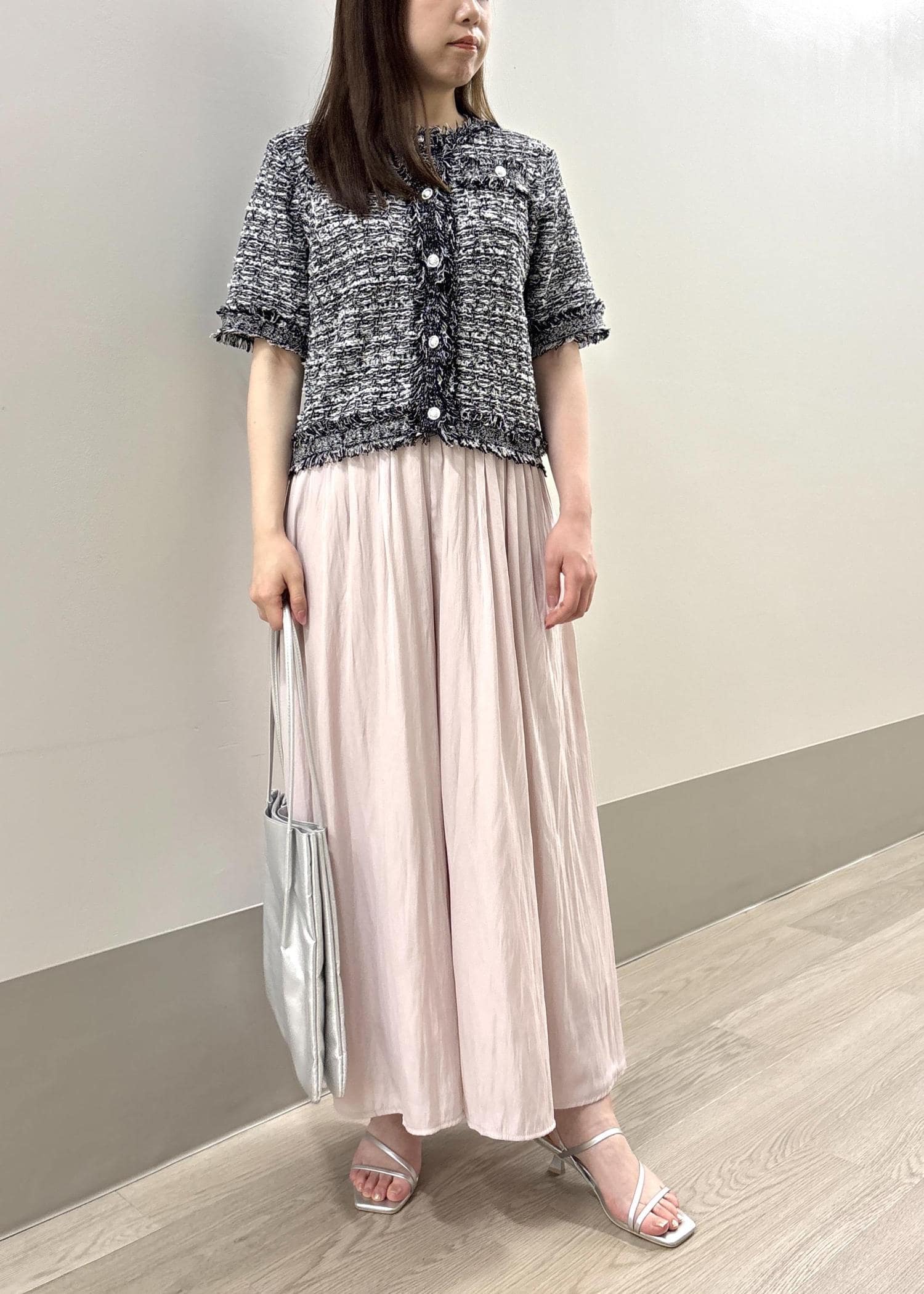 ツイードが華やかさを出してくれるのでカジュアルすぎないコーデになります。スカーチョもさらっとしておりこれからの暑い時期にぴったりです◎