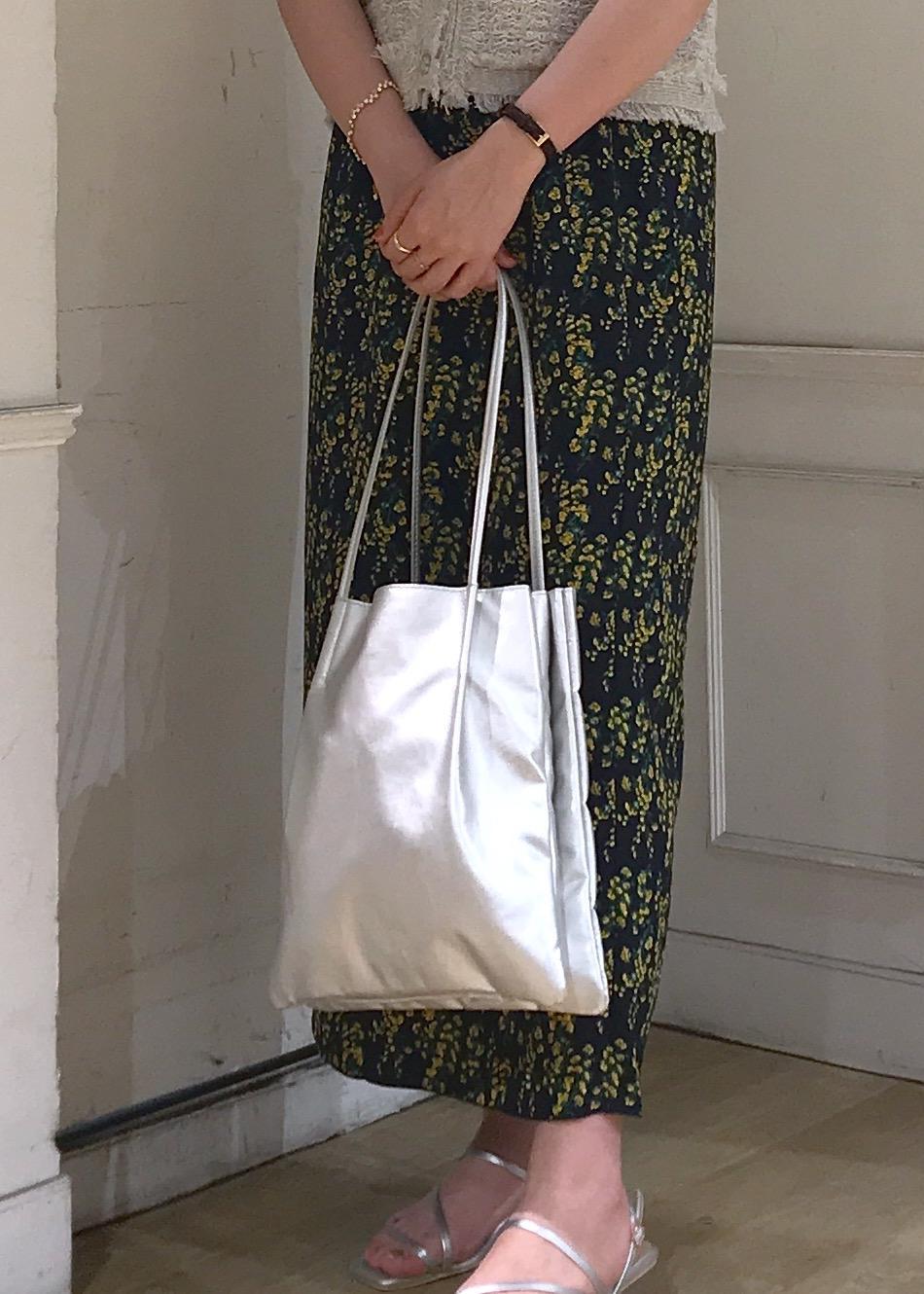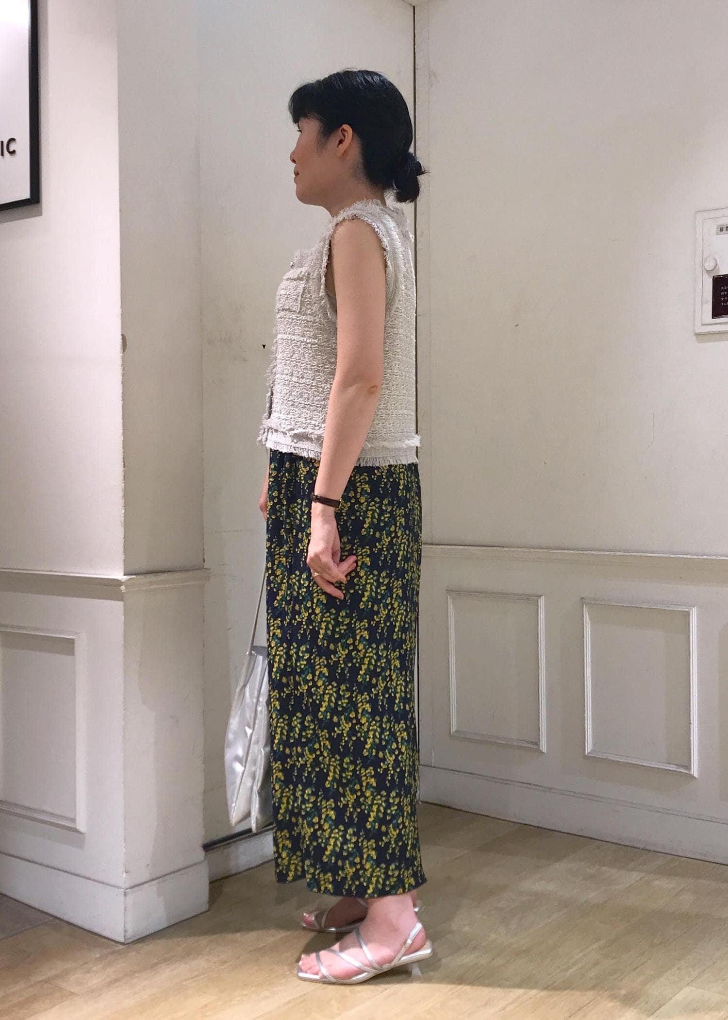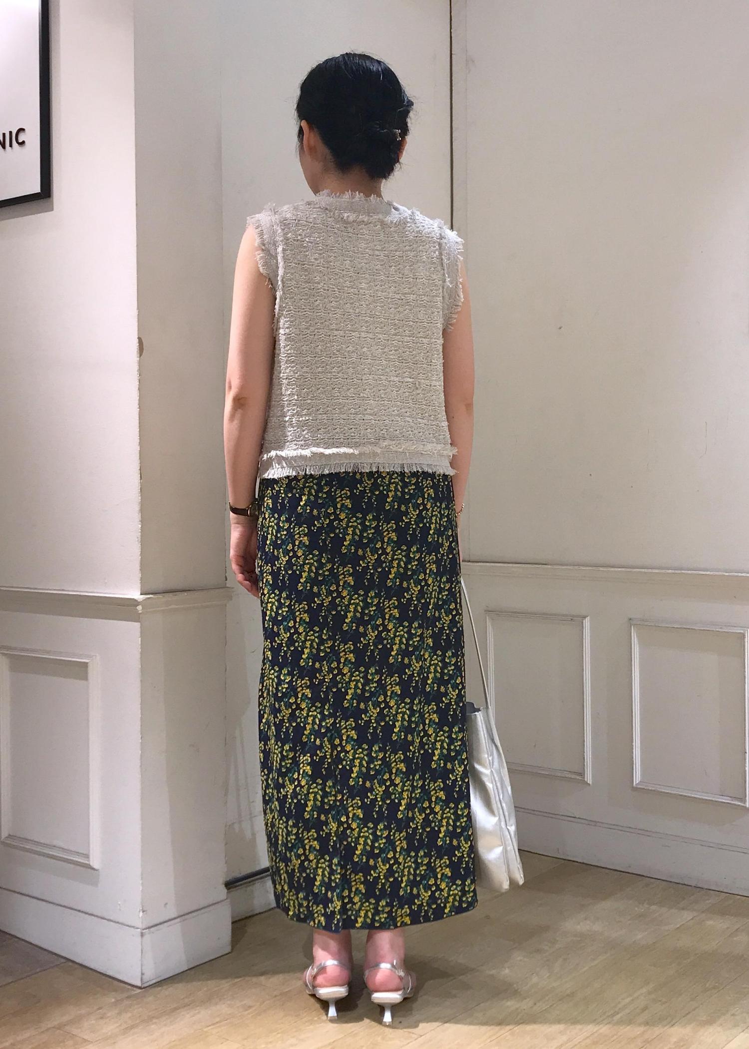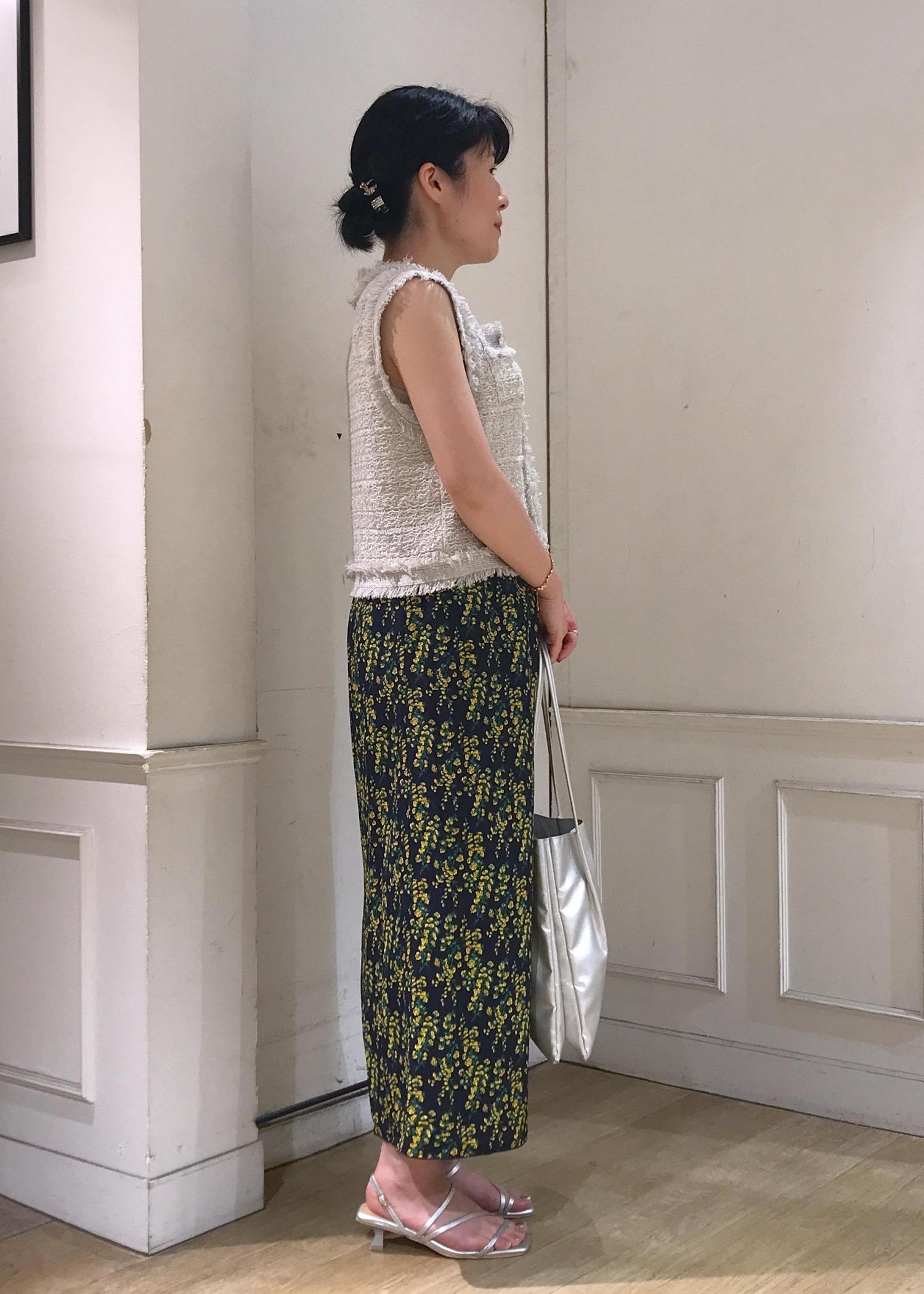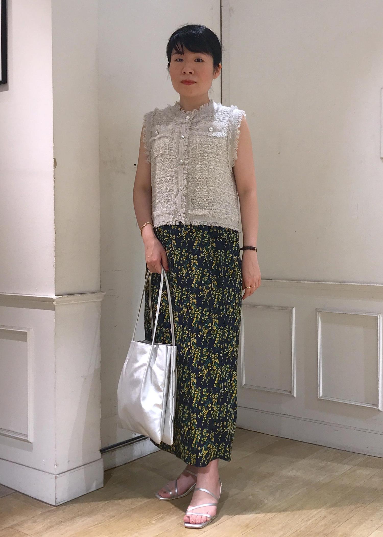 ツイードジレに花柄スカートを合わせて大人フェミニンを意識しました。グレーとネイビーの落ち着いた配色でもフリンジや花柄等で華やかな着こなしになるようにしました。