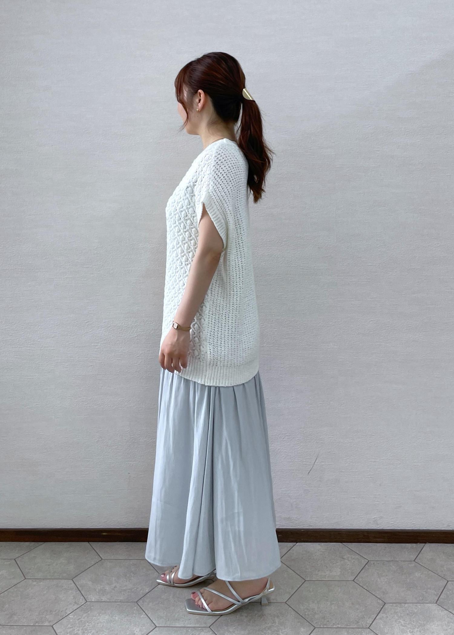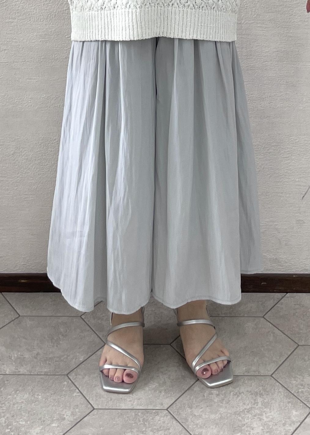ミントグリーンのスカーチョがとても綺麗で女性らしさを演出してくれます!少し透け感があるトップスと小物をシルバーでまとめて、夏らしくしました!