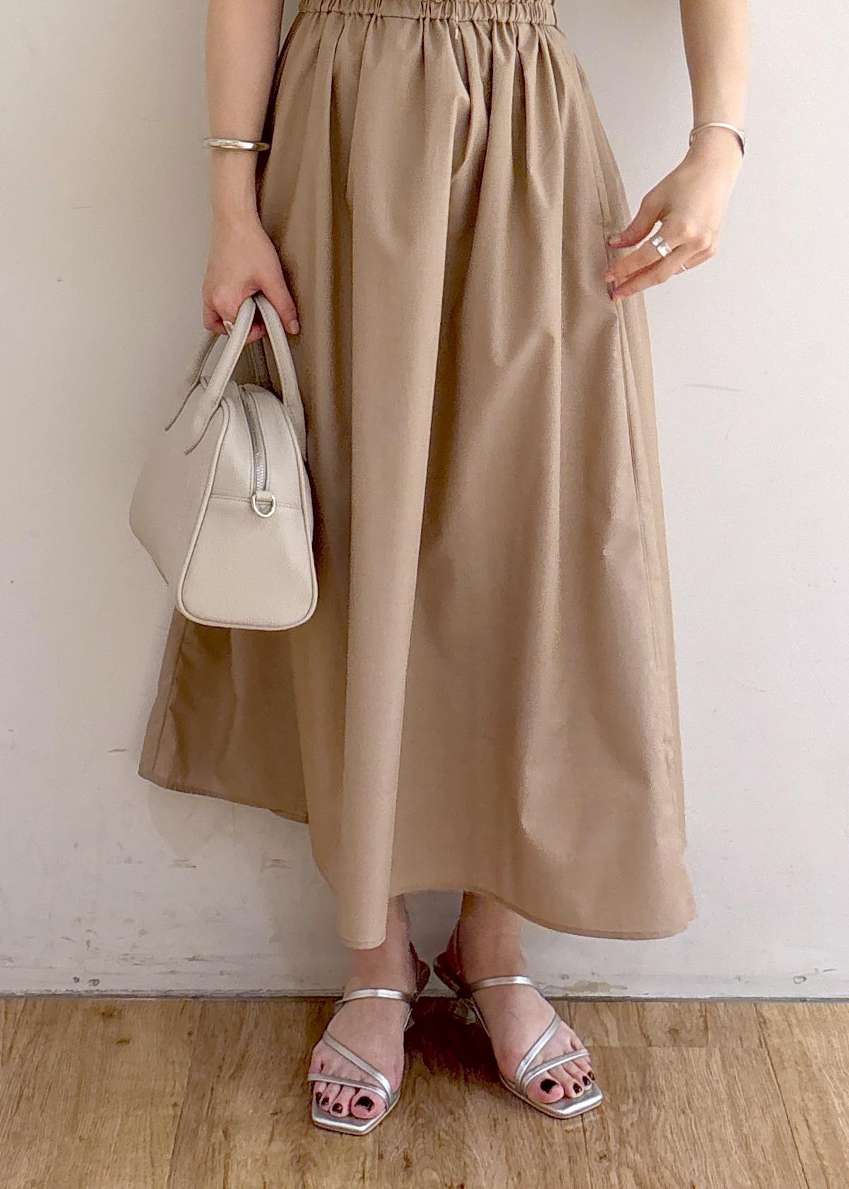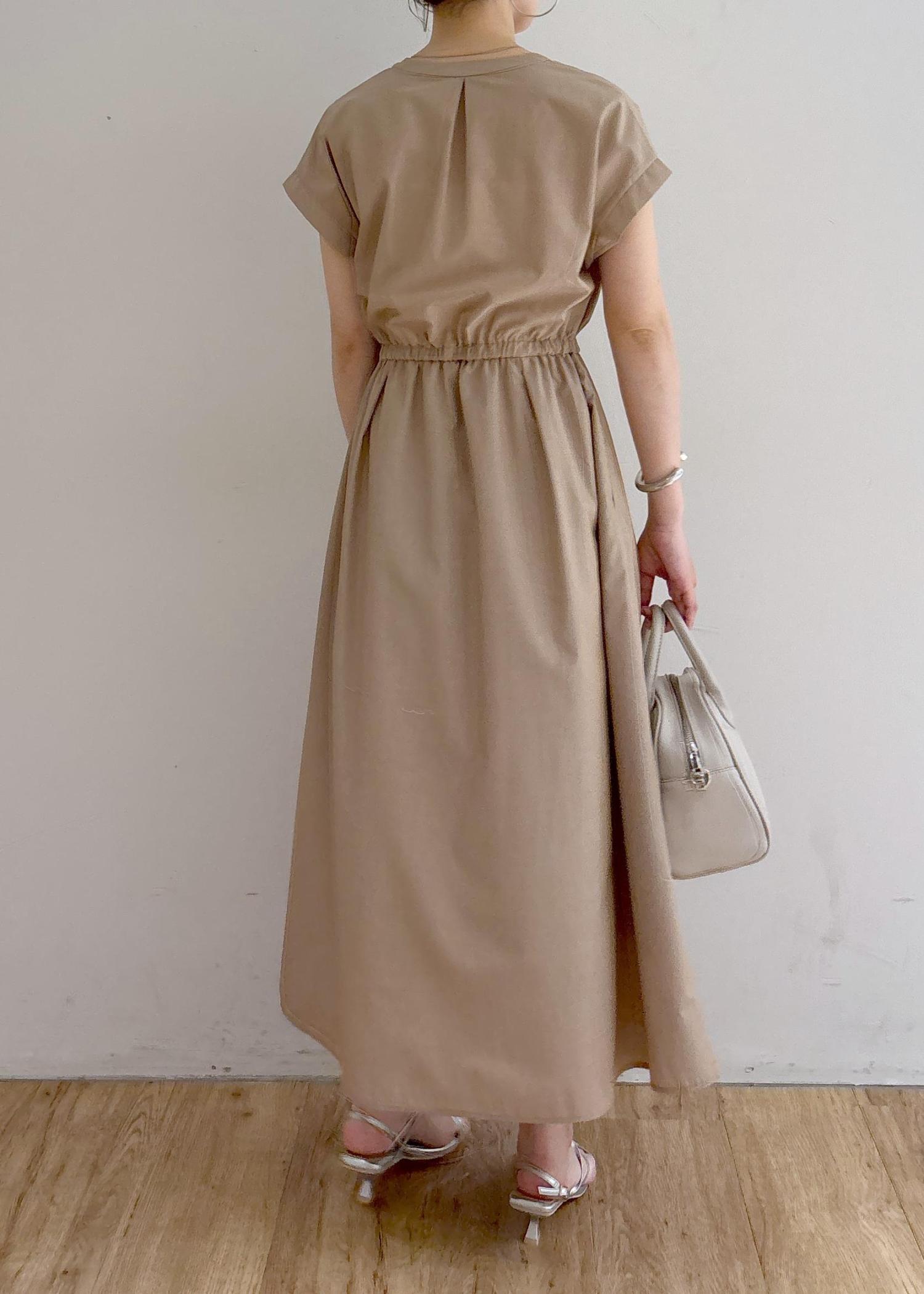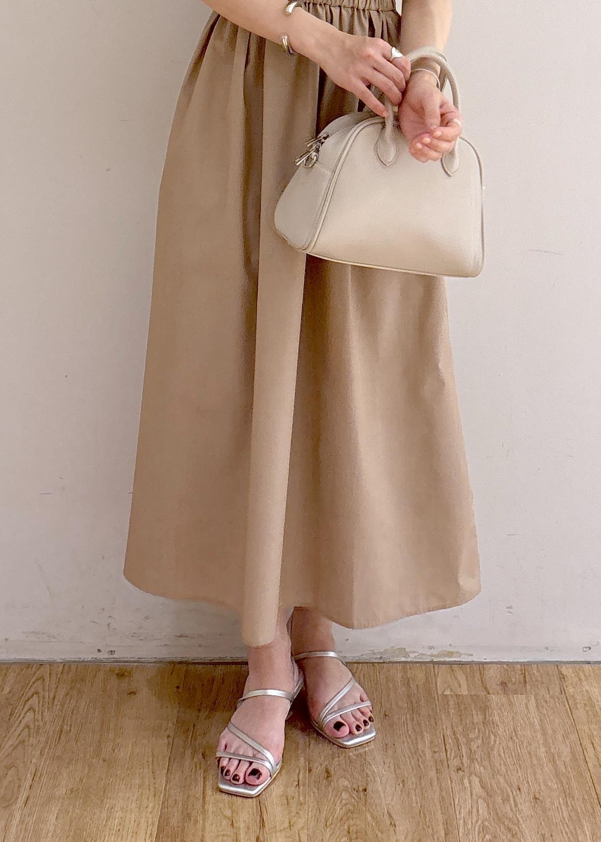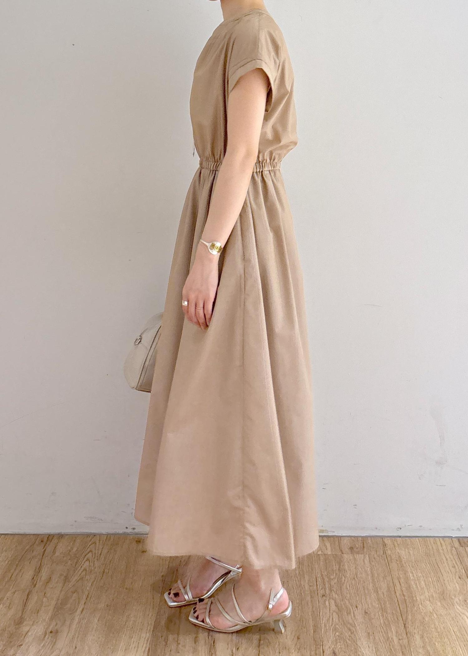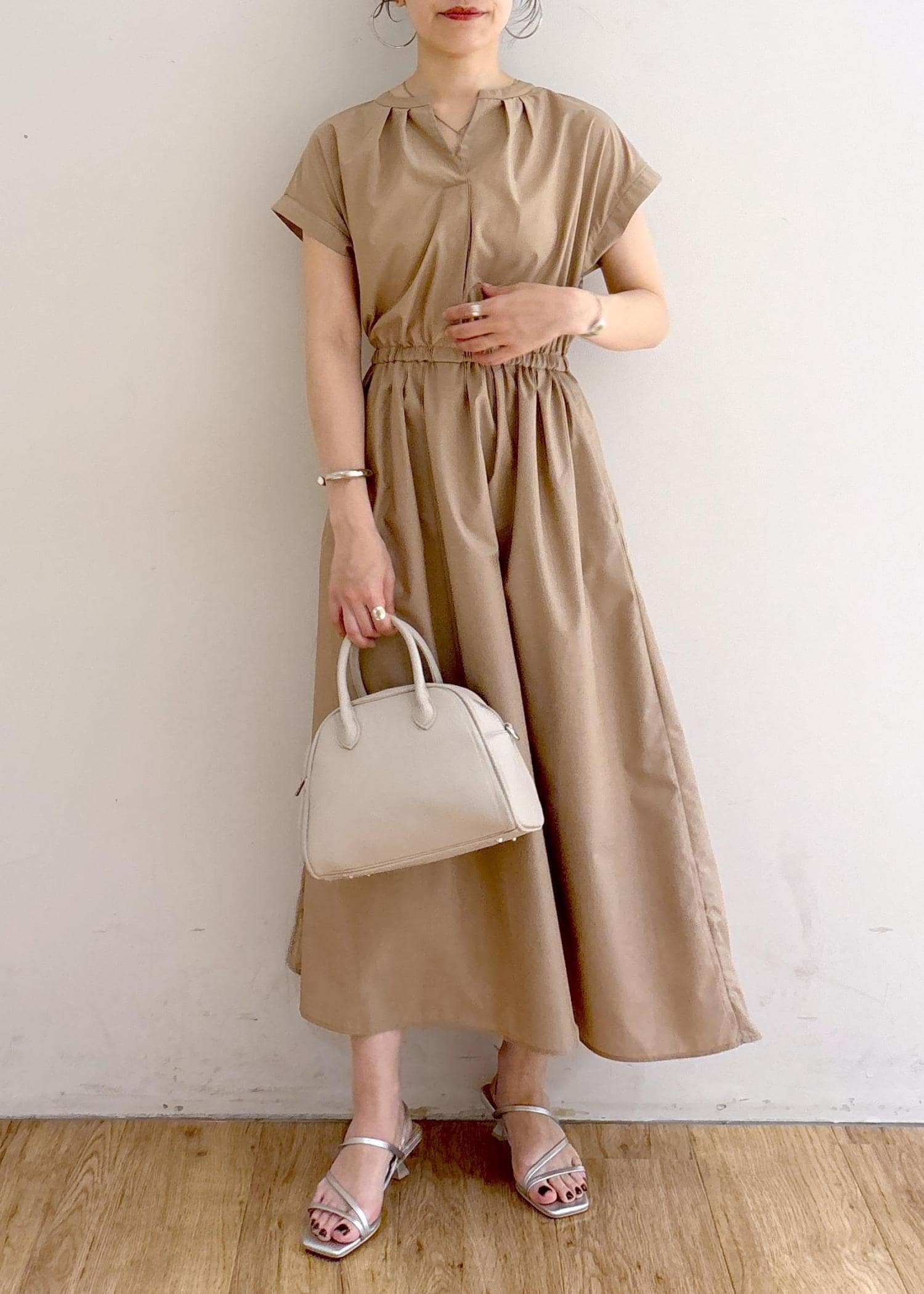 ウエスト切り替えが上品な印象のワンピースです。小物もきれいめに合わせてワントーンのスタイリングにしました。ワンピースは軽い張りのある素材で形がきれいにでます◎