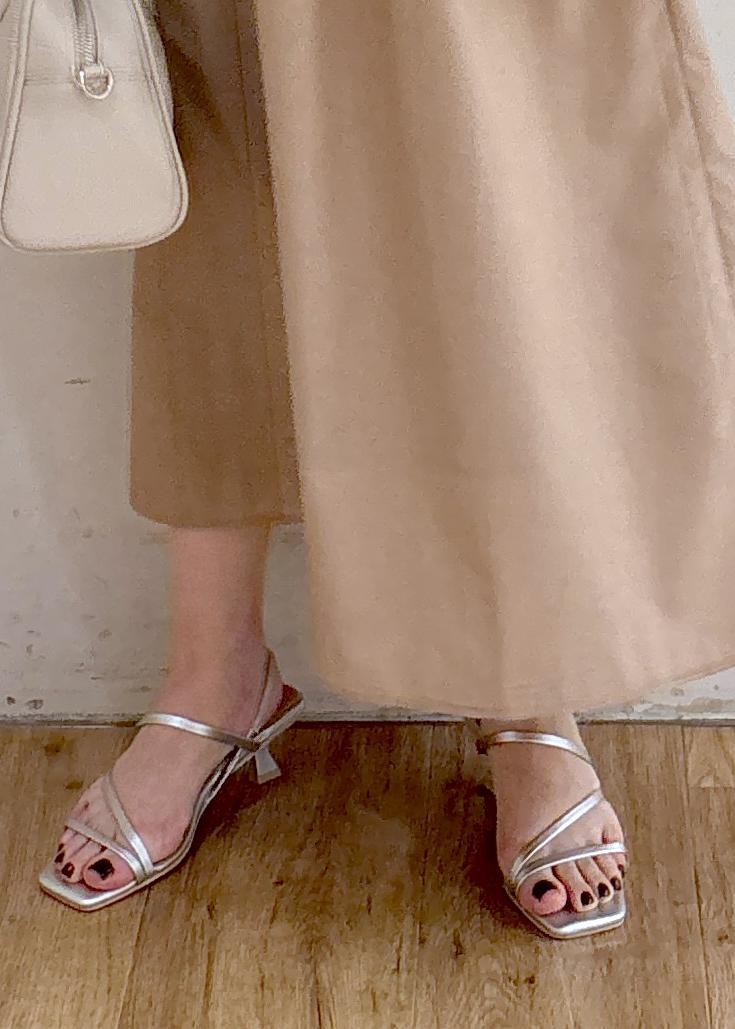 シンプルなサンダルです。私の足は22.5cm〜23cmで、Sサイズで脱げる感じなく履けました。ヒールも高過ぎないので歩きやすいです。