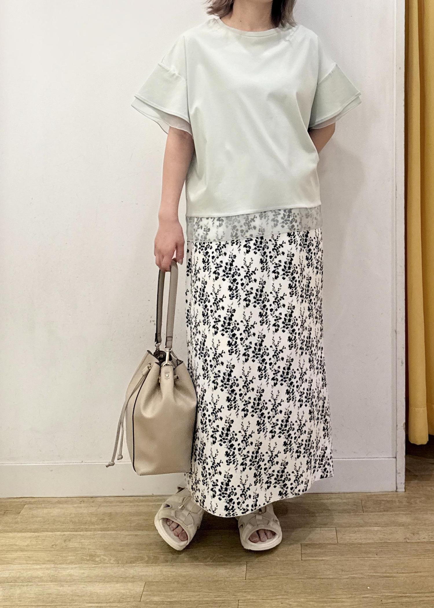 ライトグリーンと花柄スカートの爽やかなコーディネートはカジュアルですが女性らしい印象に☺︎