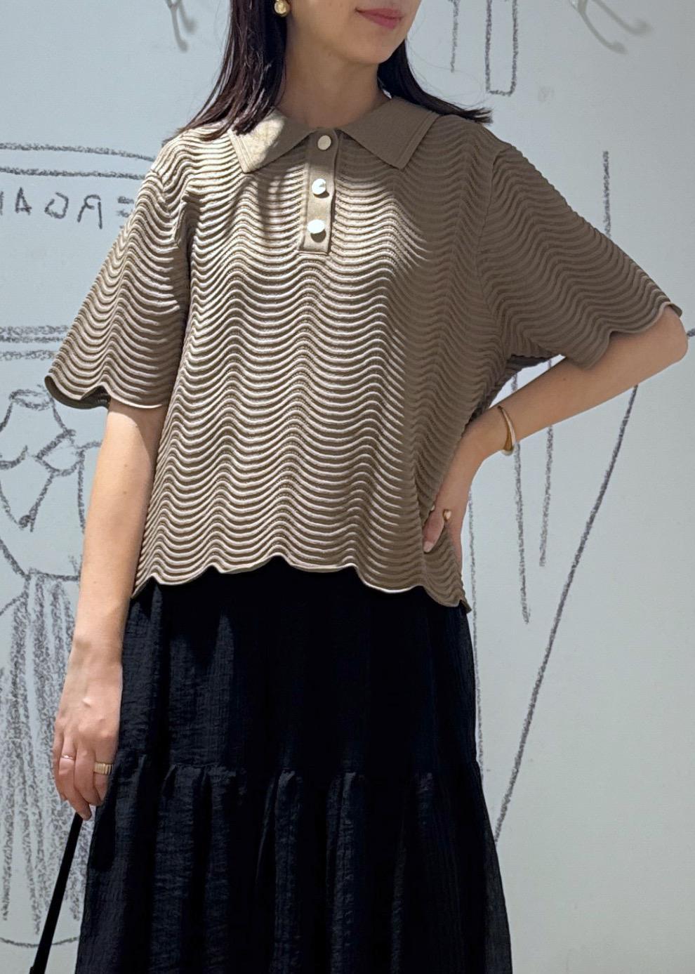 ROPÉ PICNICリップル風襟付きサマーニットプルオーバーカーキ / 38¥5,489レビュー身幅・袖幅はたっぷりしているので動きやすいです。裾のスカラップデザインが女性らしくポイントになります。着丈はちょうど腰を覆うくらいなのでコーディネートのバランスが取りやすい長さです。