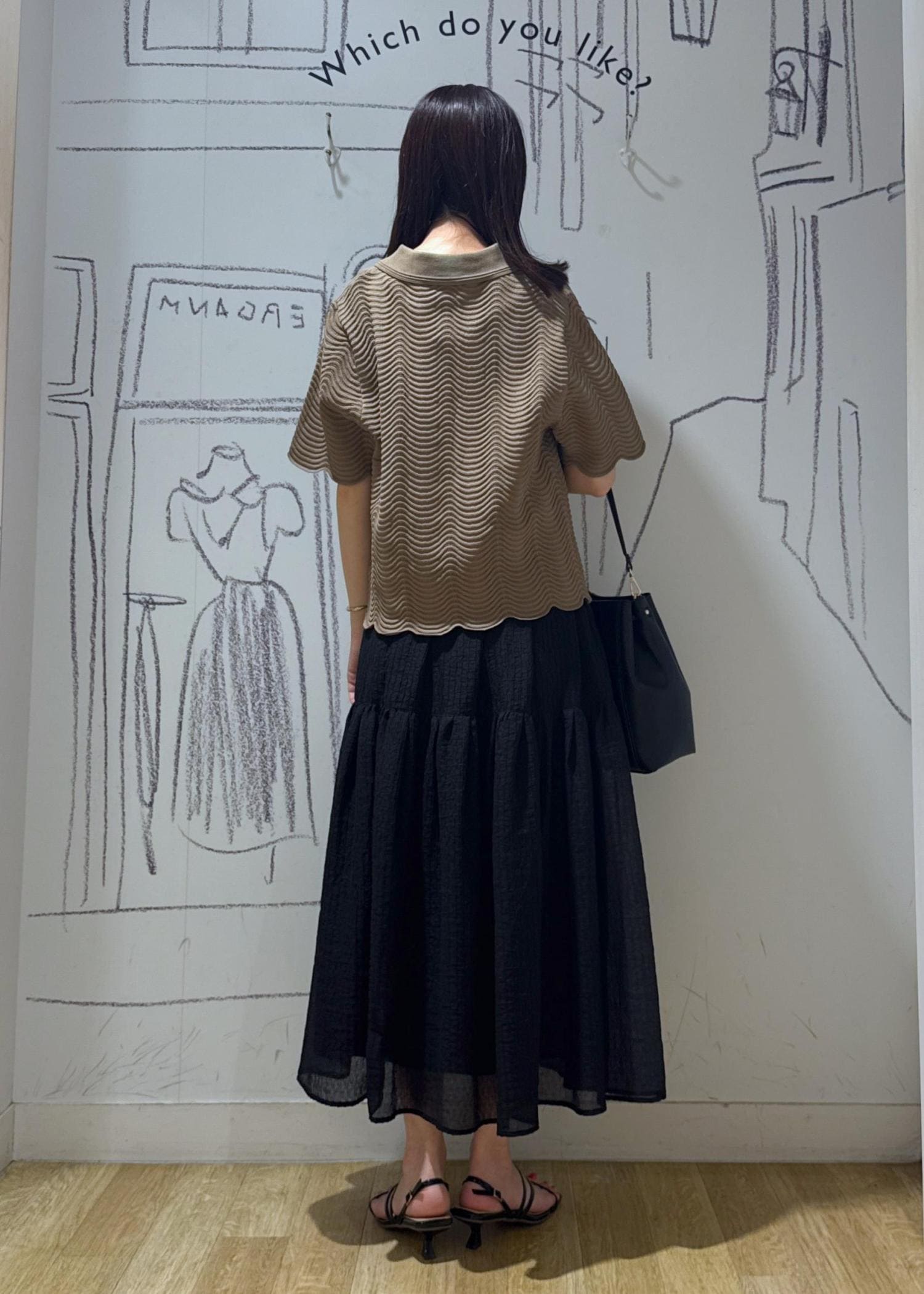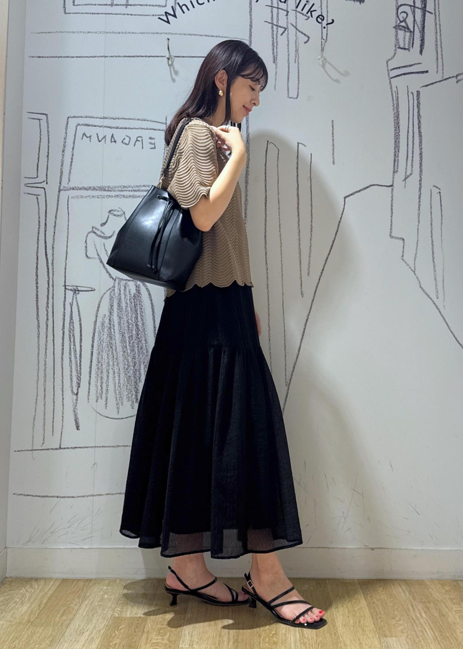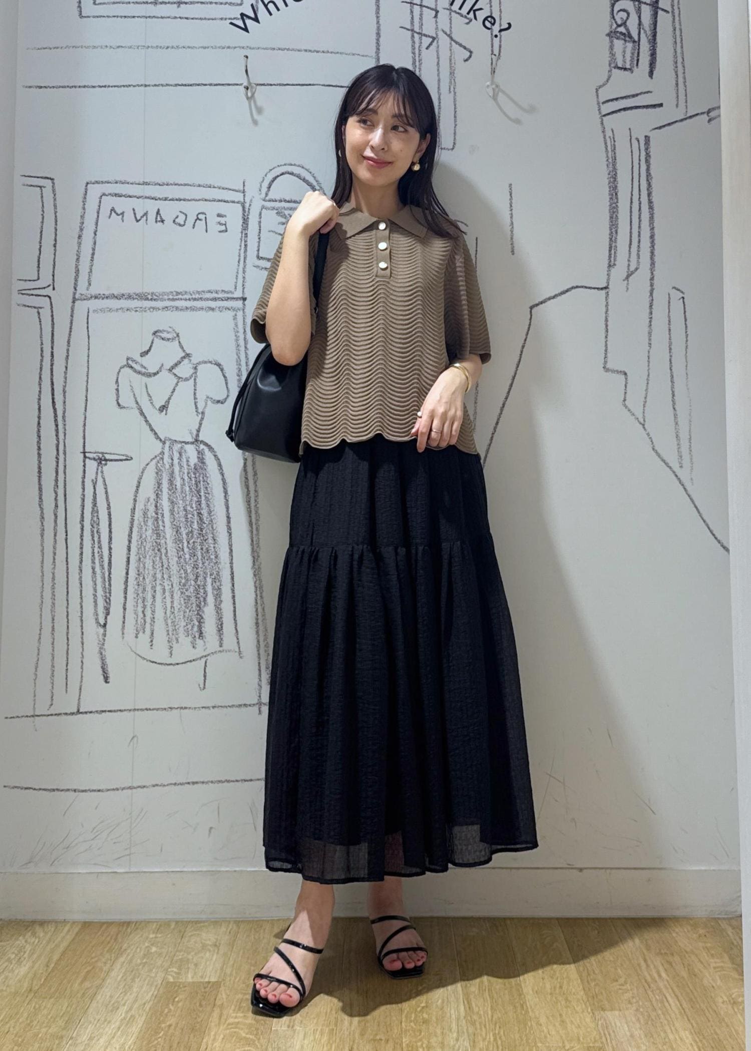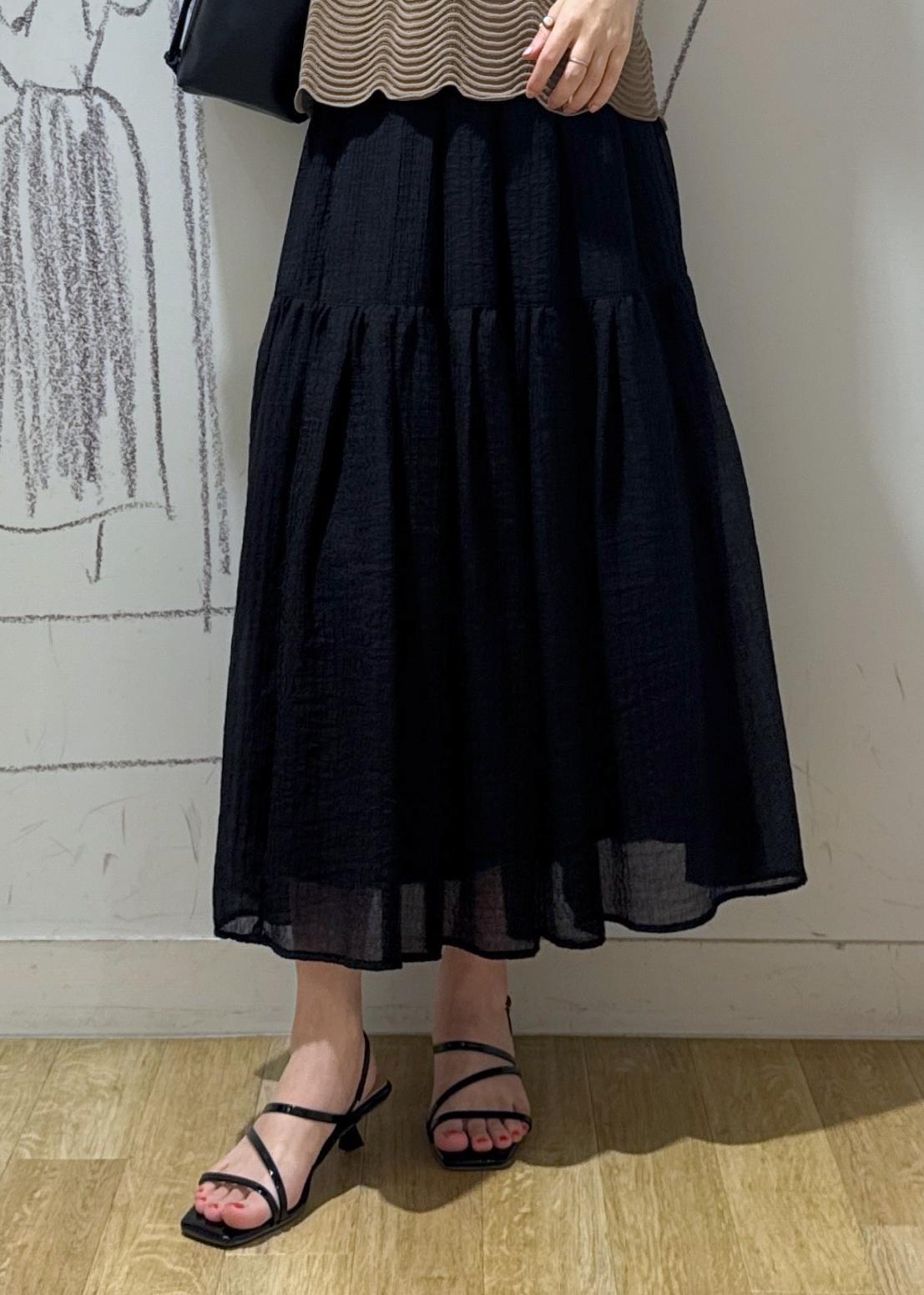 ROPÉ PICNICシアーティアードスカートブラック / 38¥5,995レビュー総ゴムなので楽な履き心地。裏地はスカート丈とほぼ同じ長さになるので膝下辺りのラインが透けず安心感があります。太ももからの切替えデザインで程よくボリュームが出て華やぎます。