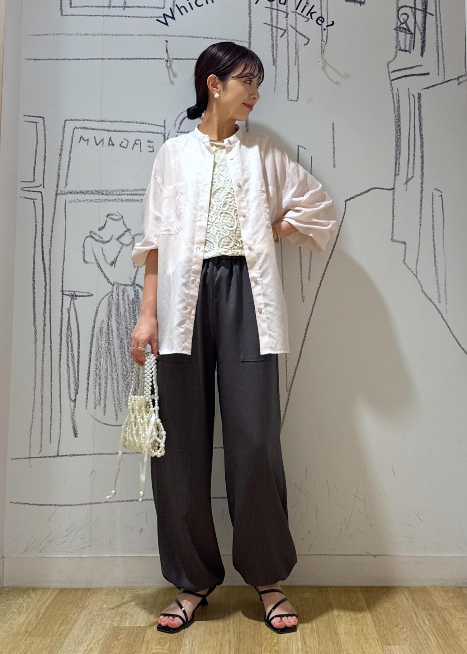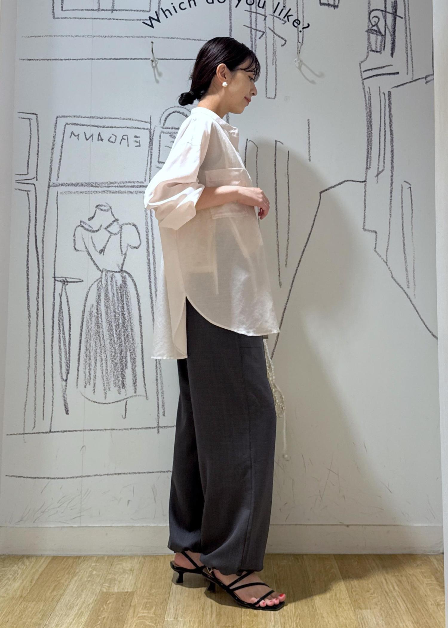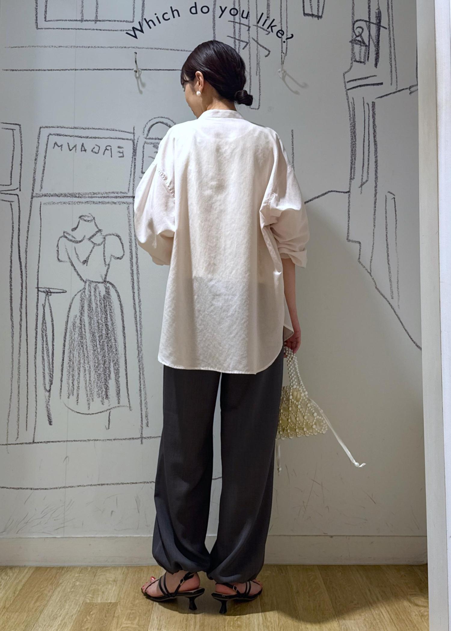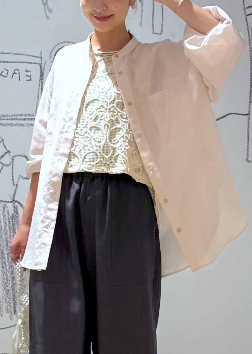 透け感があり、見た目にも清涼感が抜群です。着丈が選べ、こちらはお尻が隠れる長さです。袖はまくるとぽわんとボリュームが出て可愛いです♪ノーカラーデザインなのでかしこまらずリラクシーな印象。
