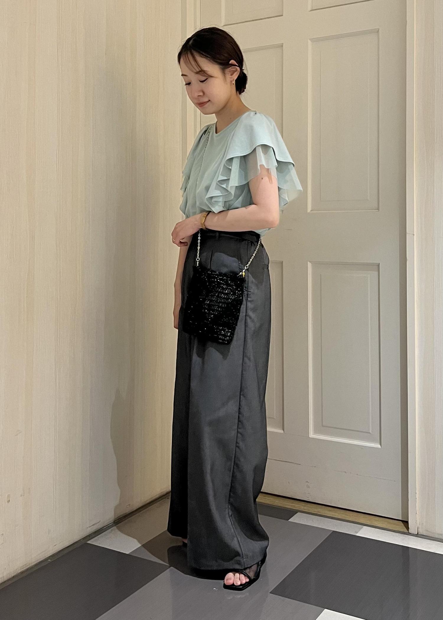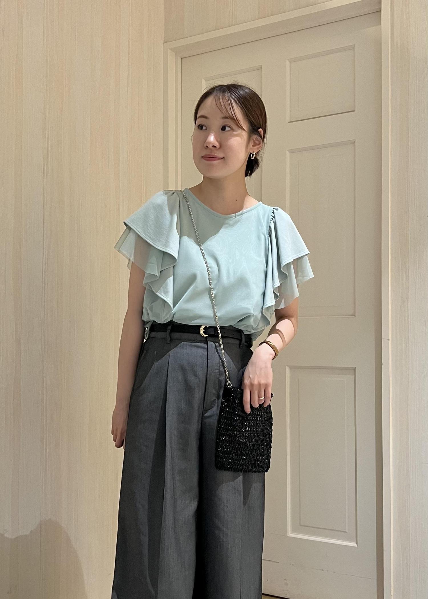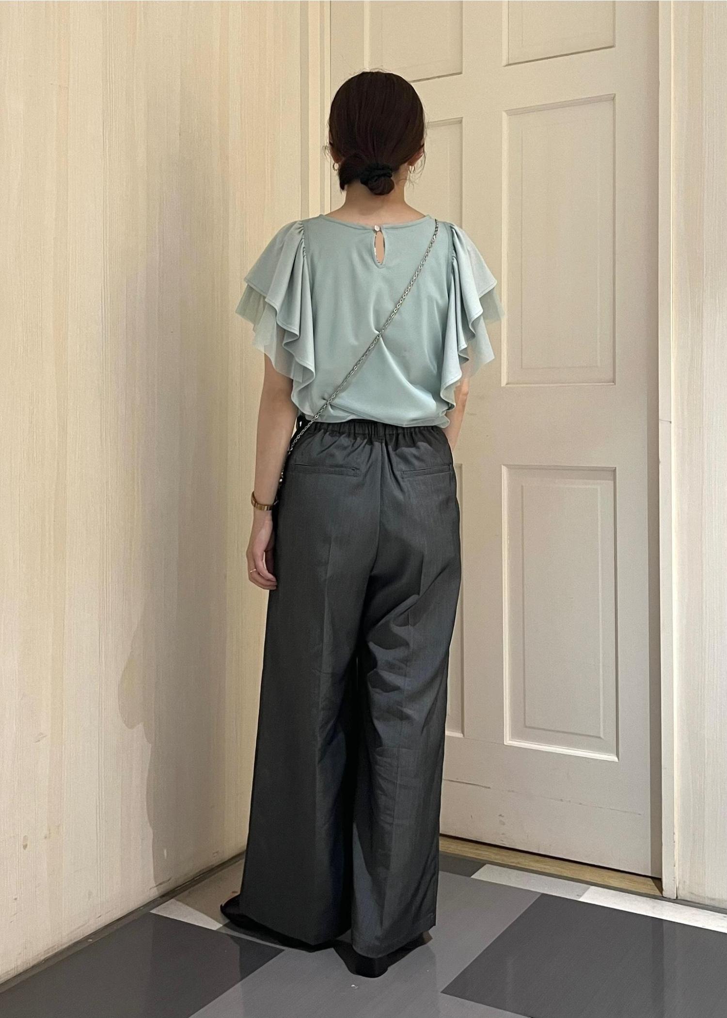 フリルトップスにシャンブレーのワイドパンツを合わせました!