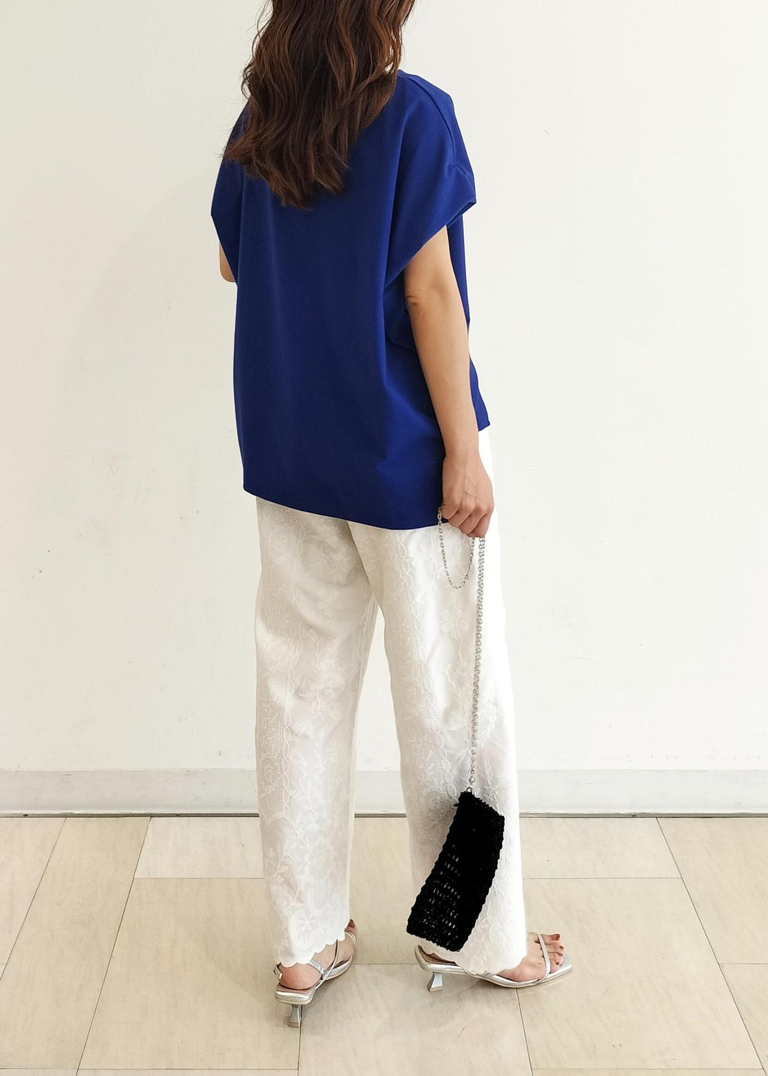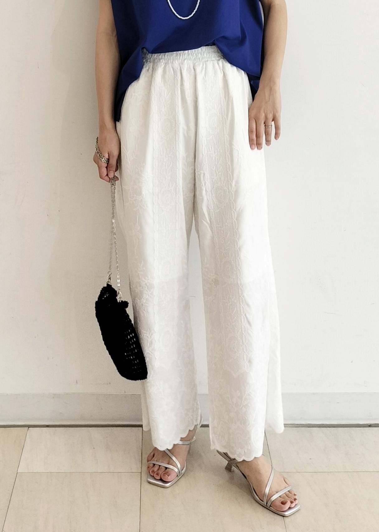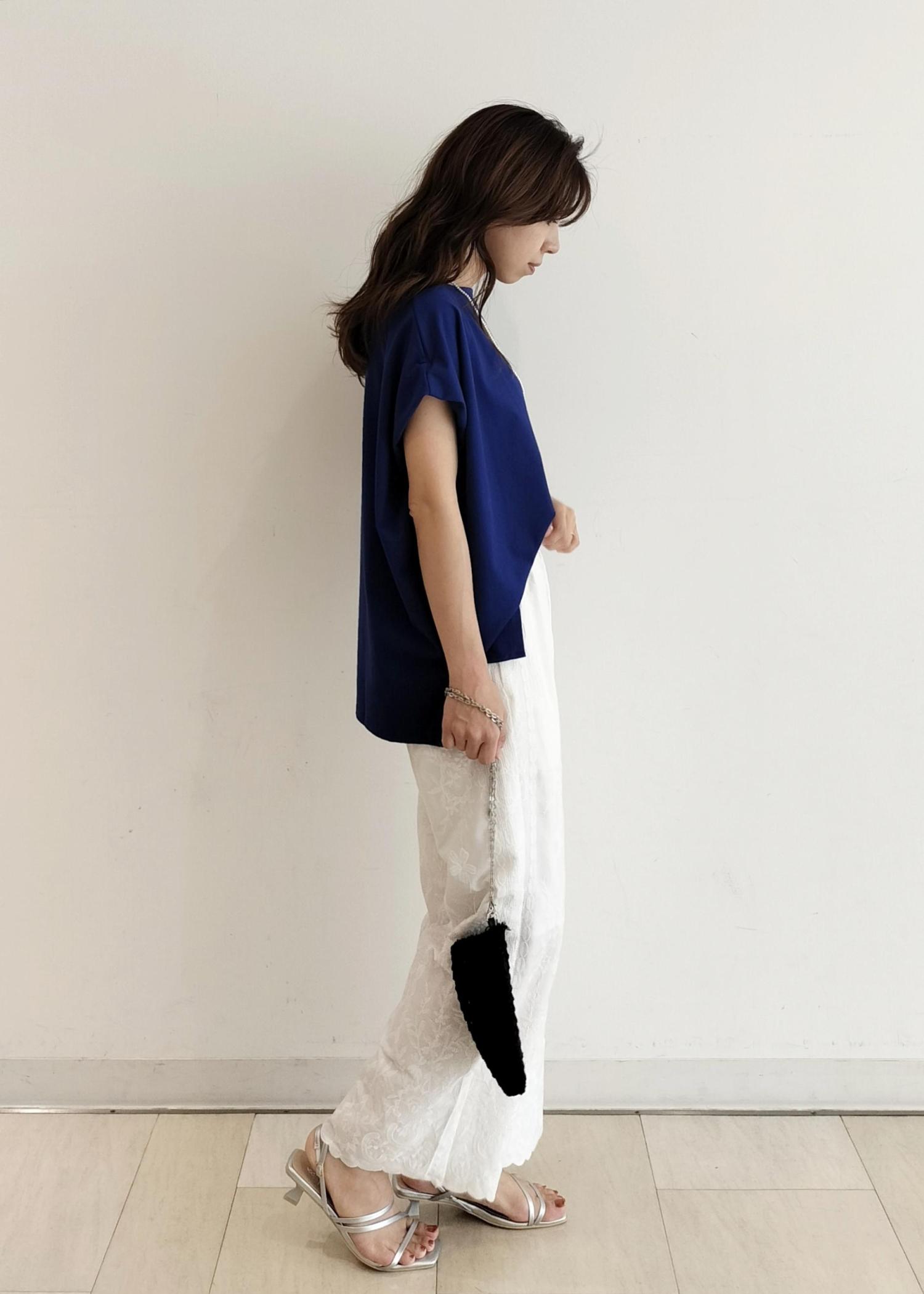 シンプルなコーディネートですが、ニュアンスのあるシルエットのTシャツは一枚でおしゃれに決まります。表面感のある刺繍レースパンツを合わせて真夏にぴったりなコーディネートにしました✨