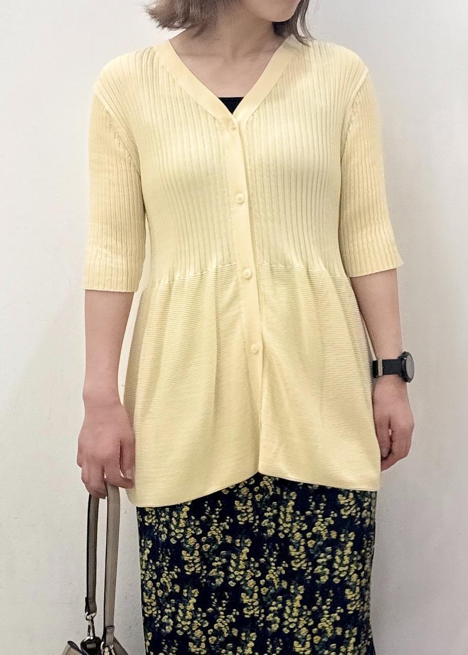 カーディガンとしても、釦を閉めてトップスとしても着られる着回し力の高いアイテムです。