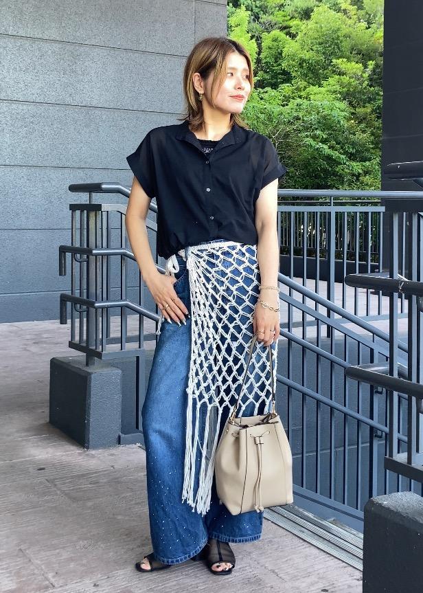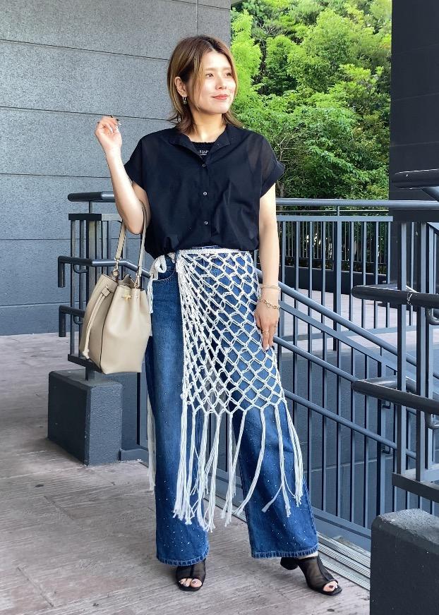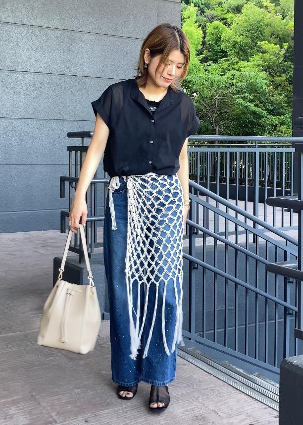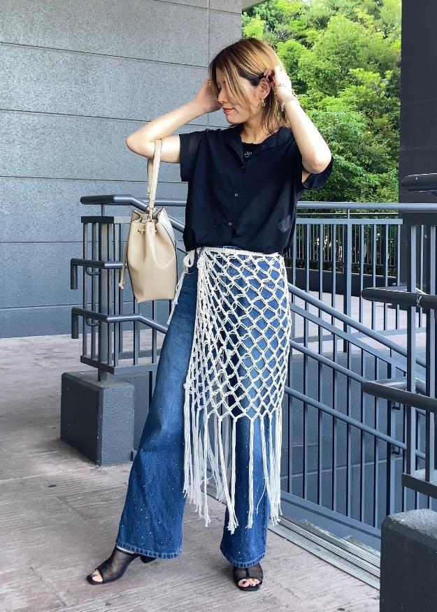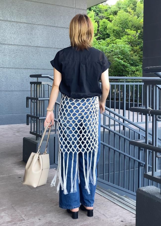 いつものデニムコーディネートにかぎ編みの巻きスカートをレイヤードしたカジュアルコーディネートです。