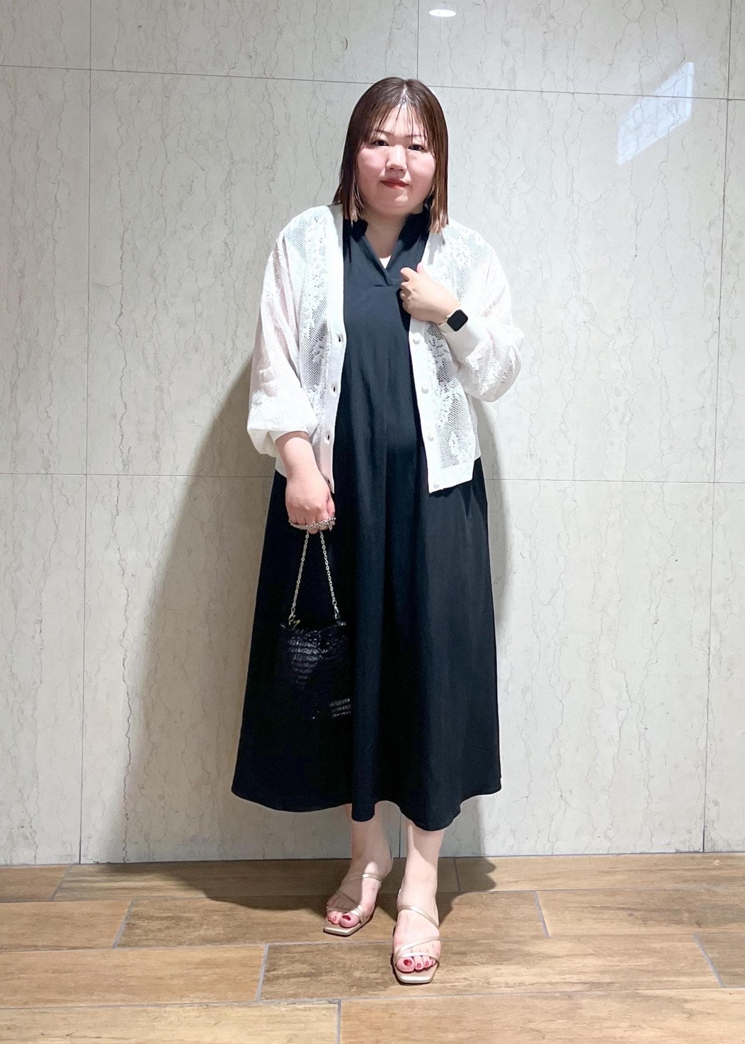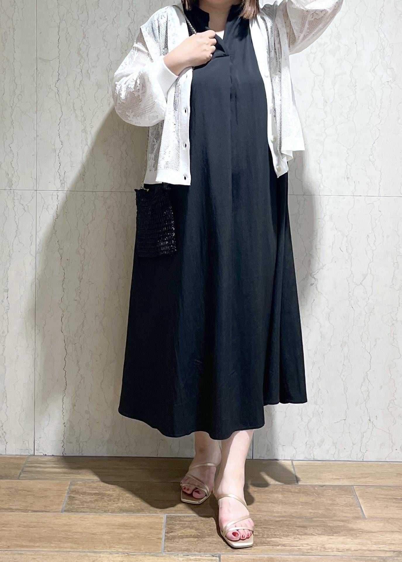 暑い夏にピッタリなリラックスワンピースに透かし編みカーディガンを合わせたお出かけコーデです。