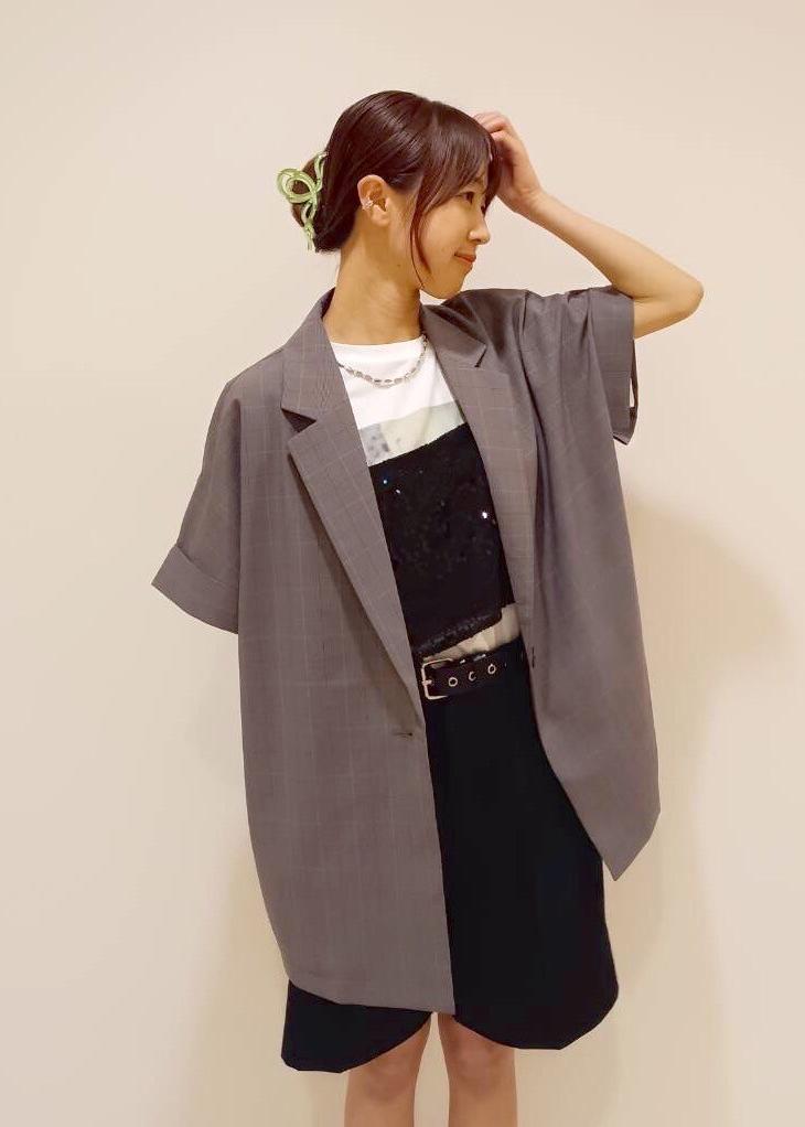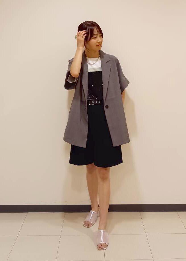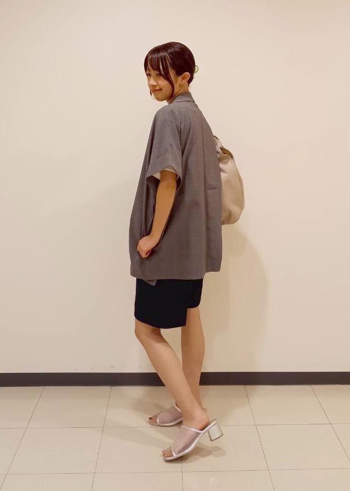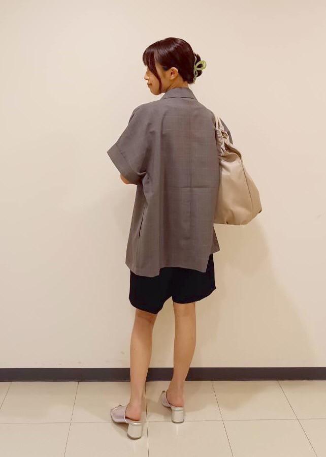 ジャケットはゆったりめのサイズ感なので低身長の私は少しでもスッキリ見えるようにハーフパンツにサンダルを合わせました!