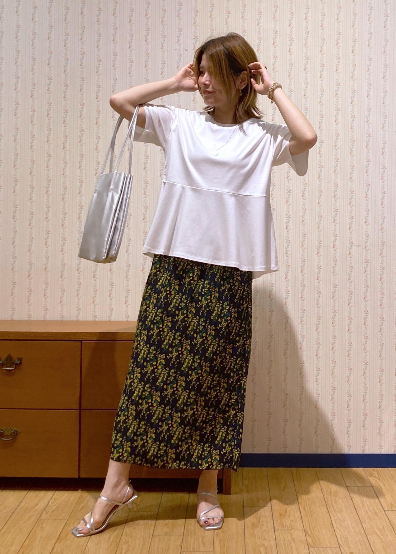 縦のラインを意識するために長めのネックレスと落ち感のあるスカートでスッキリ見えるように気をつけました!