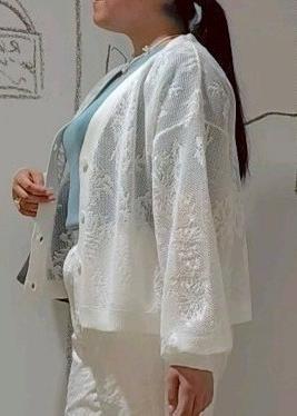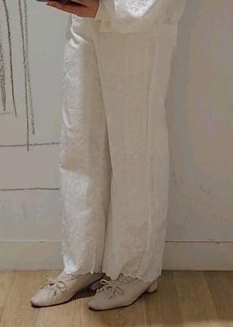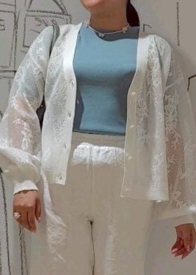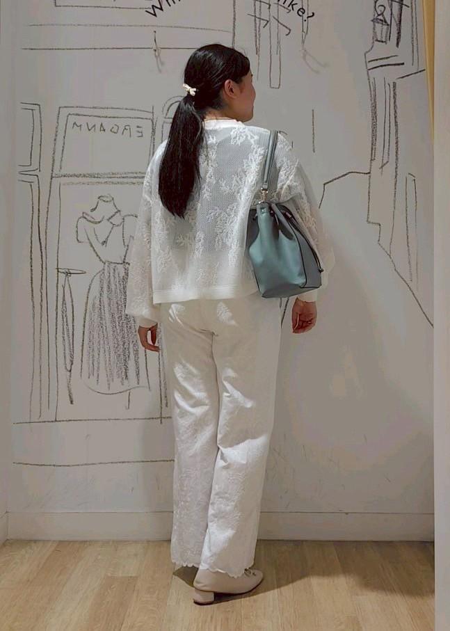 レースのカーディガンと刺繍のパンツを合わせた色も素材感も涼しげなコーディネートを組んでみました。