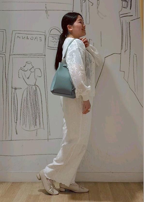 ブルーっぽいグリーンが夏らしくて好きなので、ニットとカバンで合わせて、カーディガンとパンツでレースを合わせてみました。