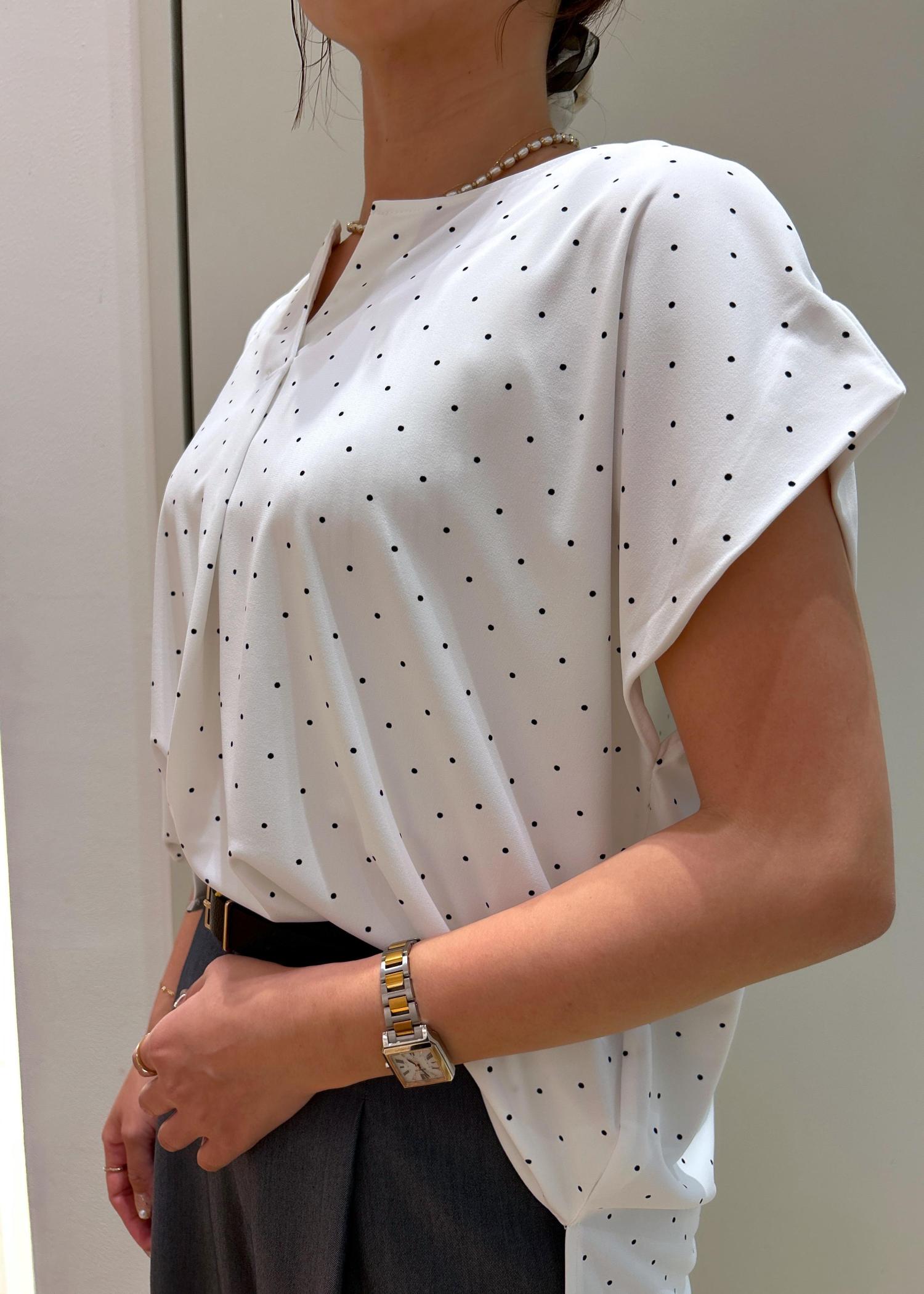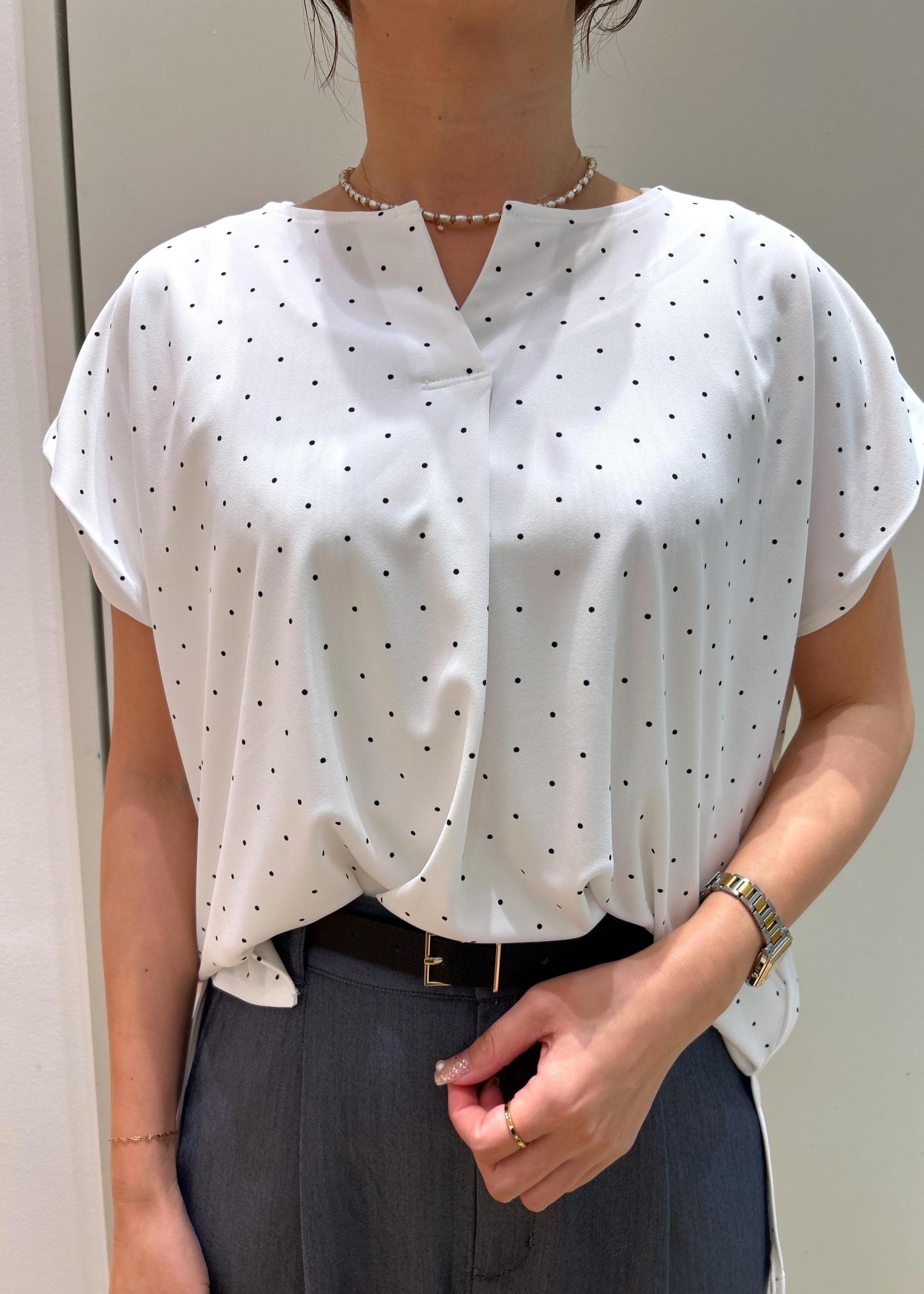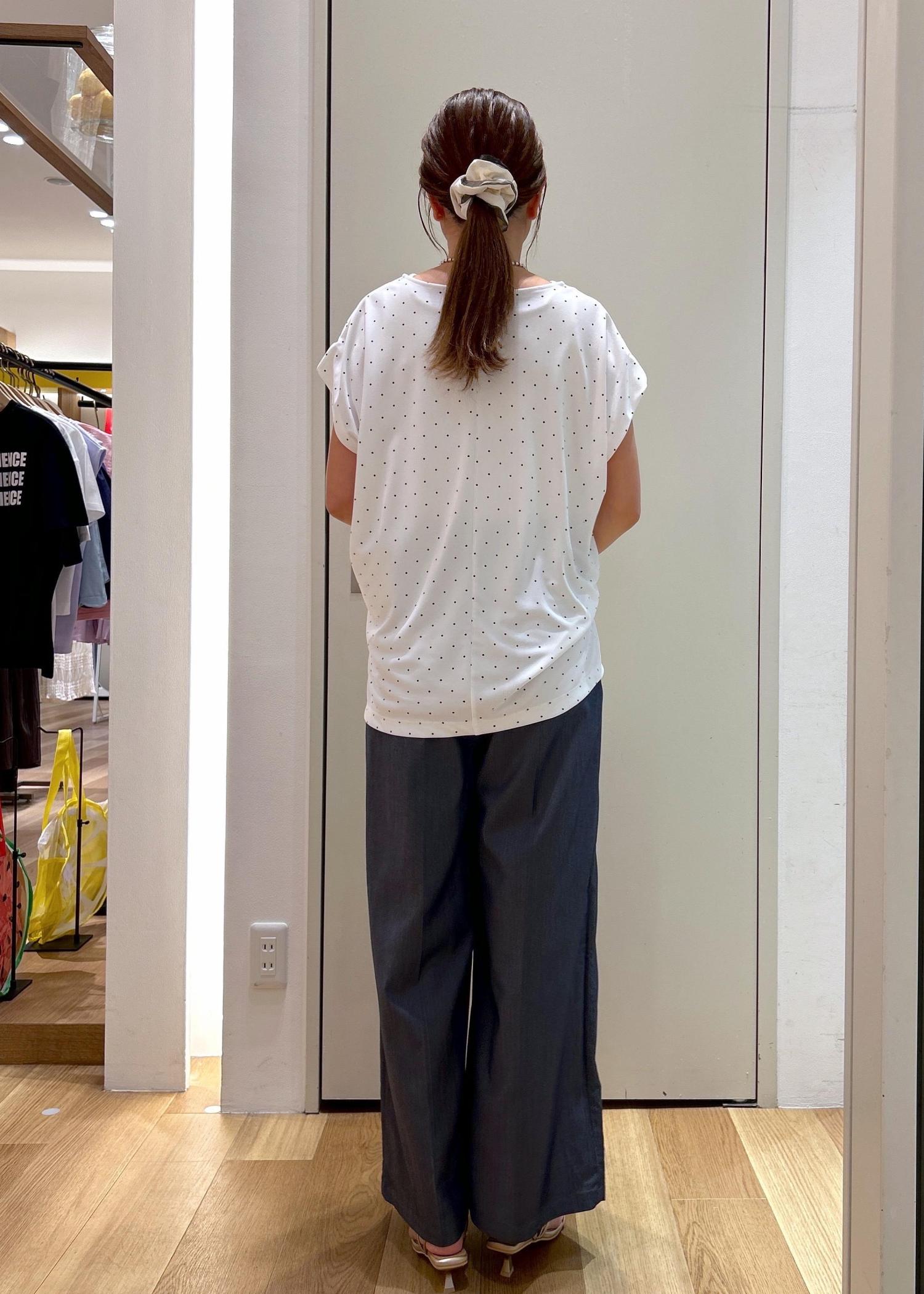 ドット柄のトップスにワイドパンツを合わせたキレイめコーデです。