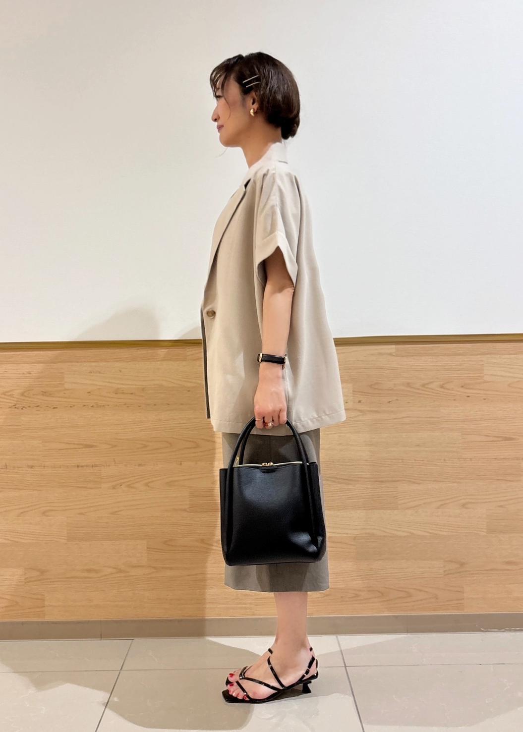 すっきり華奢見えするナローストラップのサンダルと、スクエア型で収納力抜群のバッグは黒で統一して、きちんと感を意識しました。