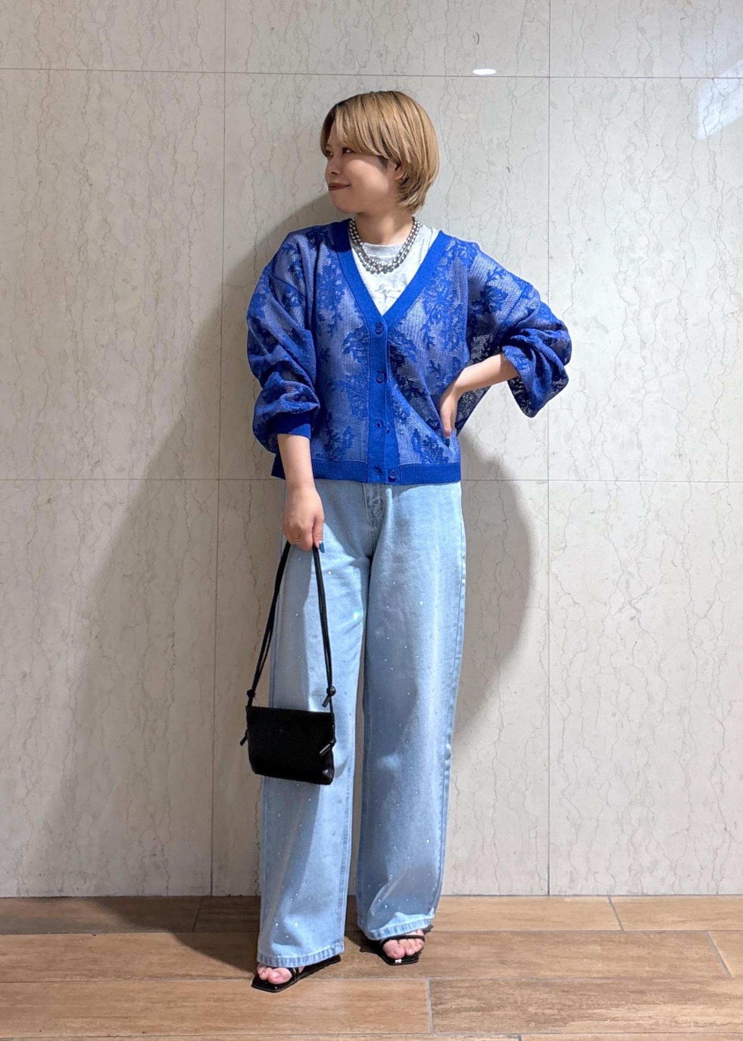 今回はブルーのカーディガンを主役にコーディネートを組みました。