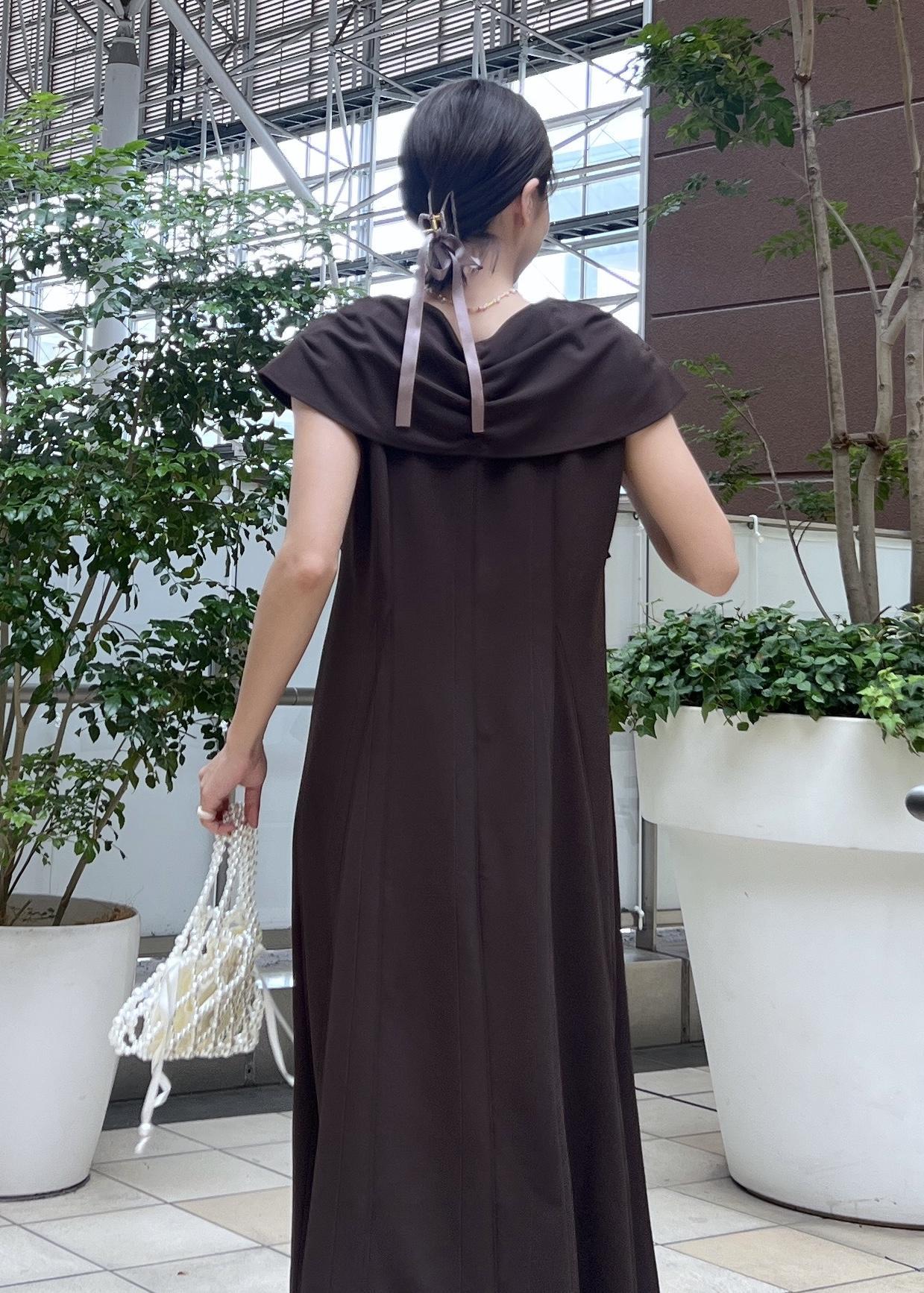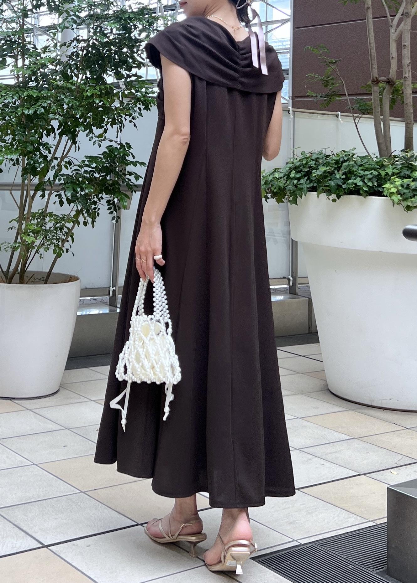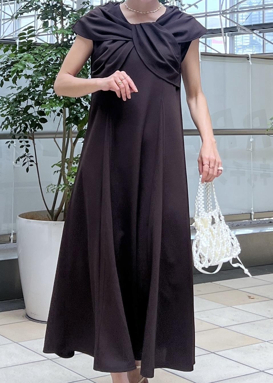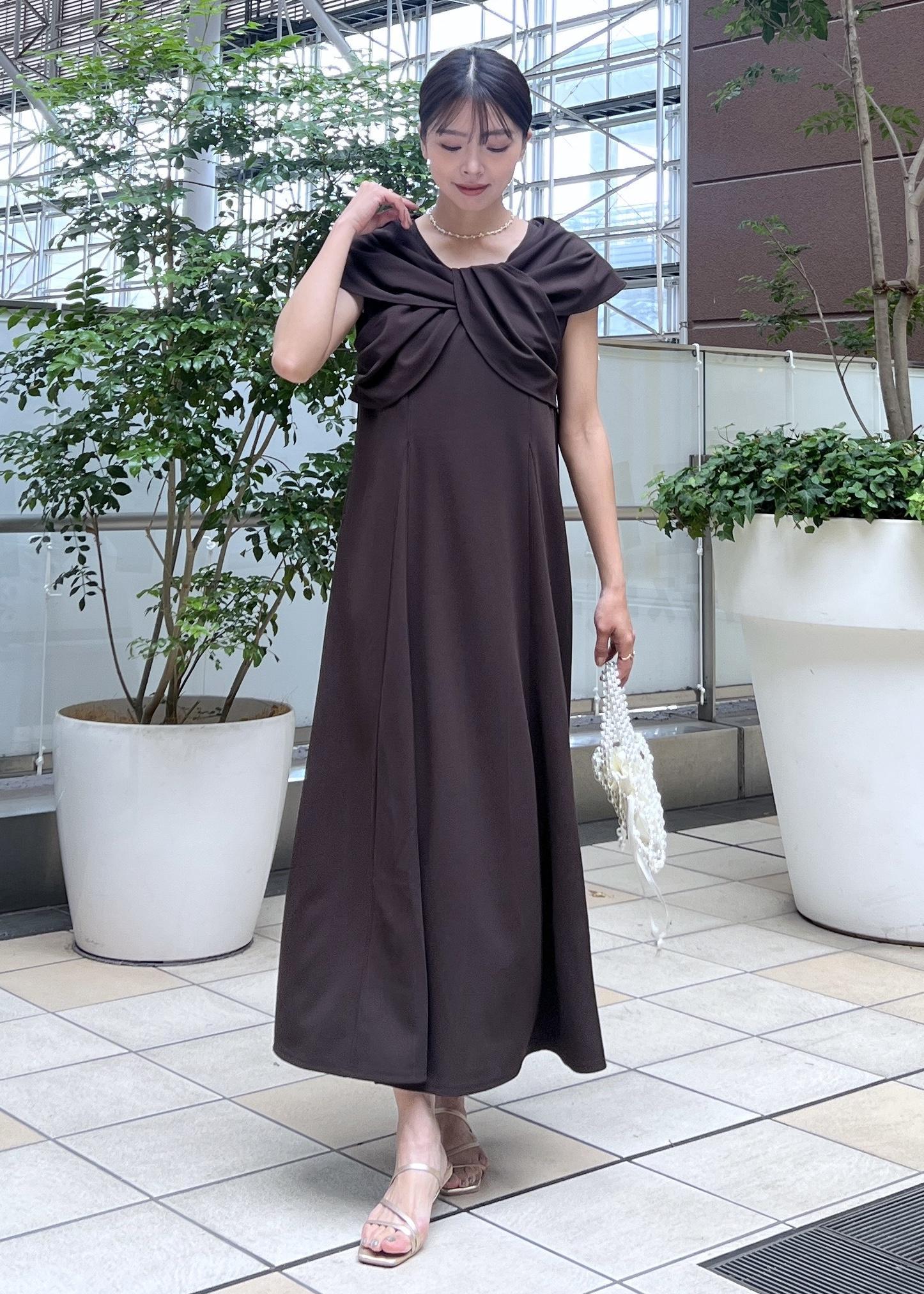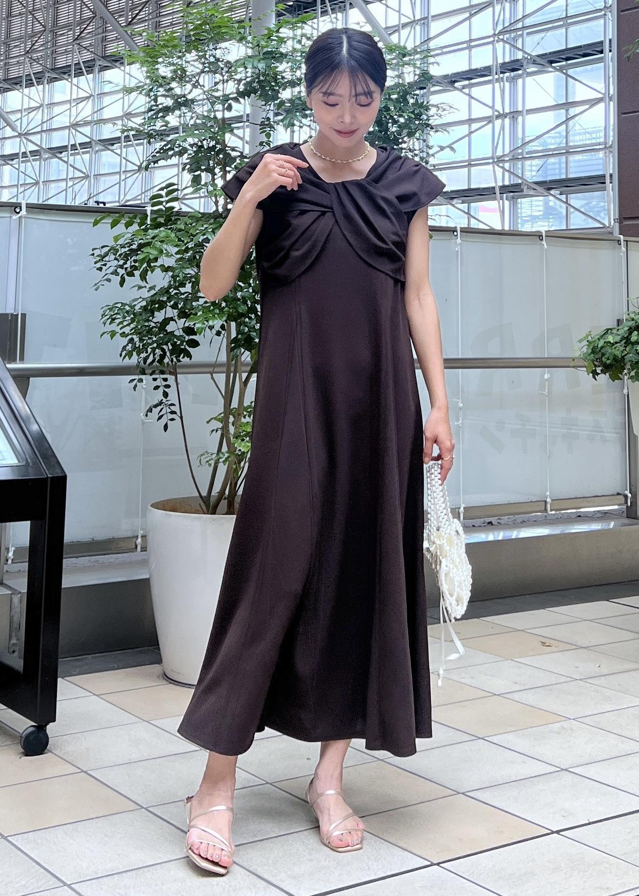肩周りのドレープデザインがポイントのワンピースは、お呼ばれやきれいめドレスにおすすめ。