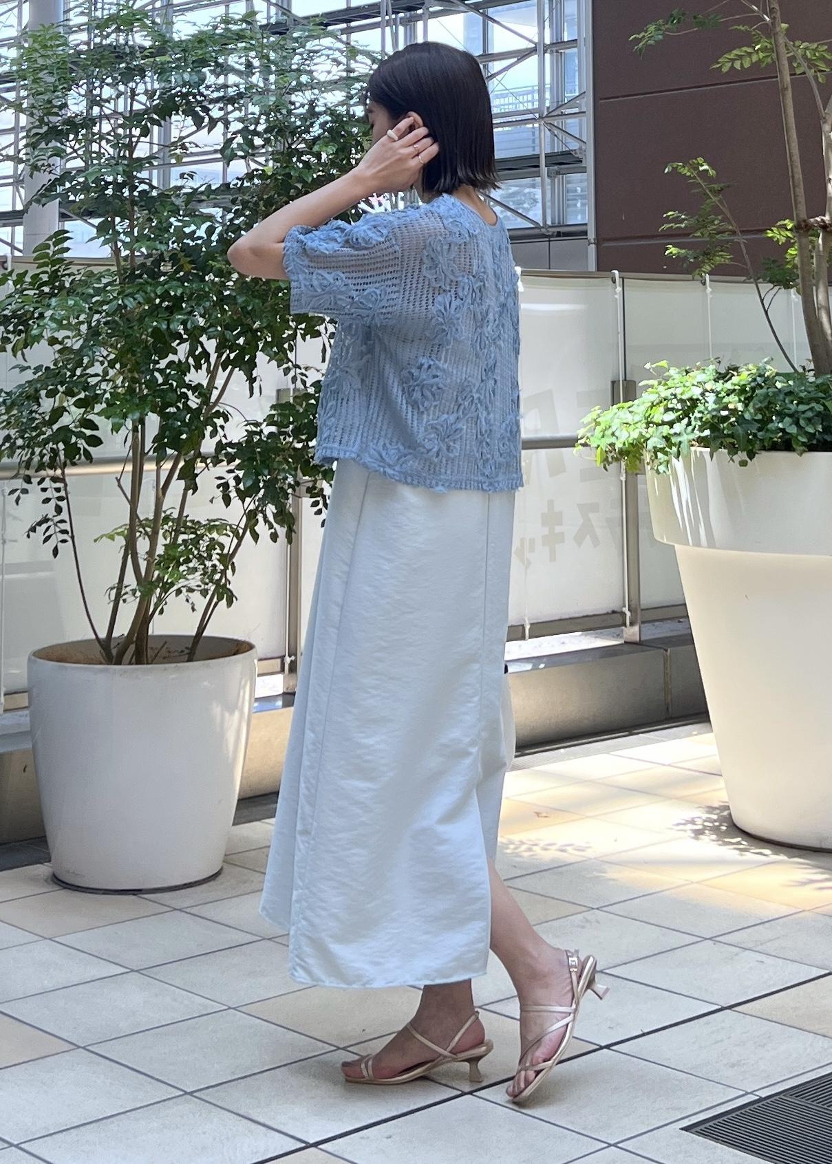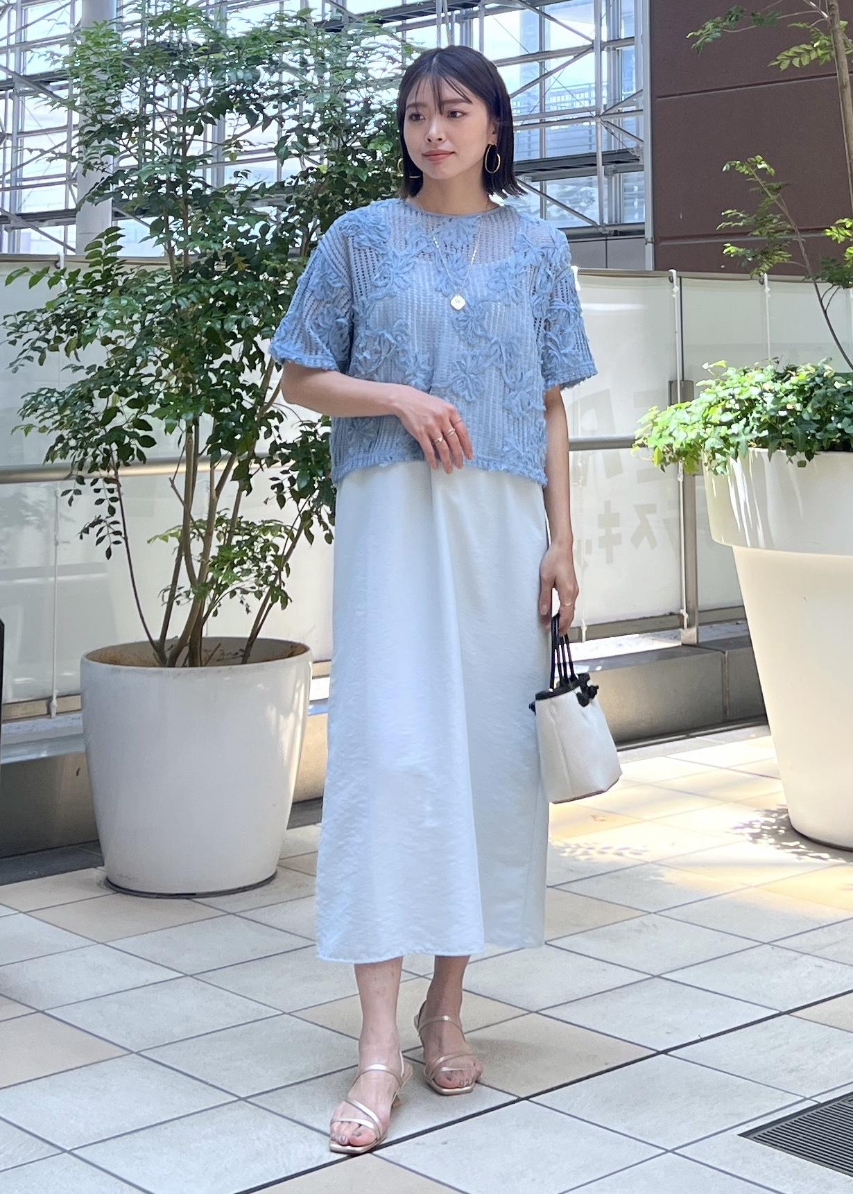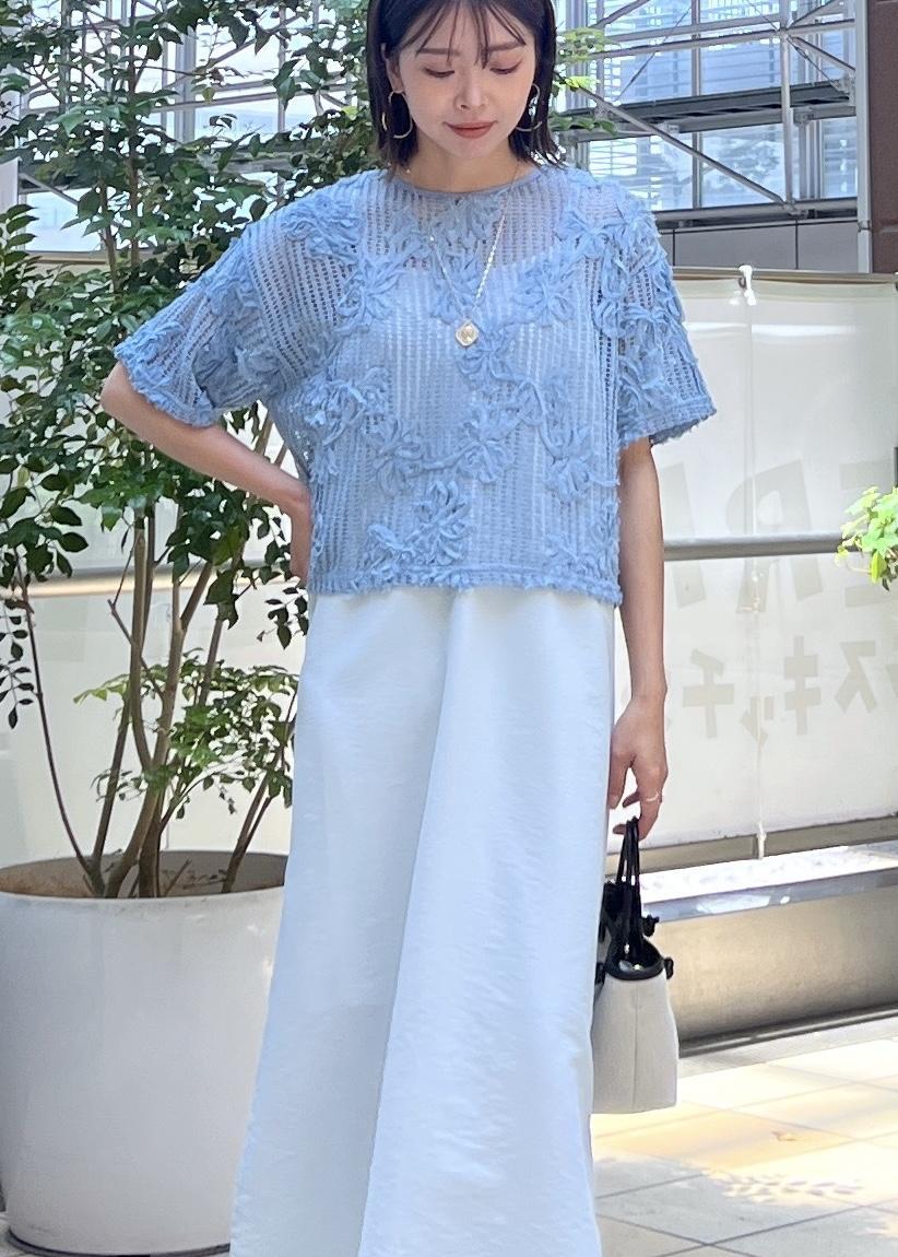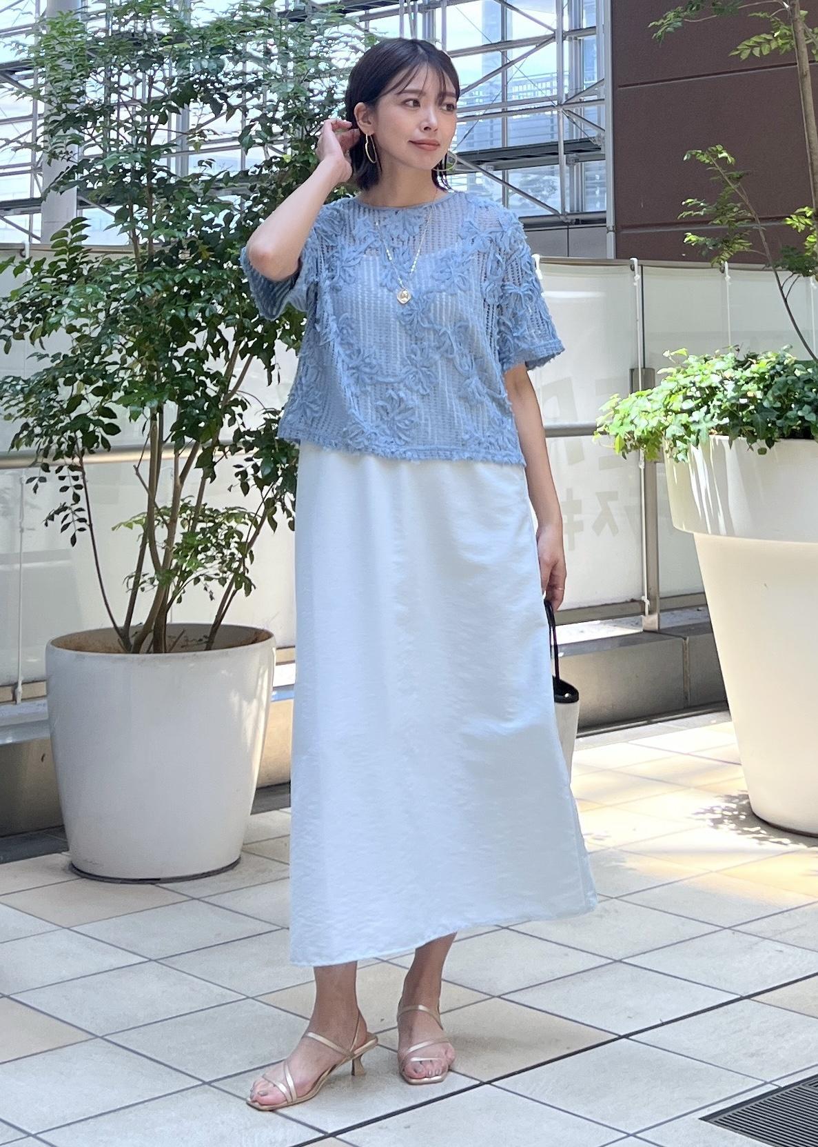 透け感のあるレーストップスは、身幅にゆとりがあるのでキャミワンピの上から重ねて着ても◎。