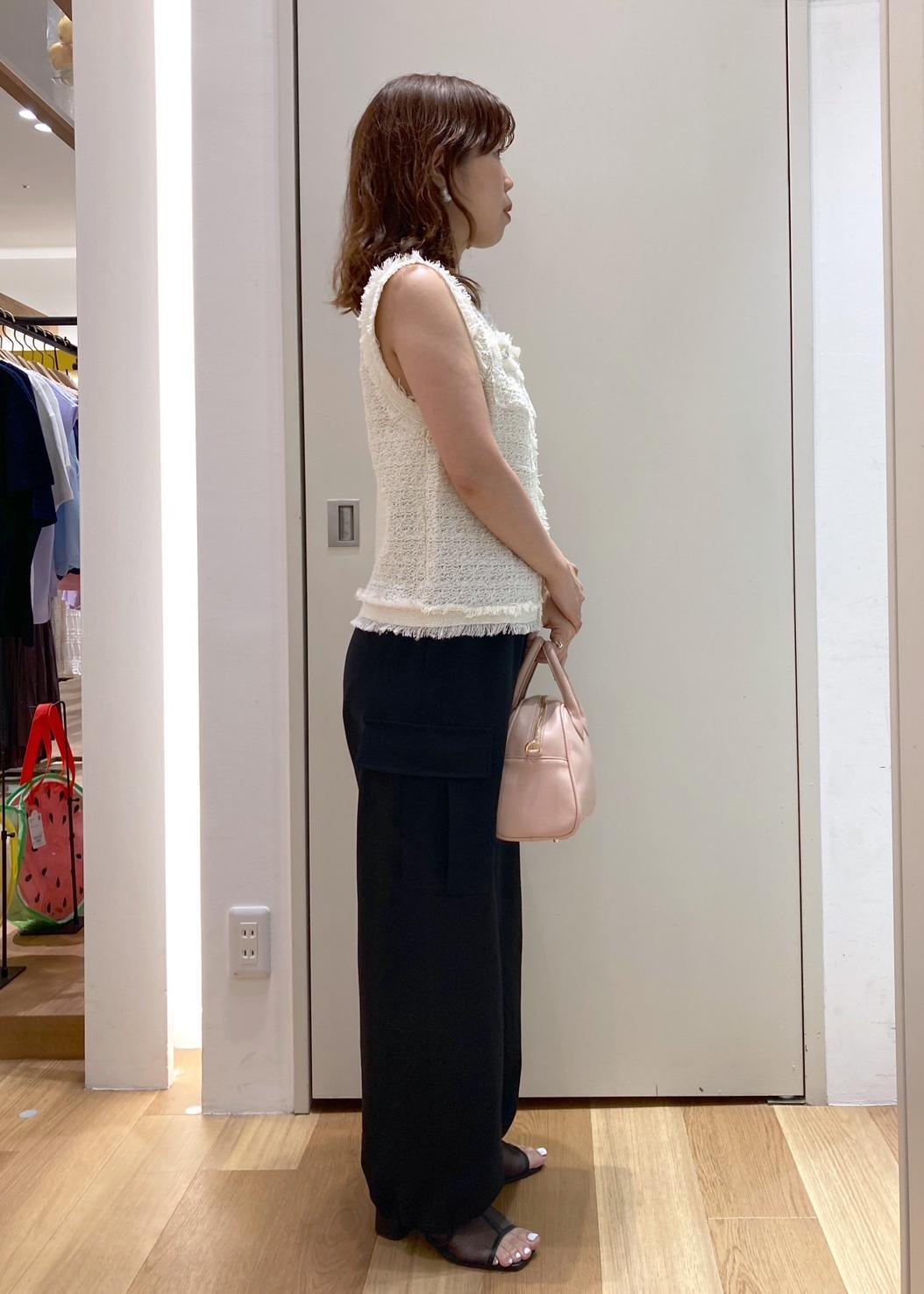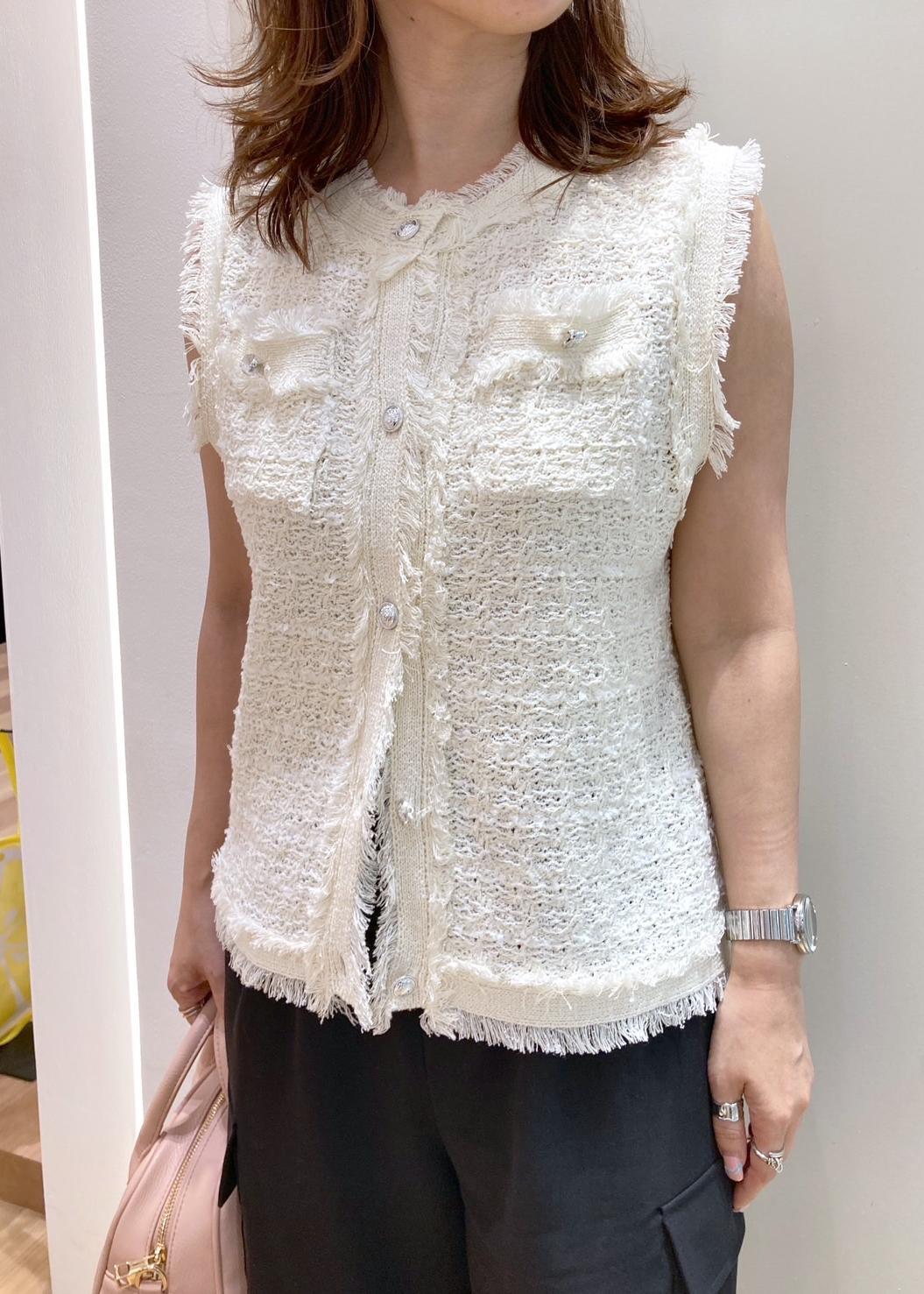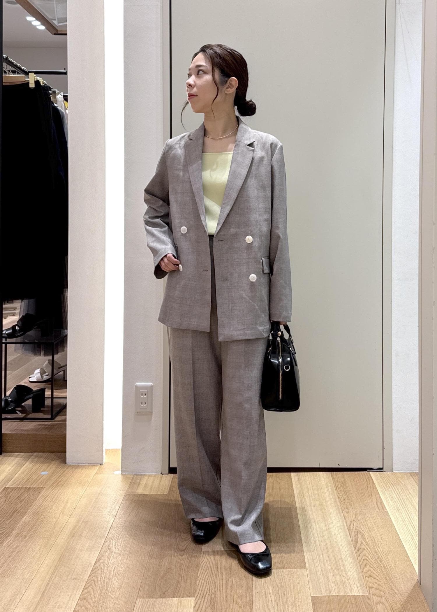 サマーツイードのジレに、カーゴパンツをモノトーンで合わせました。ジレは、38Tサイズだと腰が隠れるくらいの長さなので、下2つボタンを外して、抜け感がでるように着用しました。