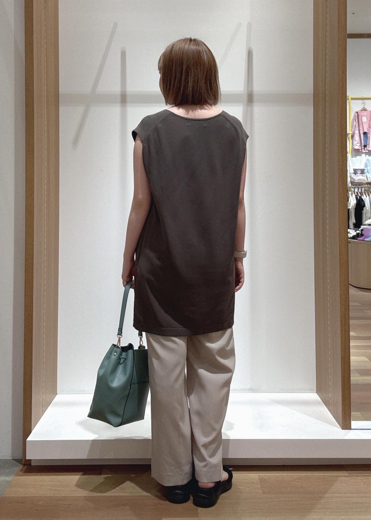 お尻が隠れる丈で体型カバーしつつ、落ち感のある素材と深いVネックがすっきり見せてくれます。 -